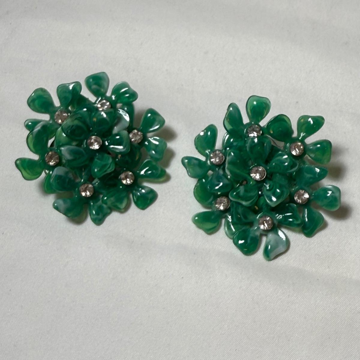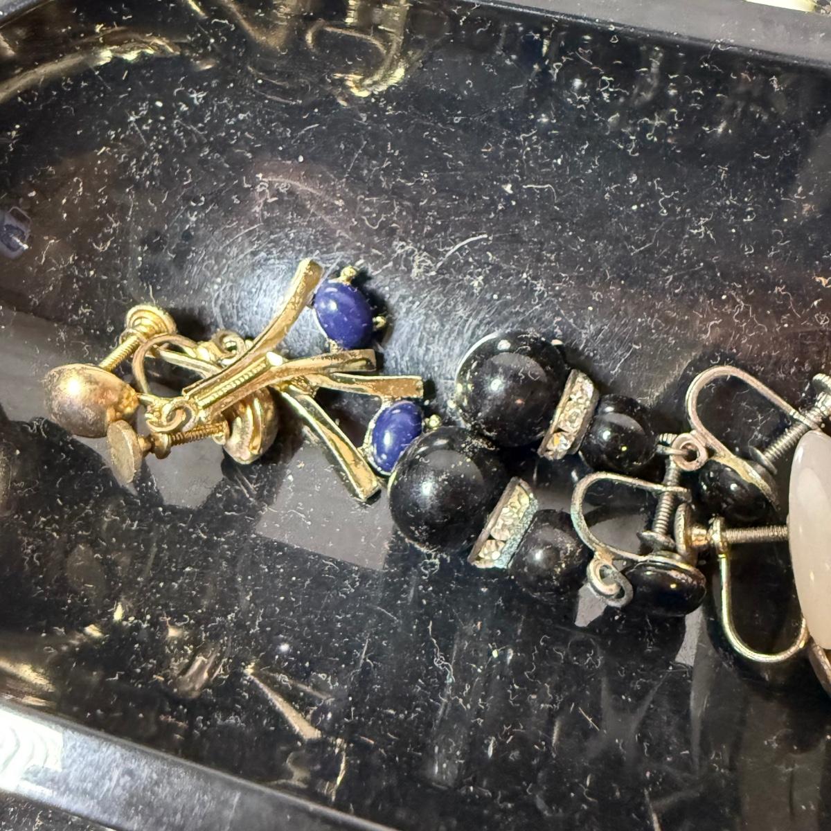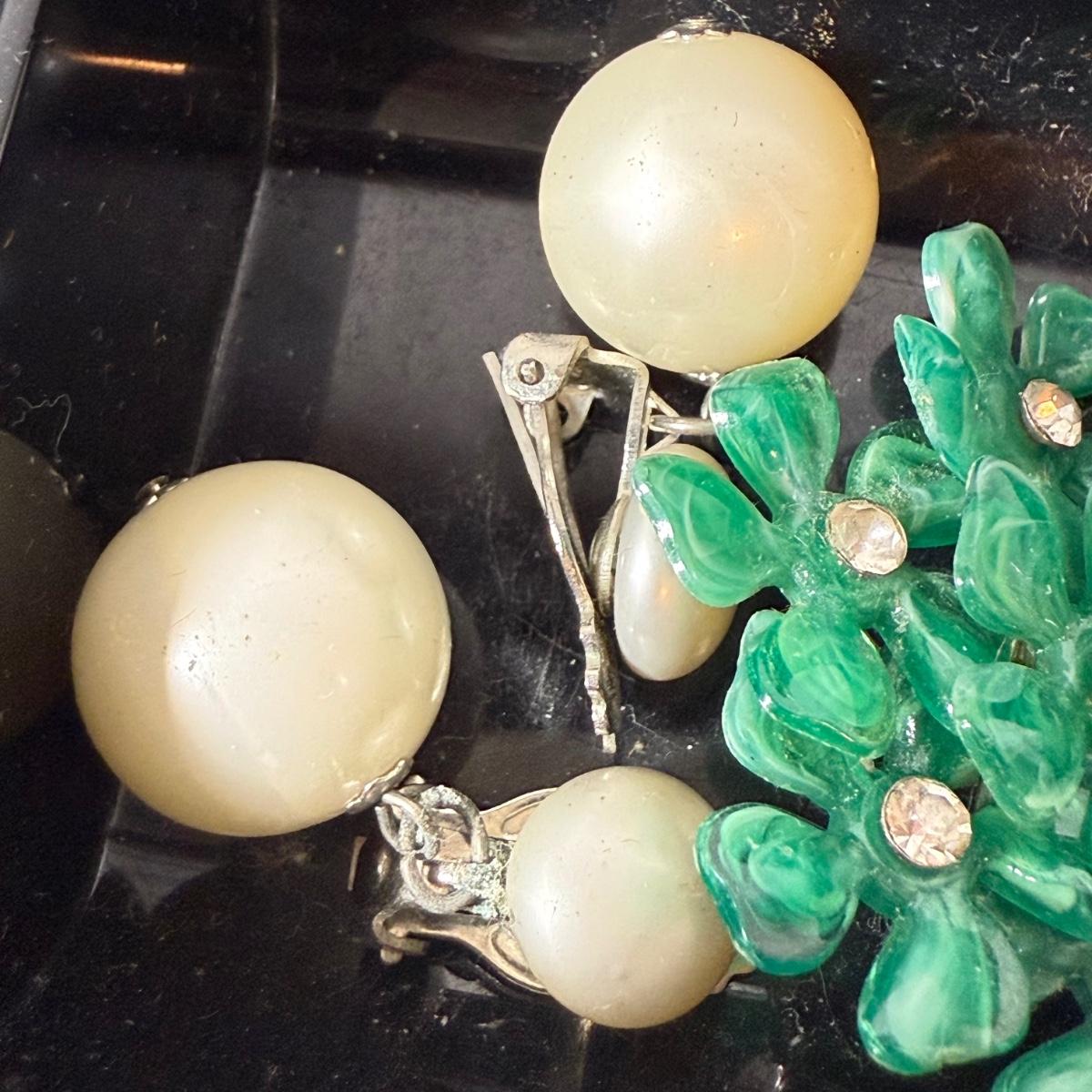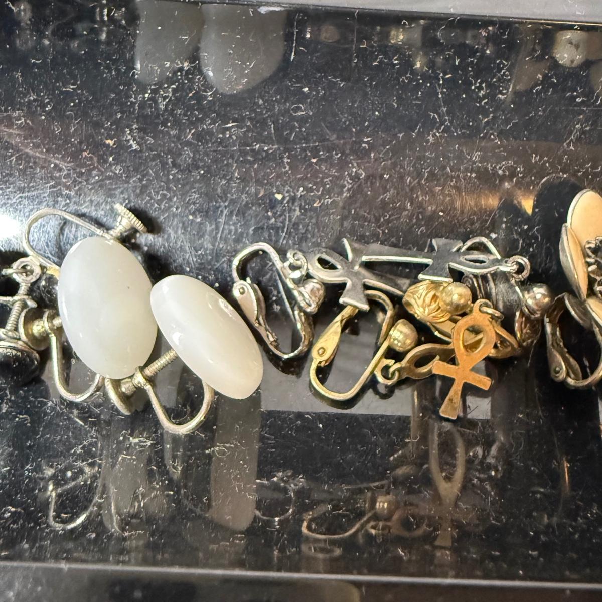 50+ pairs of earrings for non-pierced ears, with clip-on style of screw backs. There is a big variety of shapes, colors, and sizes. One pair comes with many colors of changeable discs. All earrings were checked for hallmarks, all found marks were photographed. The largest earrings are the pair with multiple green flowers with clear gemstones; these are approximately 1.75“D. 13.5” x 9.25” plastic organizing tray is included as well.