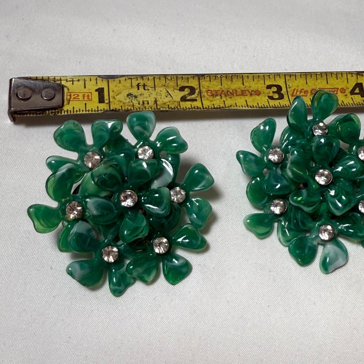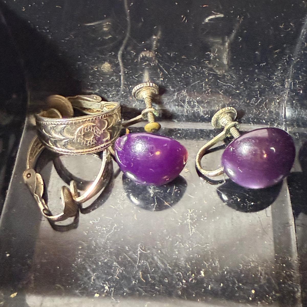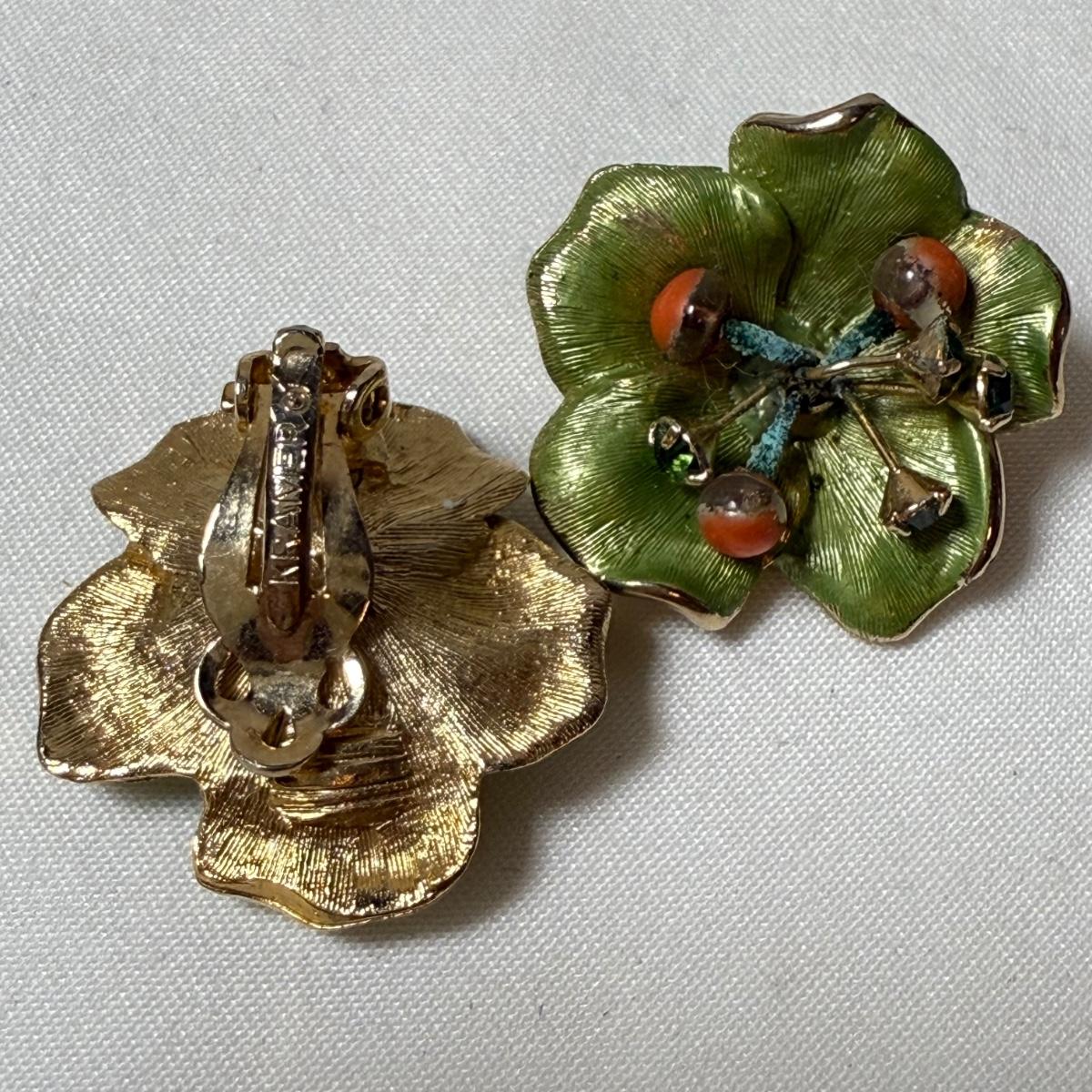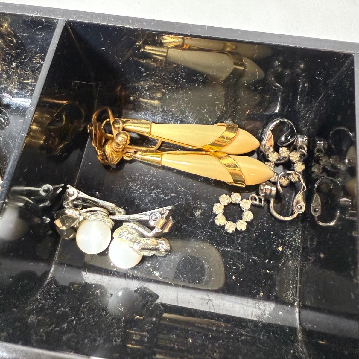 50+ pairs of earrings for non-pierced ears, with clip-on style of screw backs. There is a big variety of shapes, colors, and sizes. One pair comes with many colors of changeable discs. All earrings were checked for hallmarks, all found marks were photographed. The largest earrings are the pair with multiple green flowers with clear gemstones; these are approximately 1.75“D. 13.5” x 9.25” plastic organizing tray is included as well.