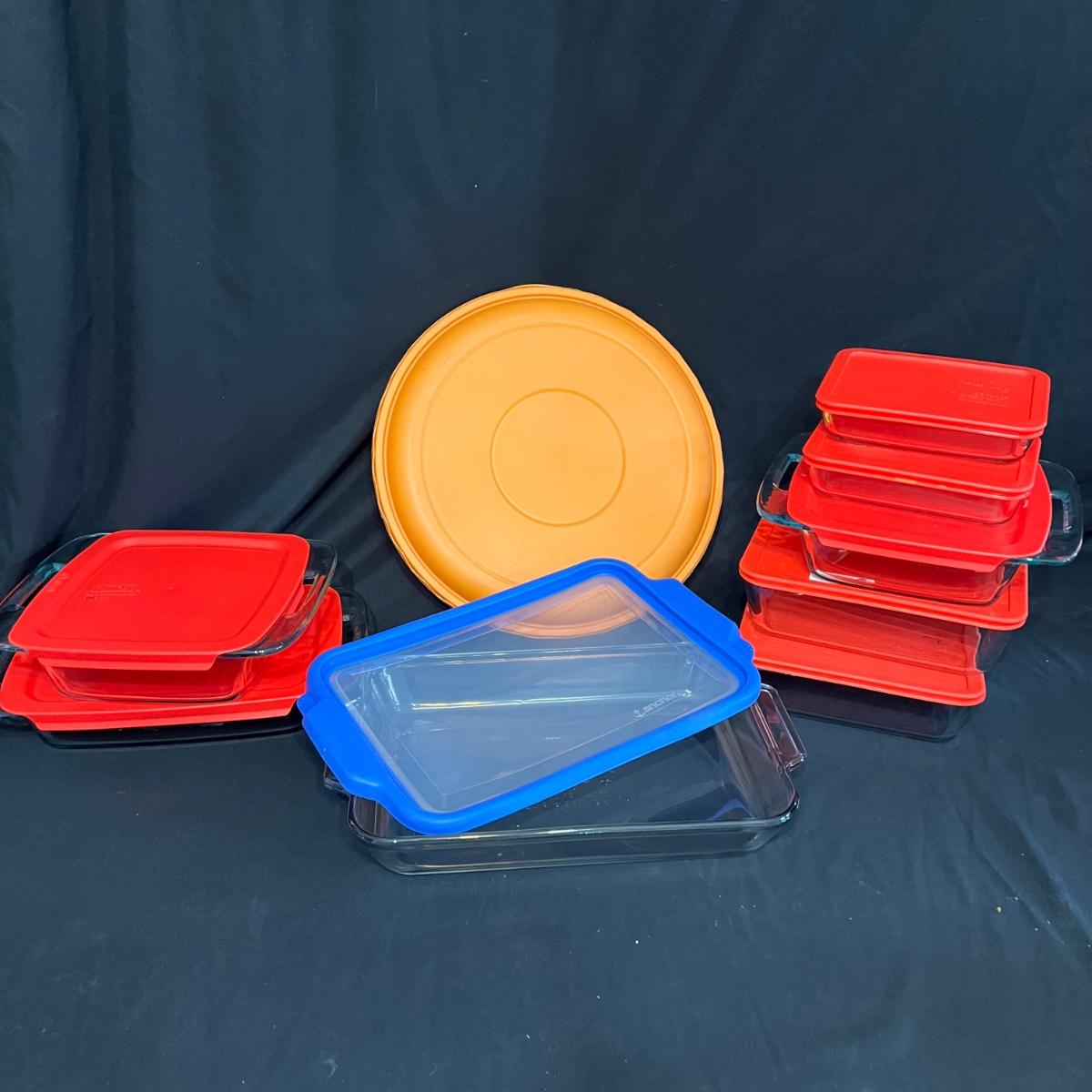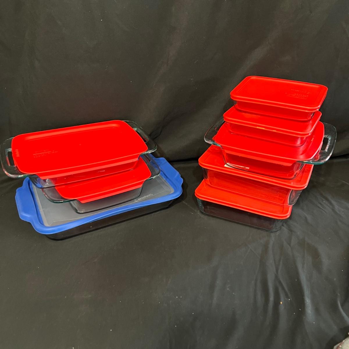 Lot includes eight glass Pyrex baking dishes with storage lids. Plus one multi sectional plastic picnic/covered storage dish. The covered Pyrex containers include two 3 cup, one 6 cup, one 11 cup, three 2 QT and one Anchor 3 QT.