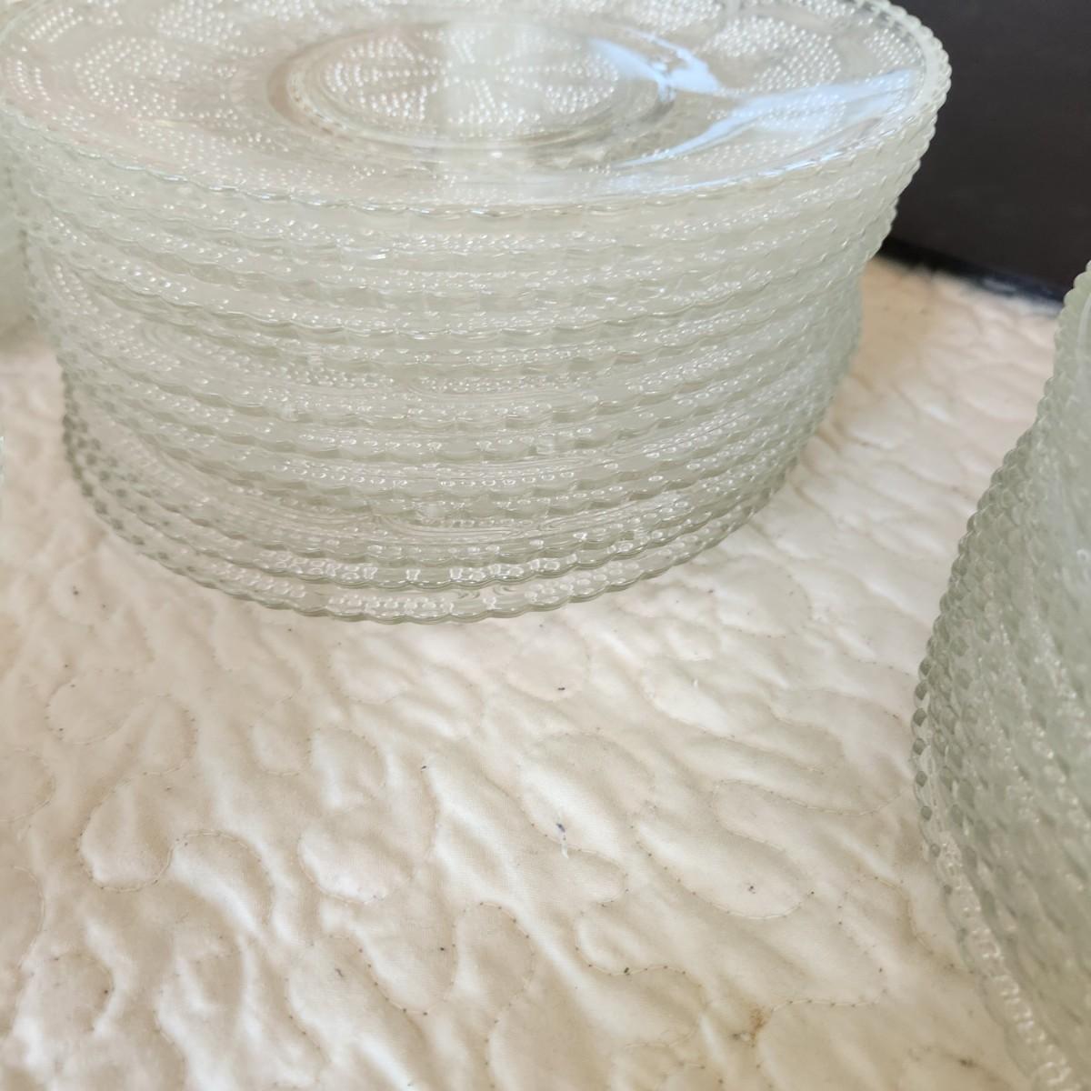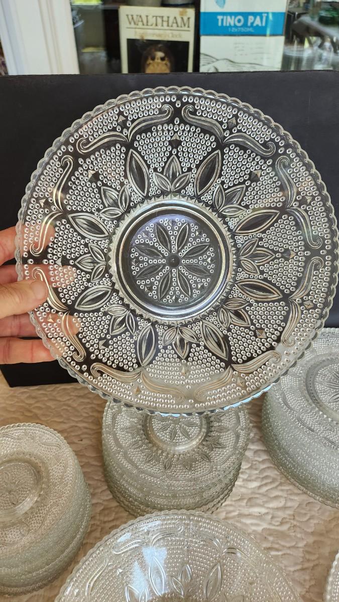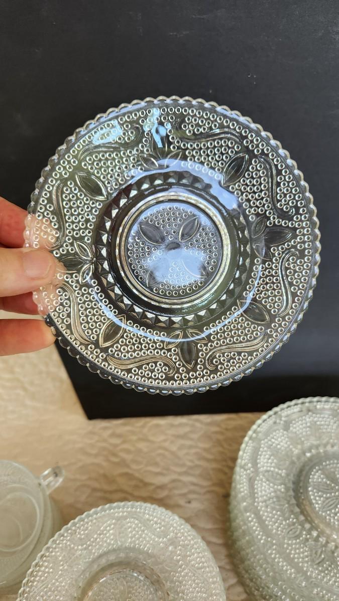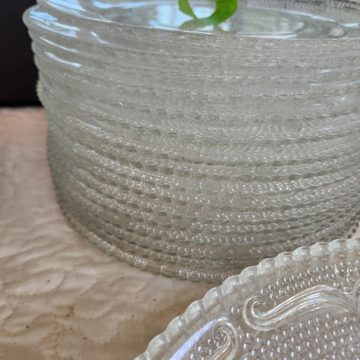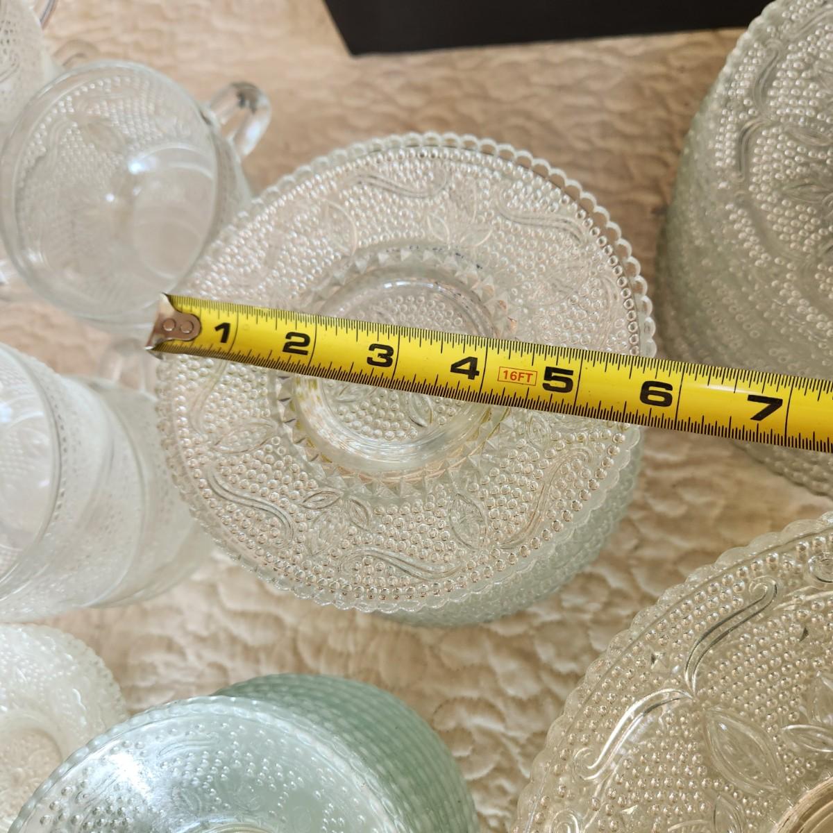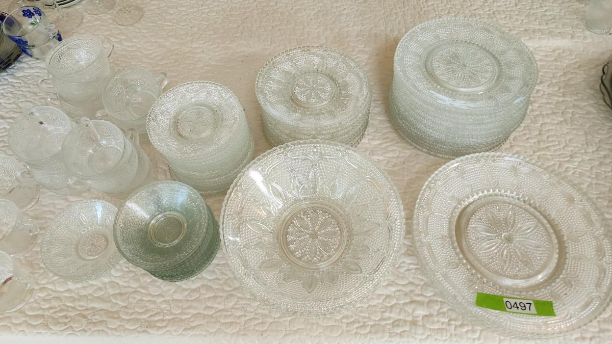 Large Collection of Depression Glass Daisy Plates, Cup, Saucer Bowls