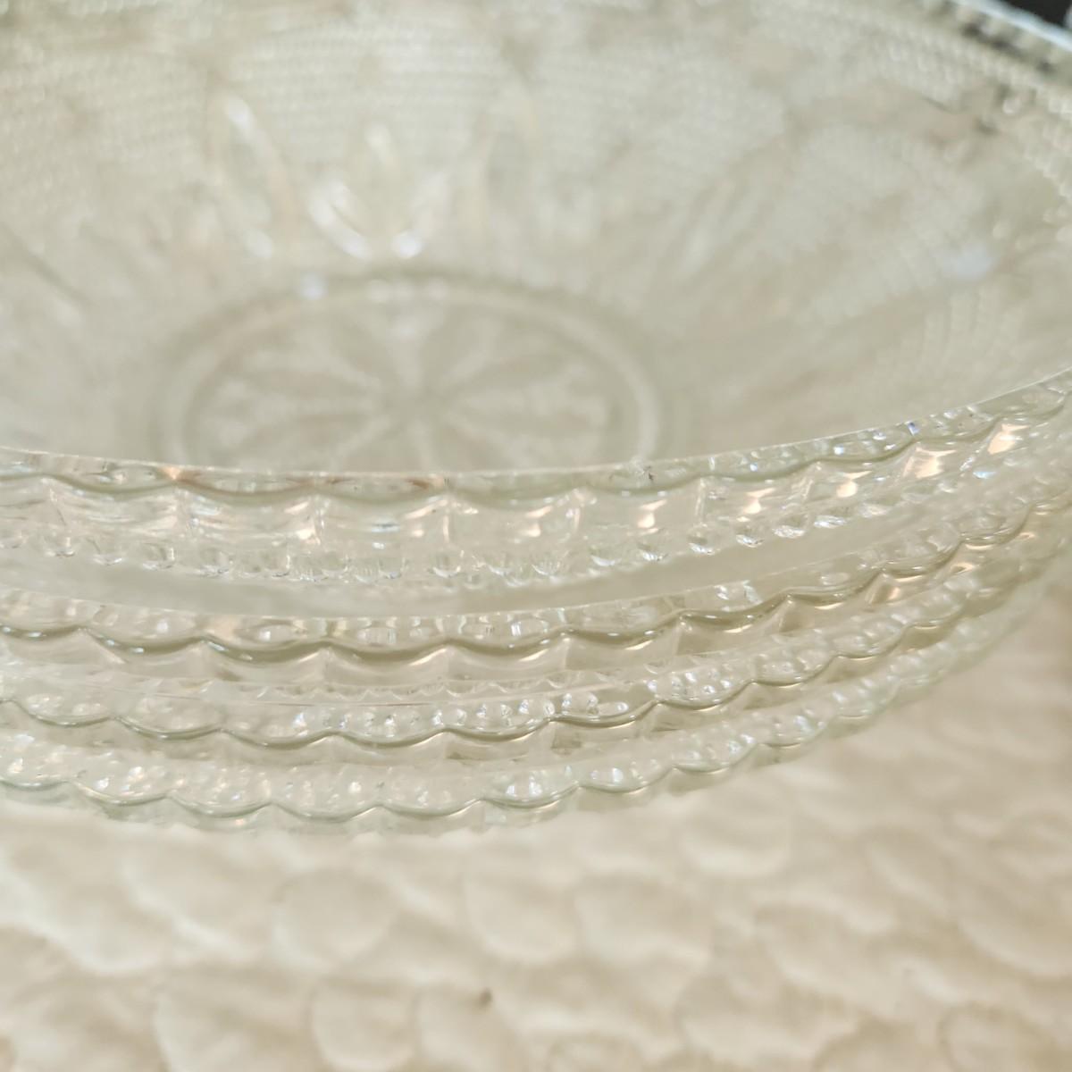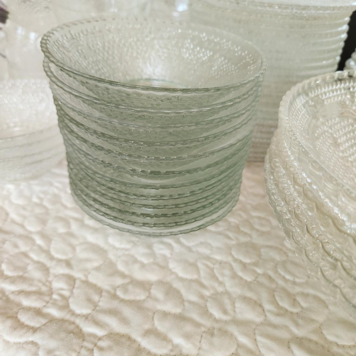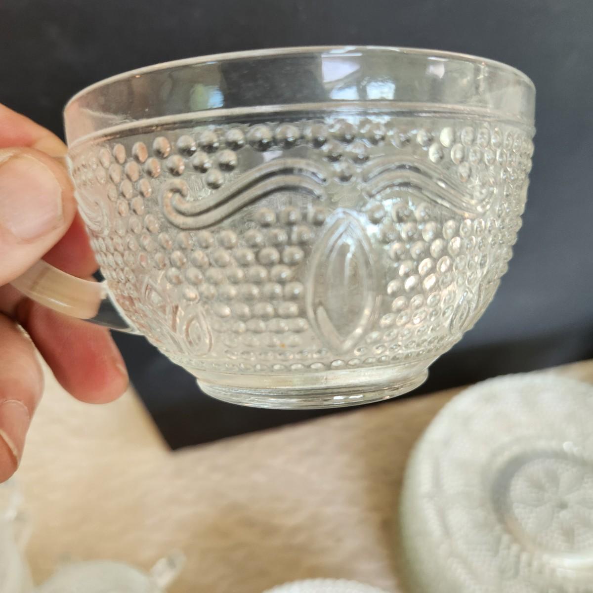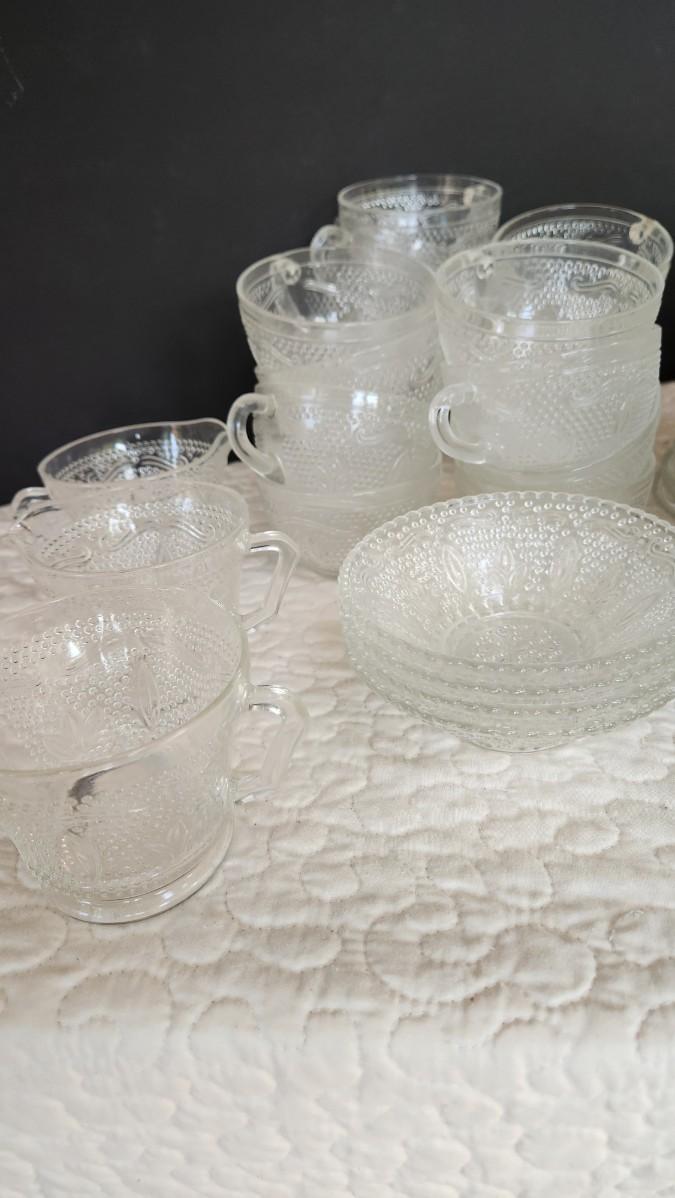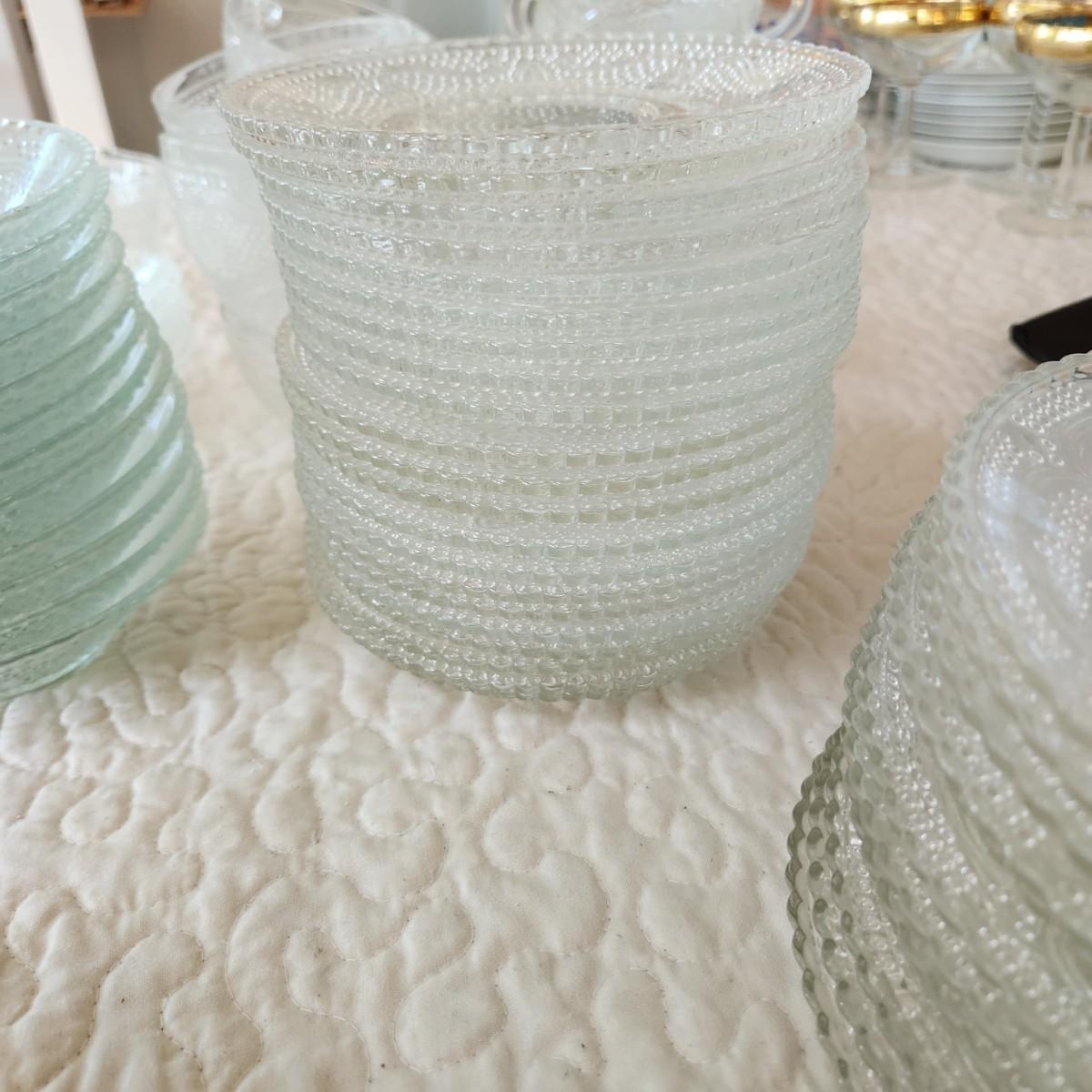 Large Collection of Depression Glass Daisy Plates, Cup, Saucer Bowls