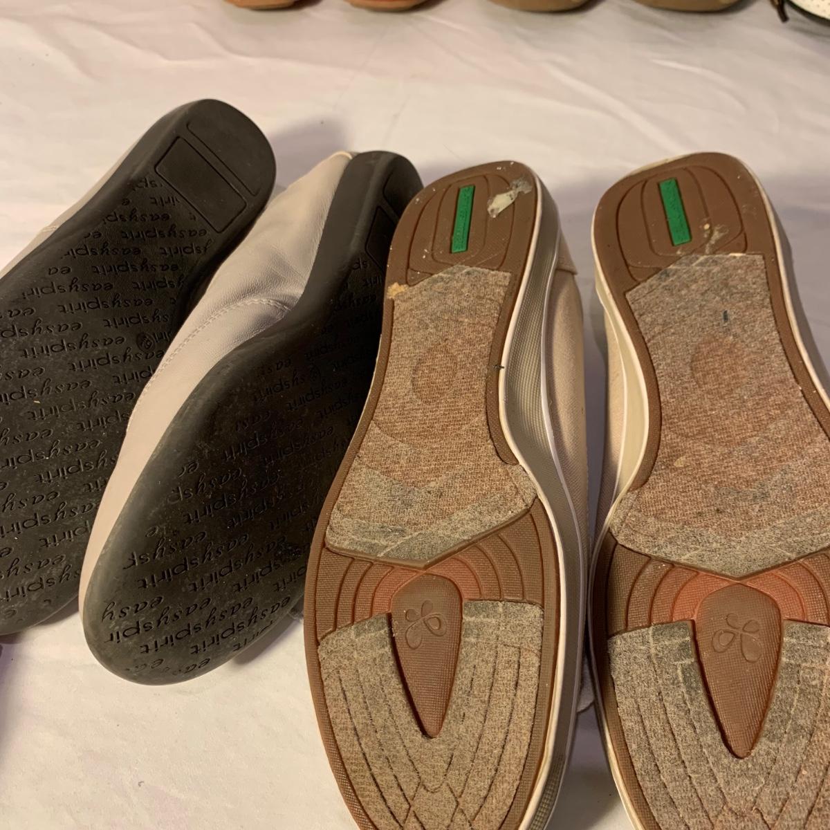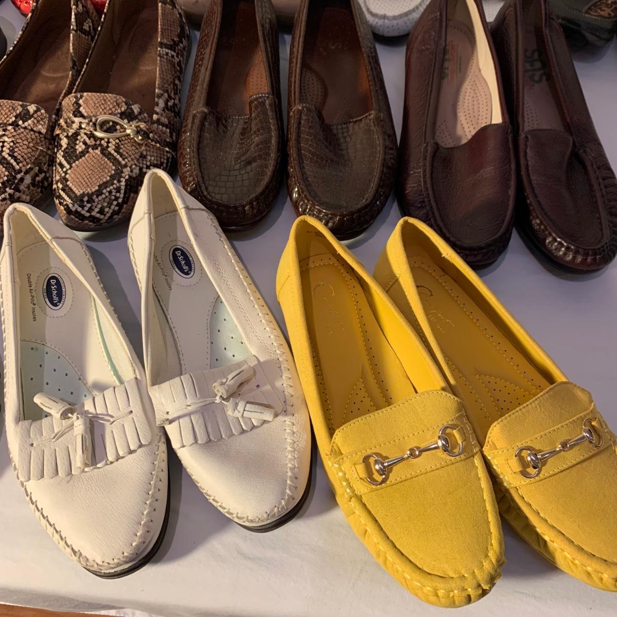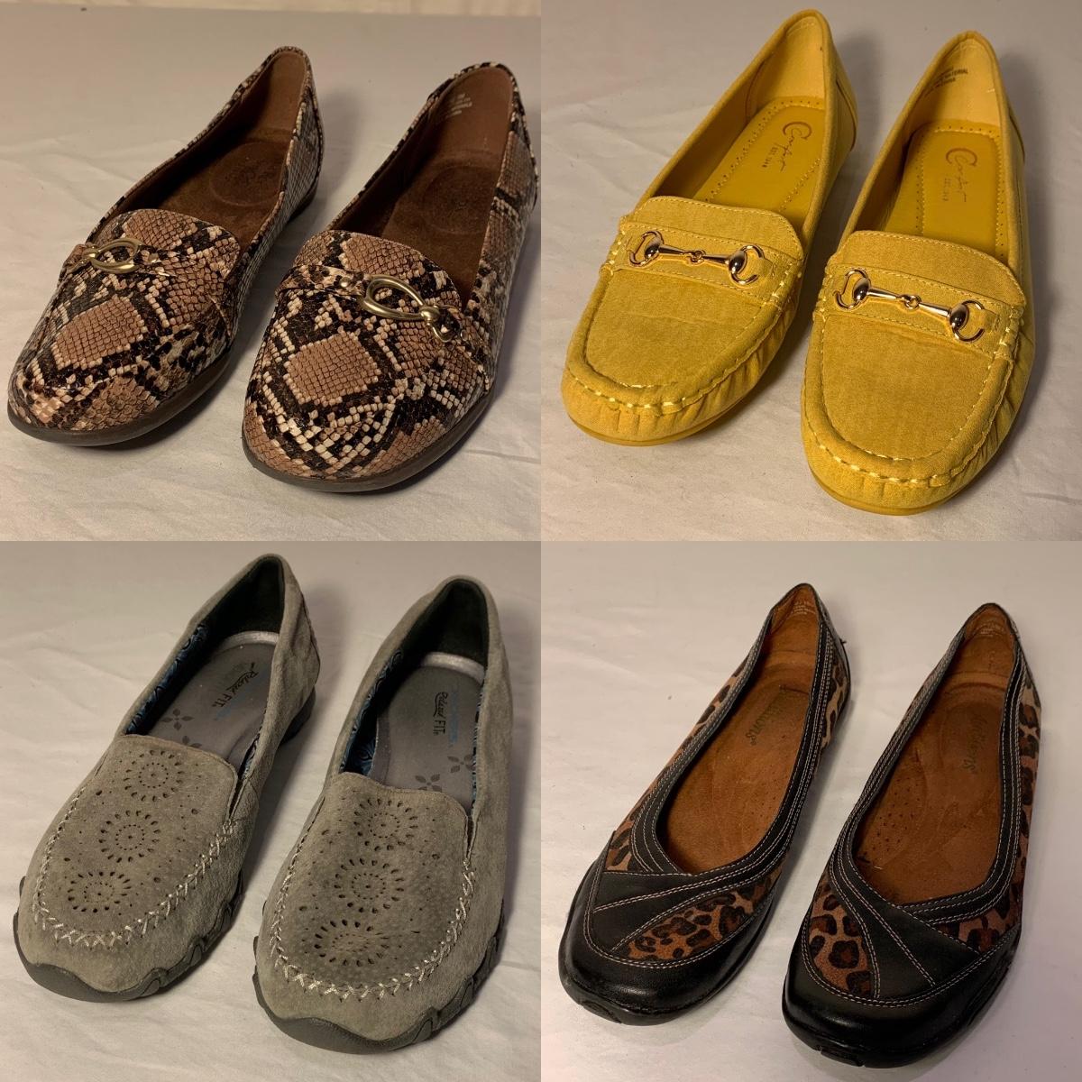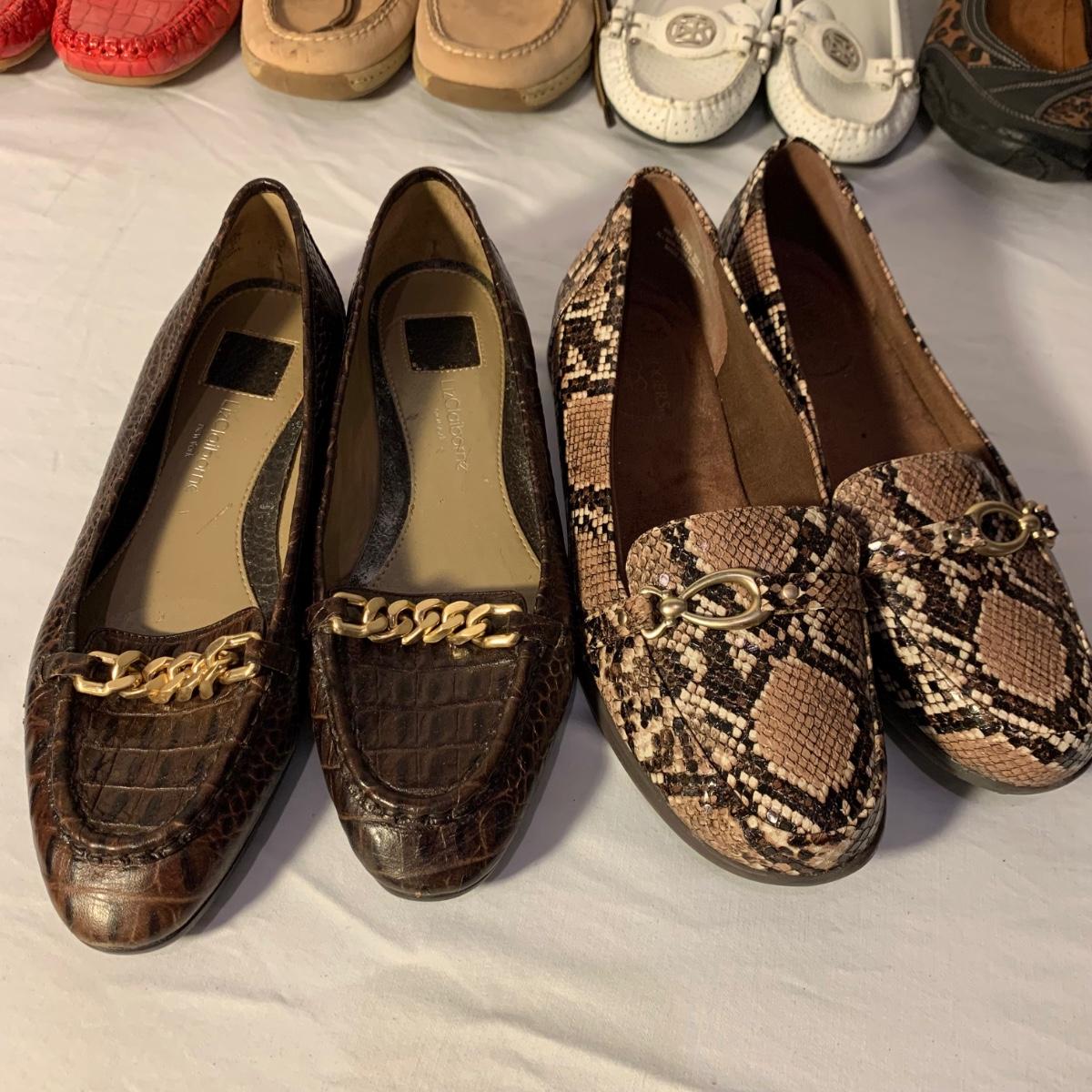 A collection of 17 flats and loafers. Shoes range mostly from women’s size 7-9. Most show some wear. Brands include Dr. Scholls, Easy Spirit, Skechers, L.L. Bean and more. See photos for inventory, sizes, and details.