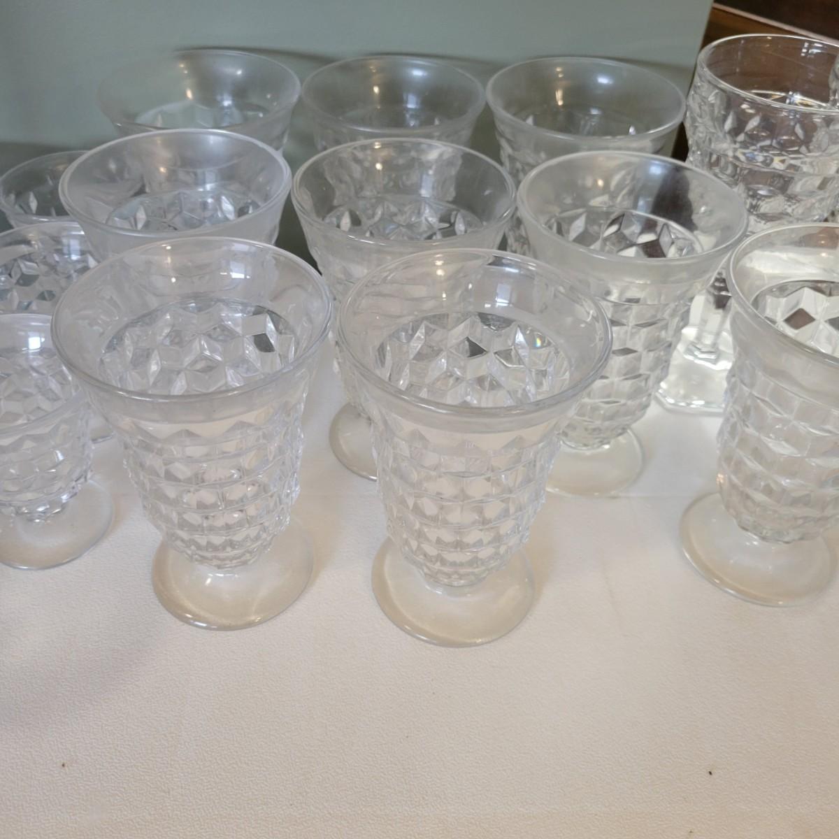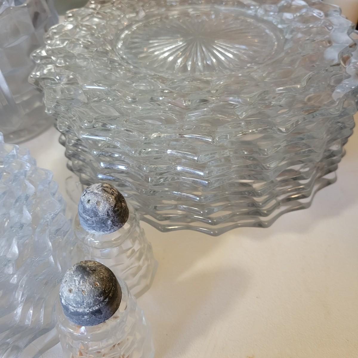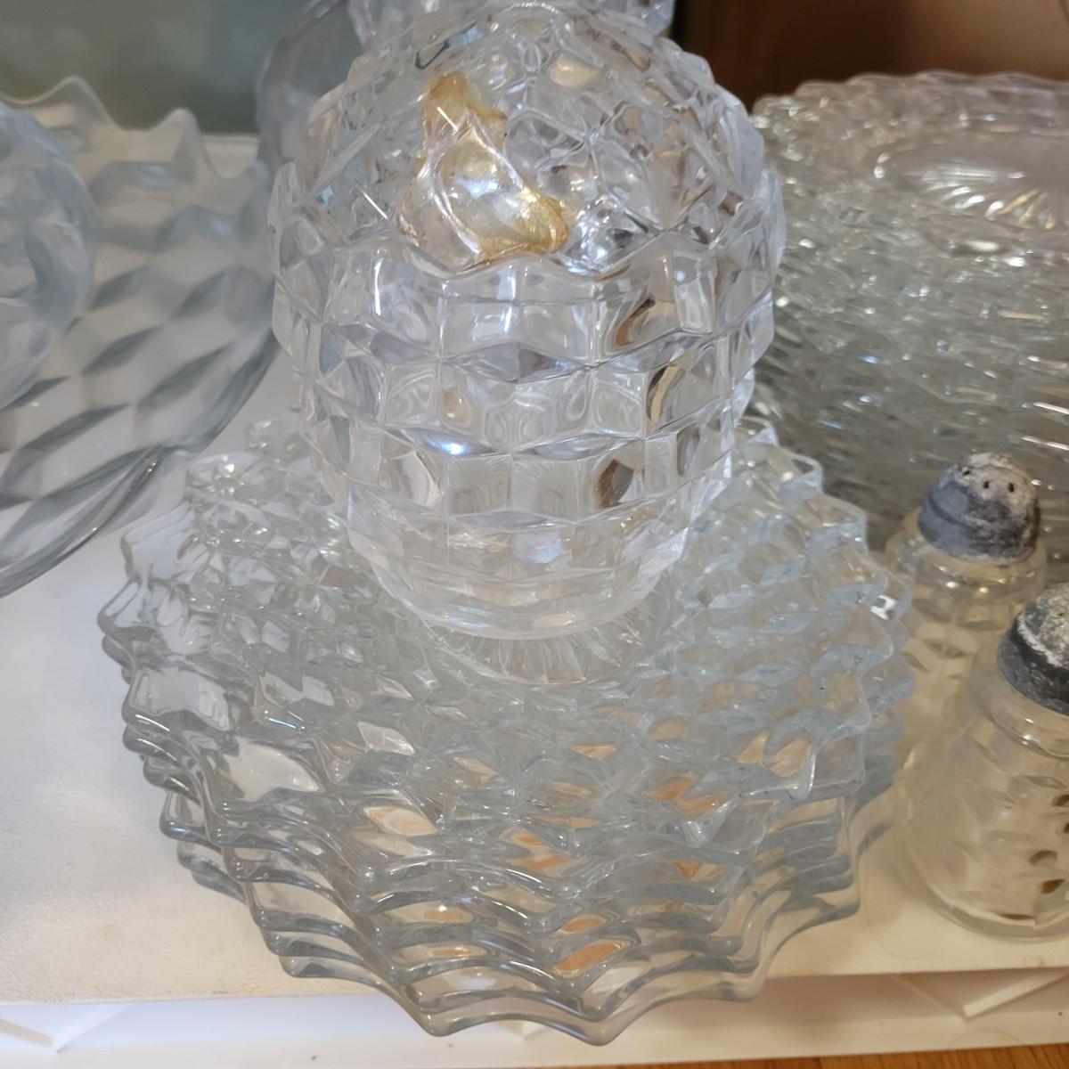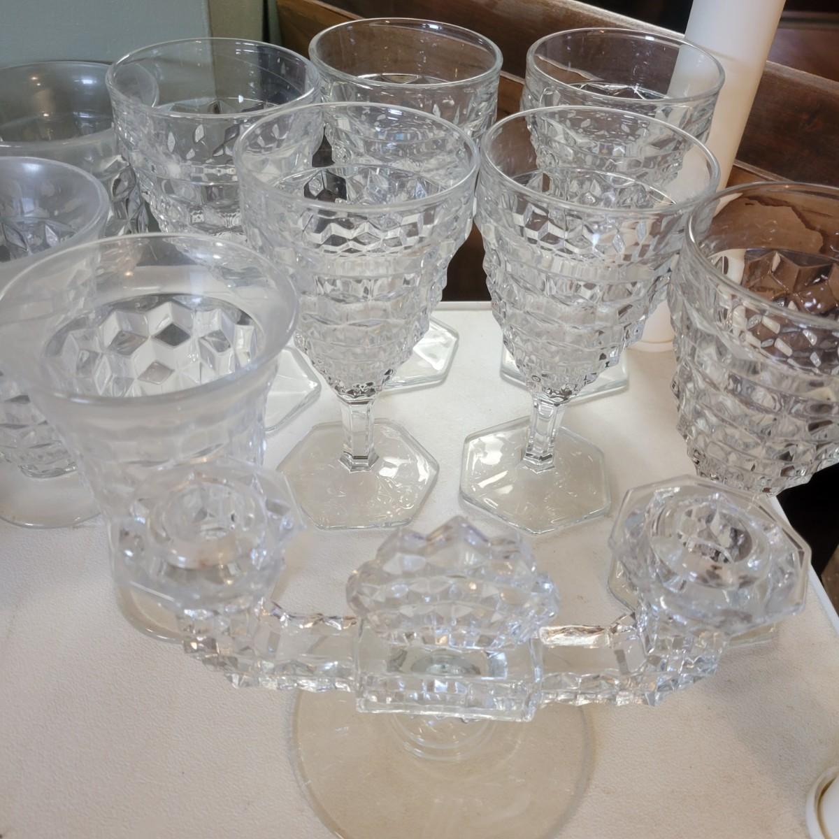 A large collection of Fostoria glass pieces in good condition with no notable damage. One piece does have a residue of some sort on it. This collection has glasses in multiple sizes, plates, pedestal platters and more. See attached pictures for entire inventory. Largest platter measures approximately 16.5" x 4" Local pickup only