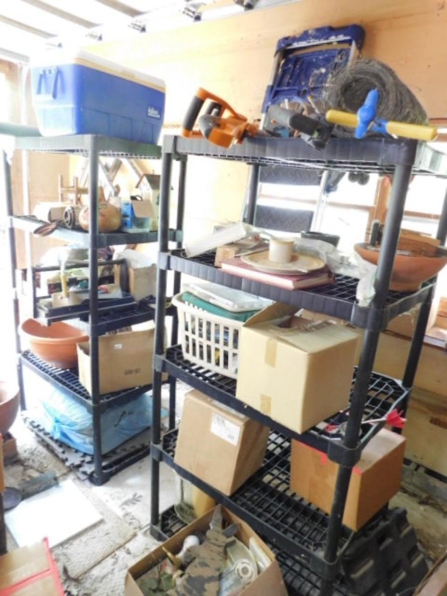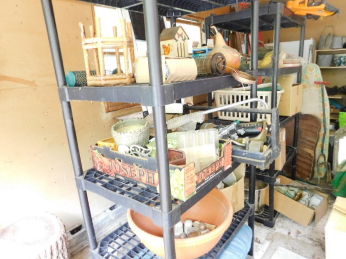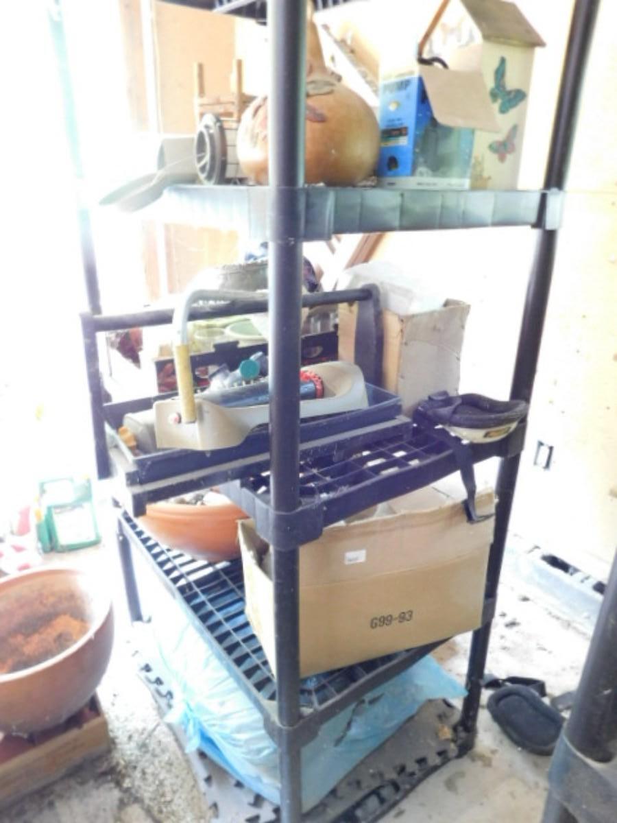Large Collection of Garden and Outdoor Related Items and Two Shelves (Does not include ladder) All items on shelves including shelves. No ladder or items pictured on floor beside shelves. Must take all.