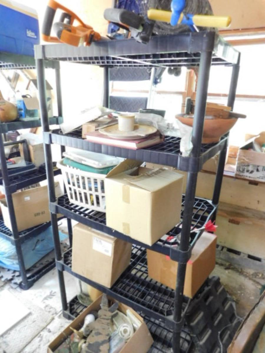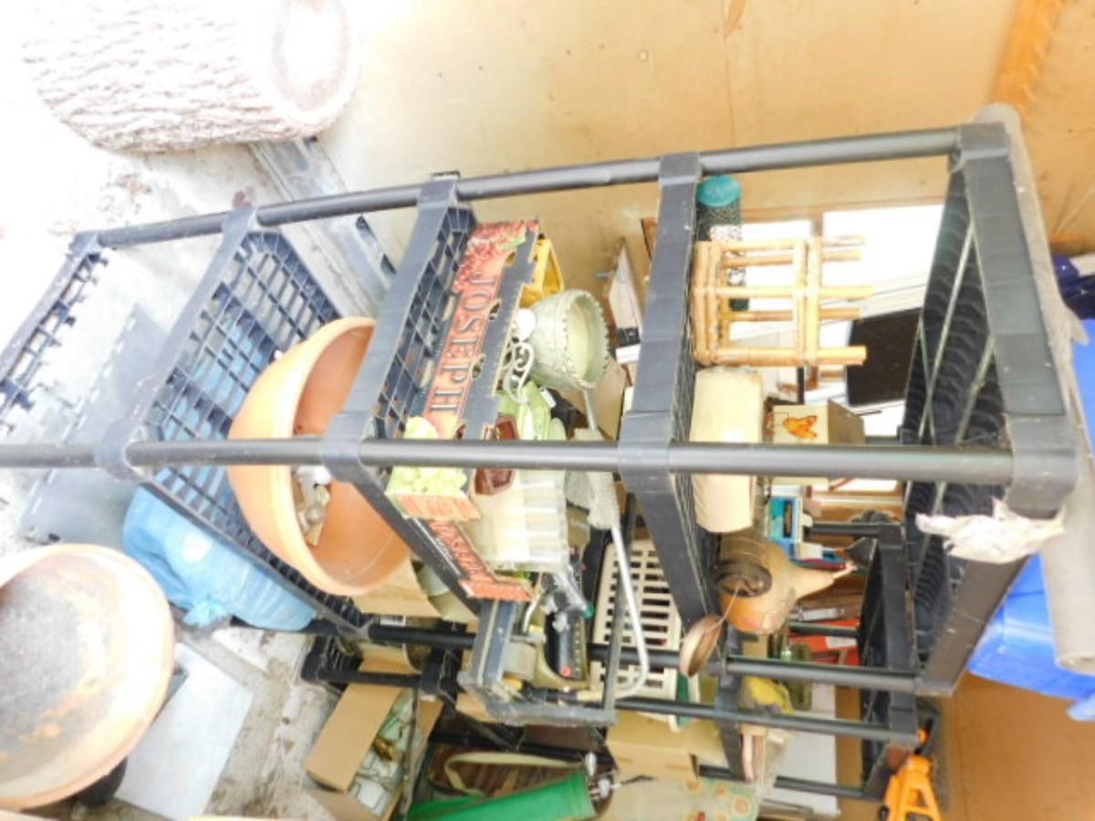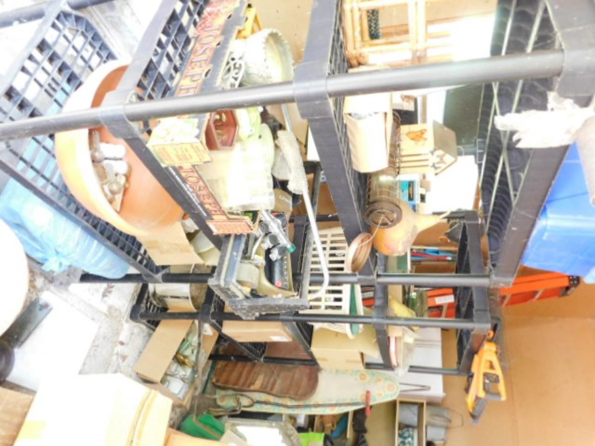 Large Collection of Garden and Outdoor Related Items and Two Shelves (Does not include ladder) All items on shelves including shelves. No ladder or items pictured on floor beside shelves. Must take all.