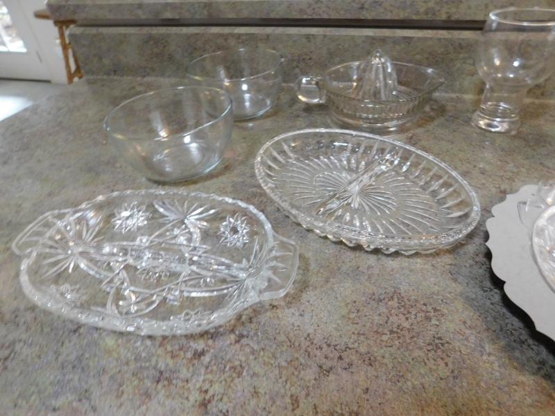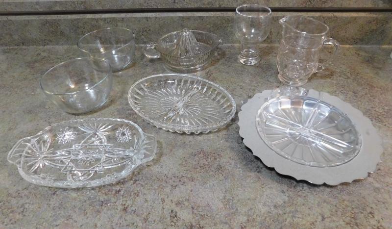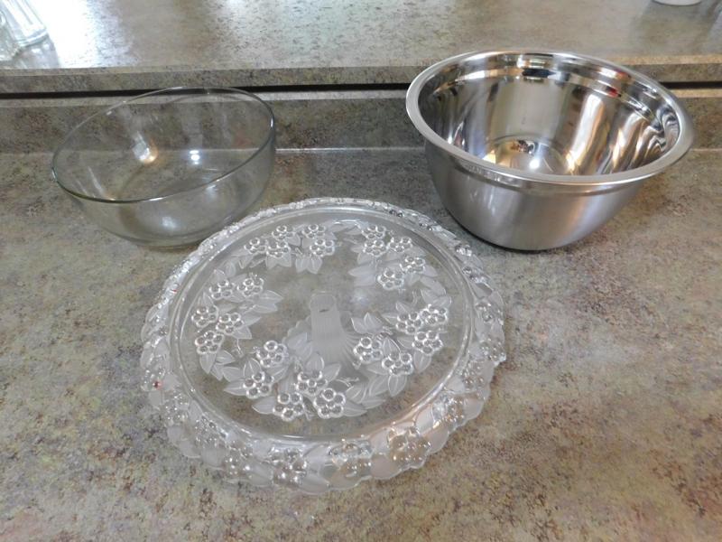 Large Collection of Glass Serving Platter, Plates, and Wares includes cake plate, juicer, stainless mixing bowl and more
