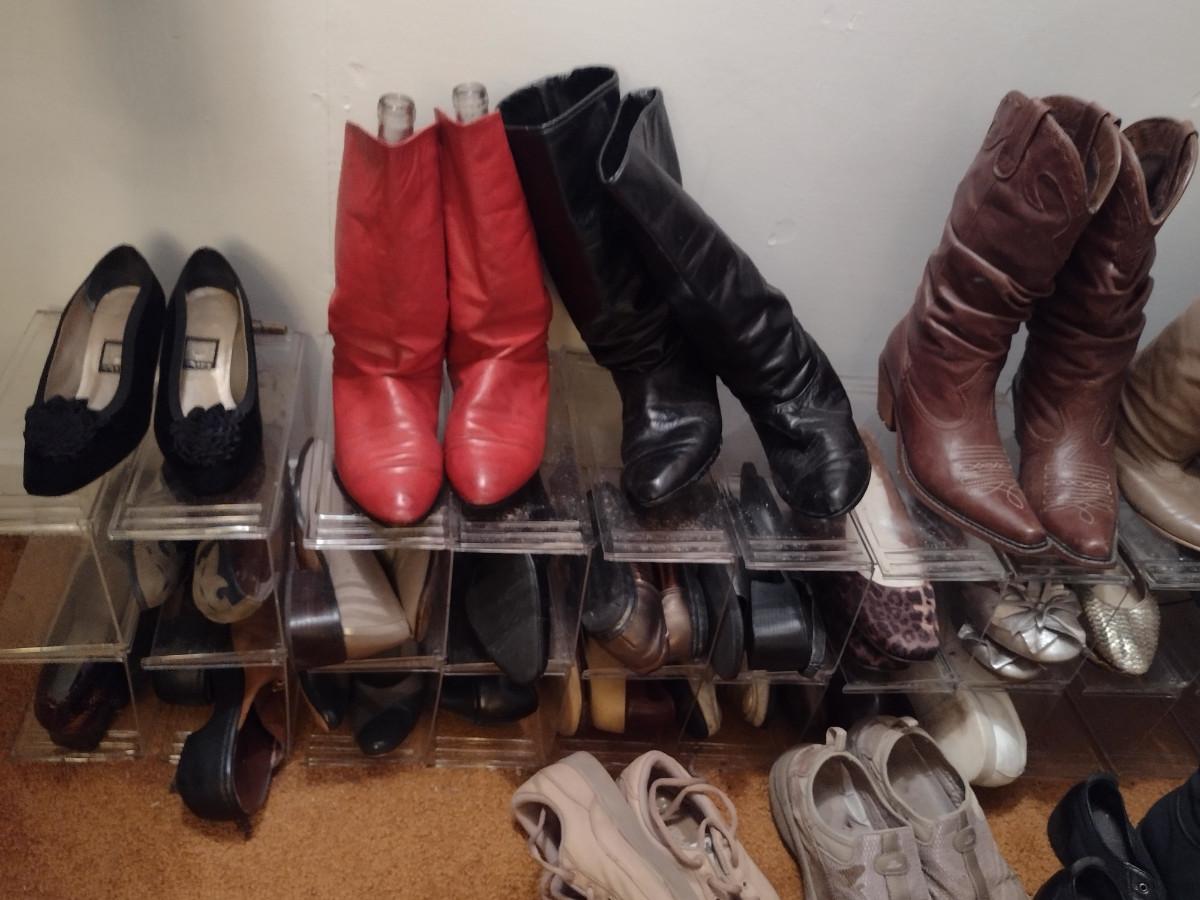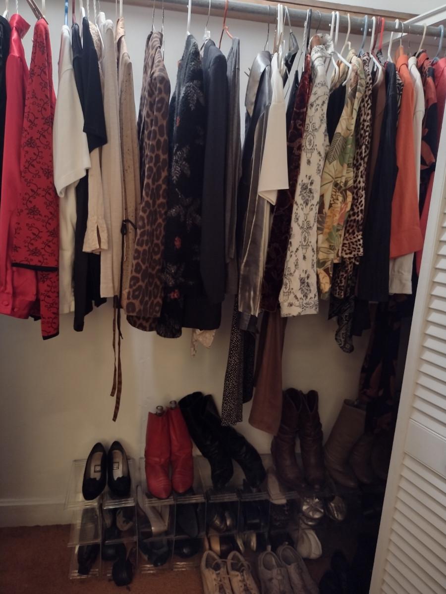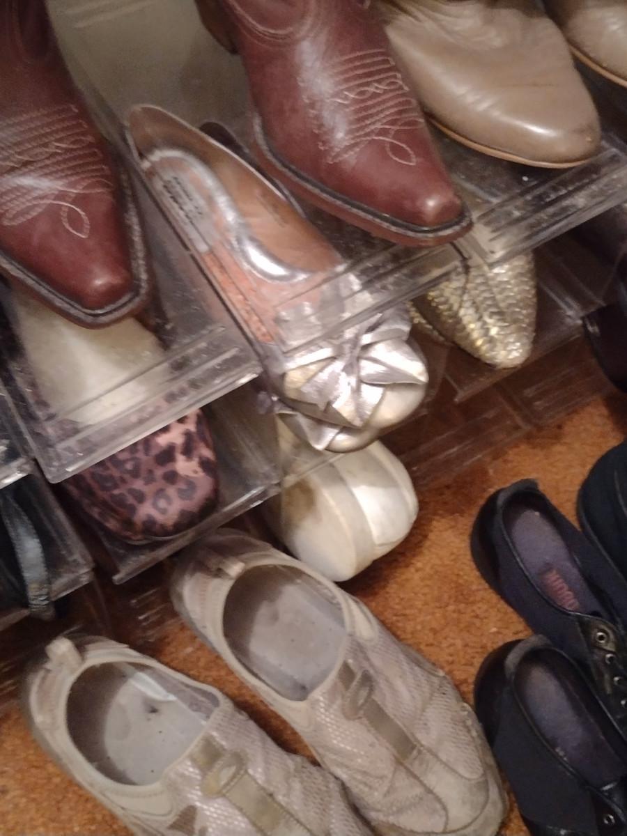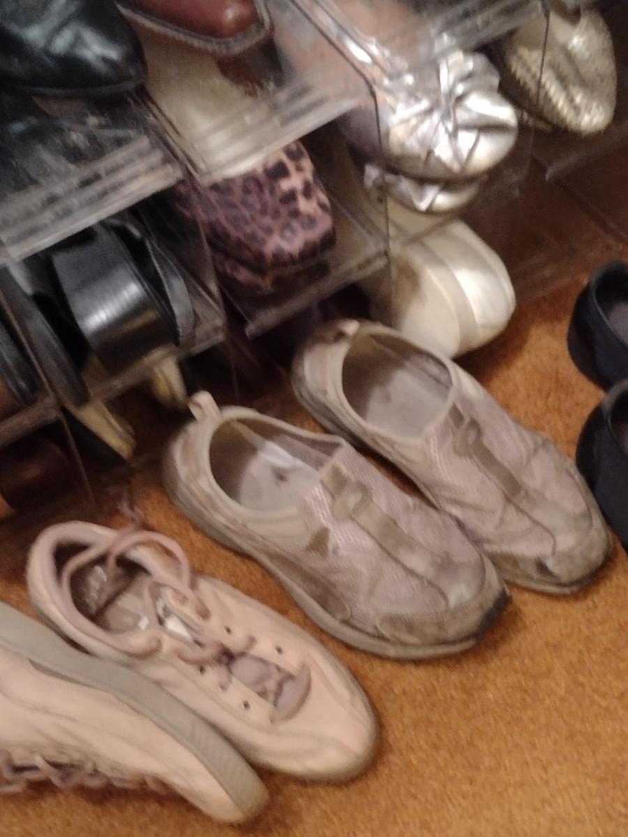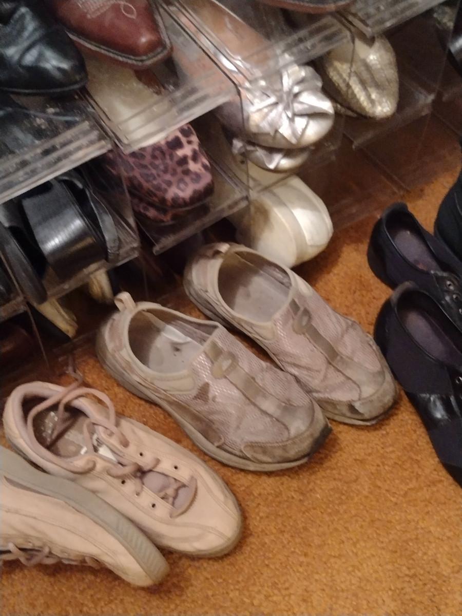 Large Collection of Ladies Clothing and Shoes. Please see all pictures for selection. Clothing sizes vary- medium to extra large. Shoes are approx size 8- all are in used condition- some are heavily used.