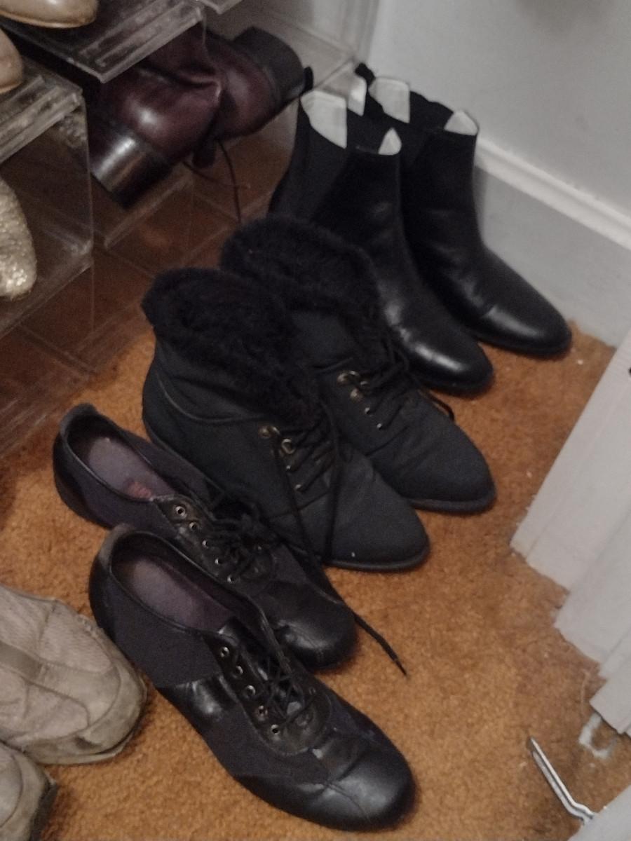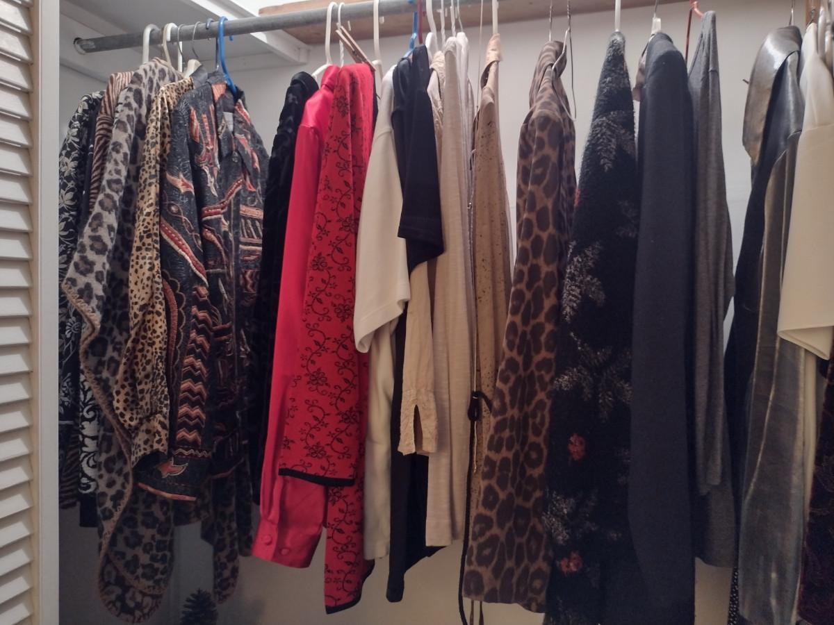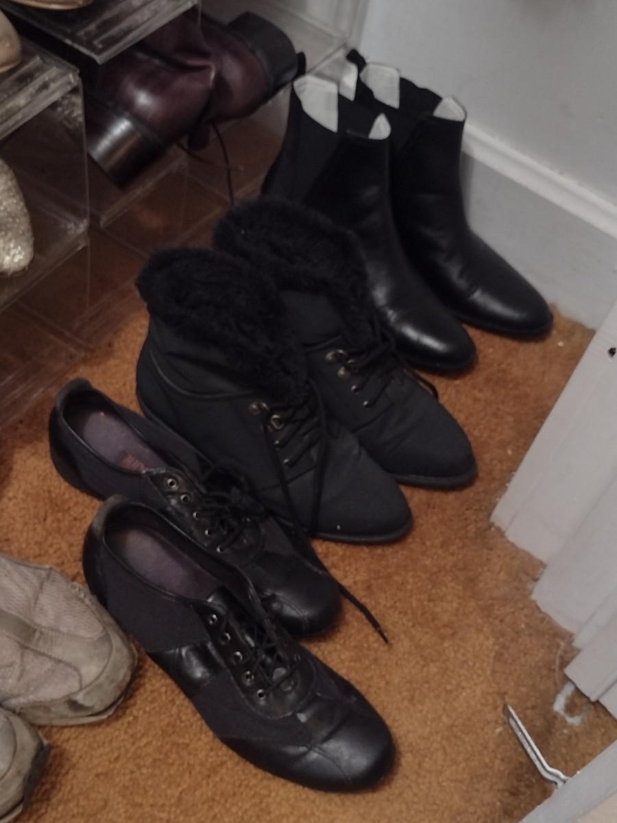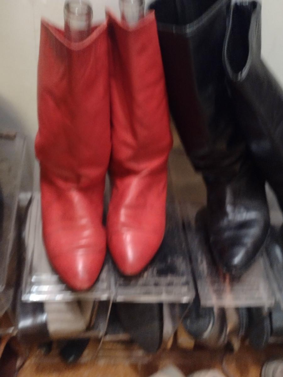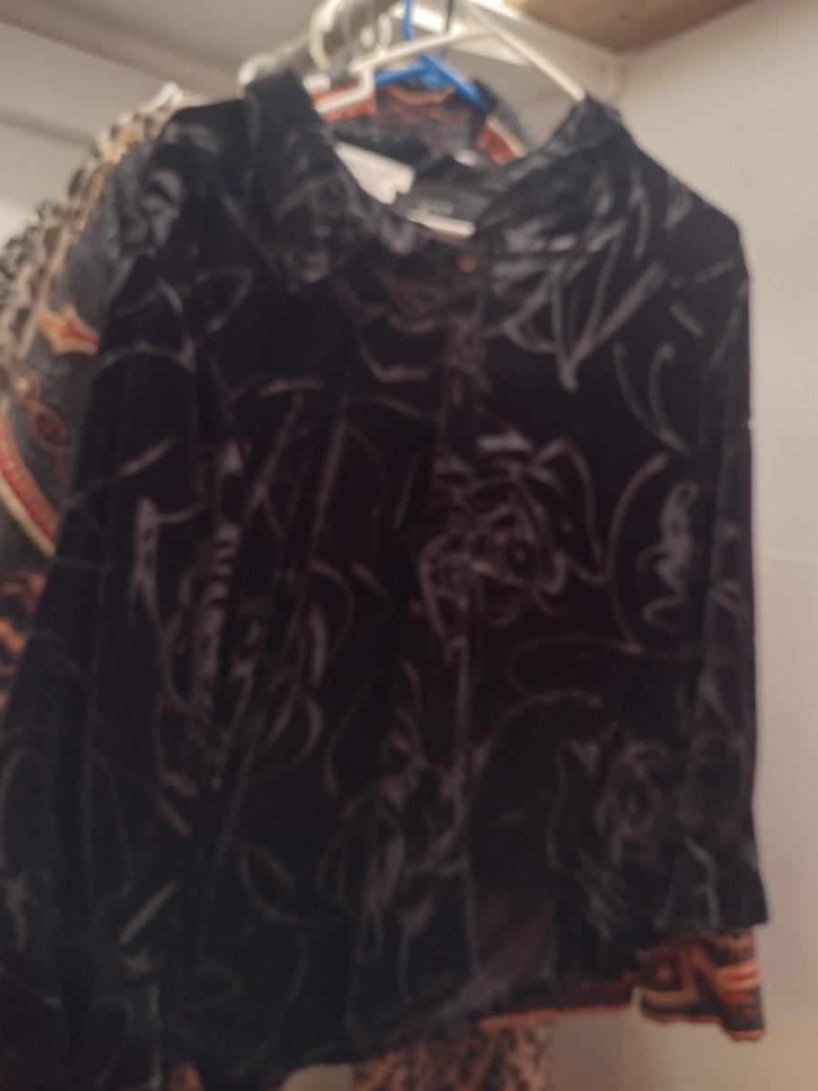 Large Collection of Ladies Clothing and Shoes. Please see all pictures for selection. Clothing sizes vary- medium to extra large. Shoes are approx size 8- all are in used condition- some are heavily used.