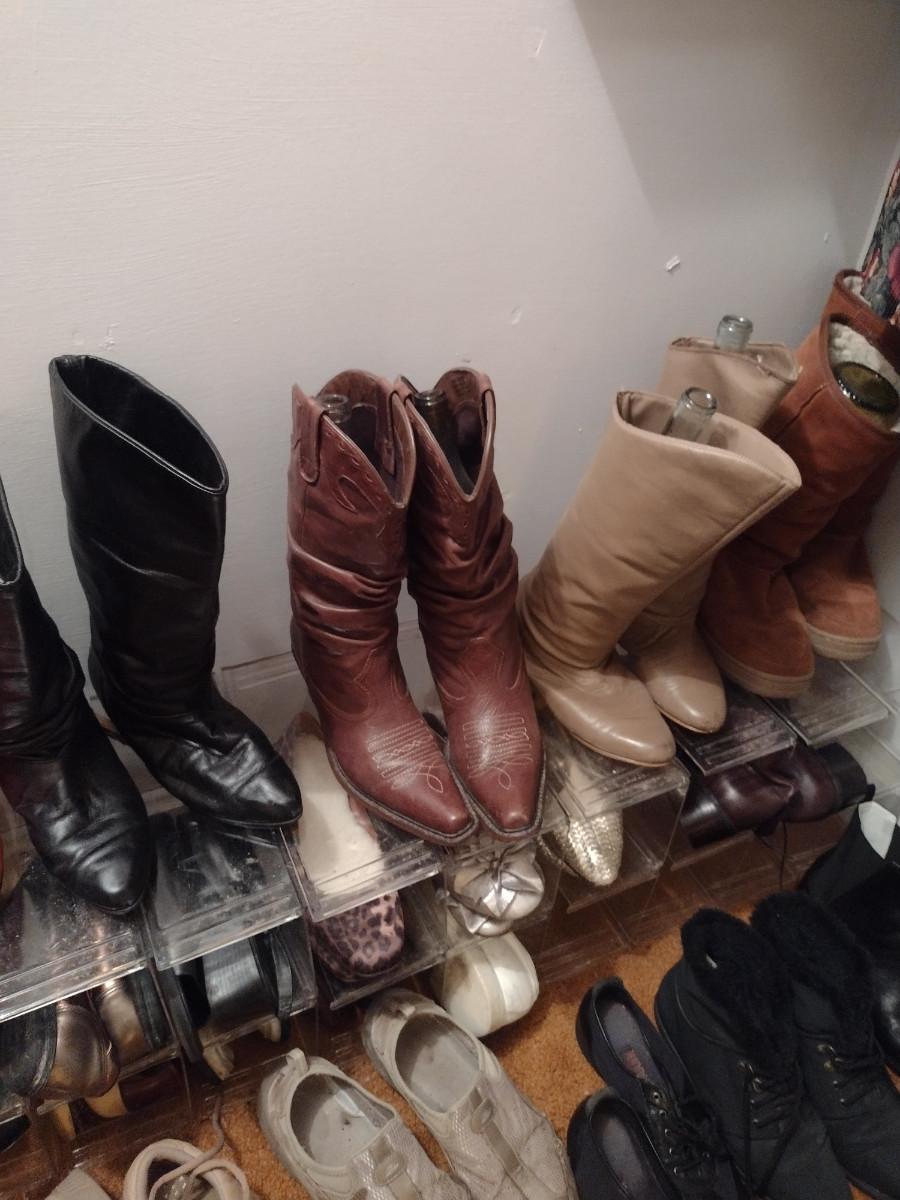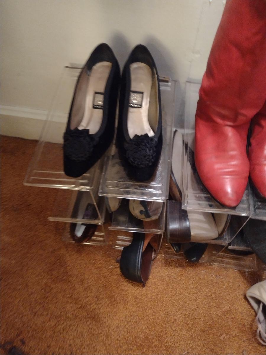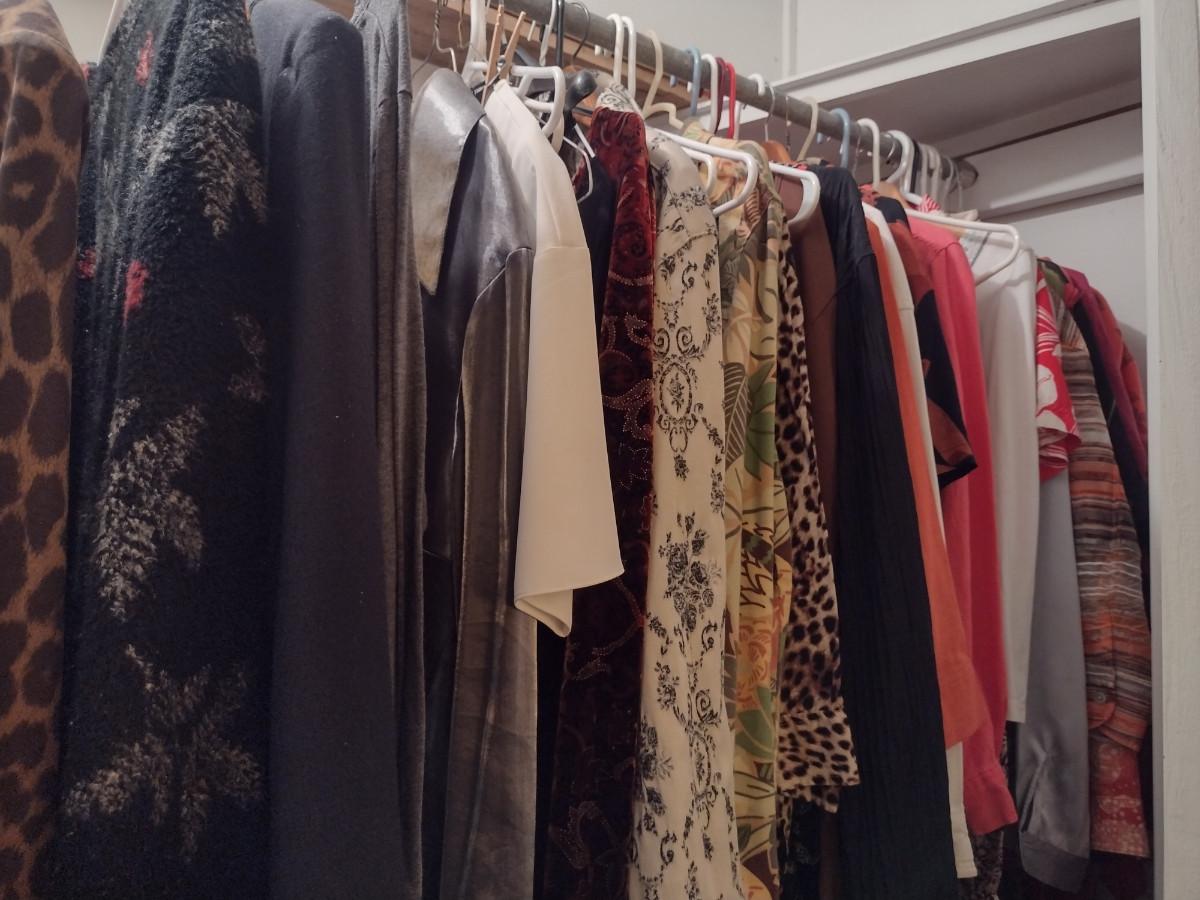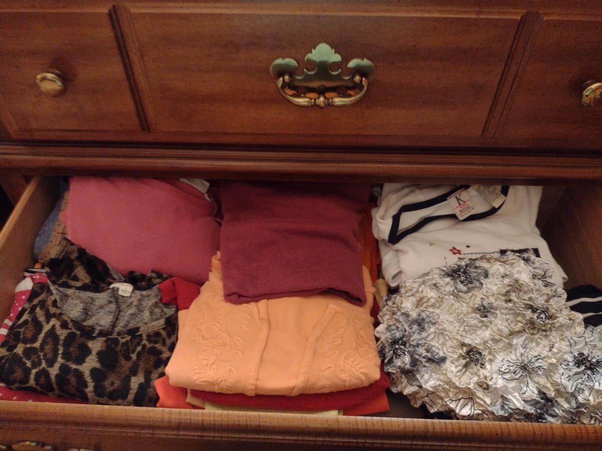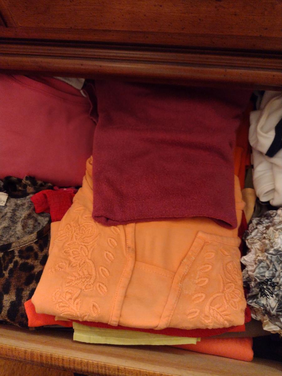 Large Collection of Ladies Clothing and Shoes. Please see all pictures for selection. Clothing sizes vary- medium to extra large. Shoes are approx size 8- all are in used condition- some are heavily used.