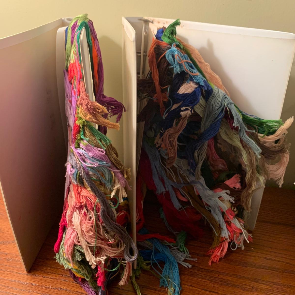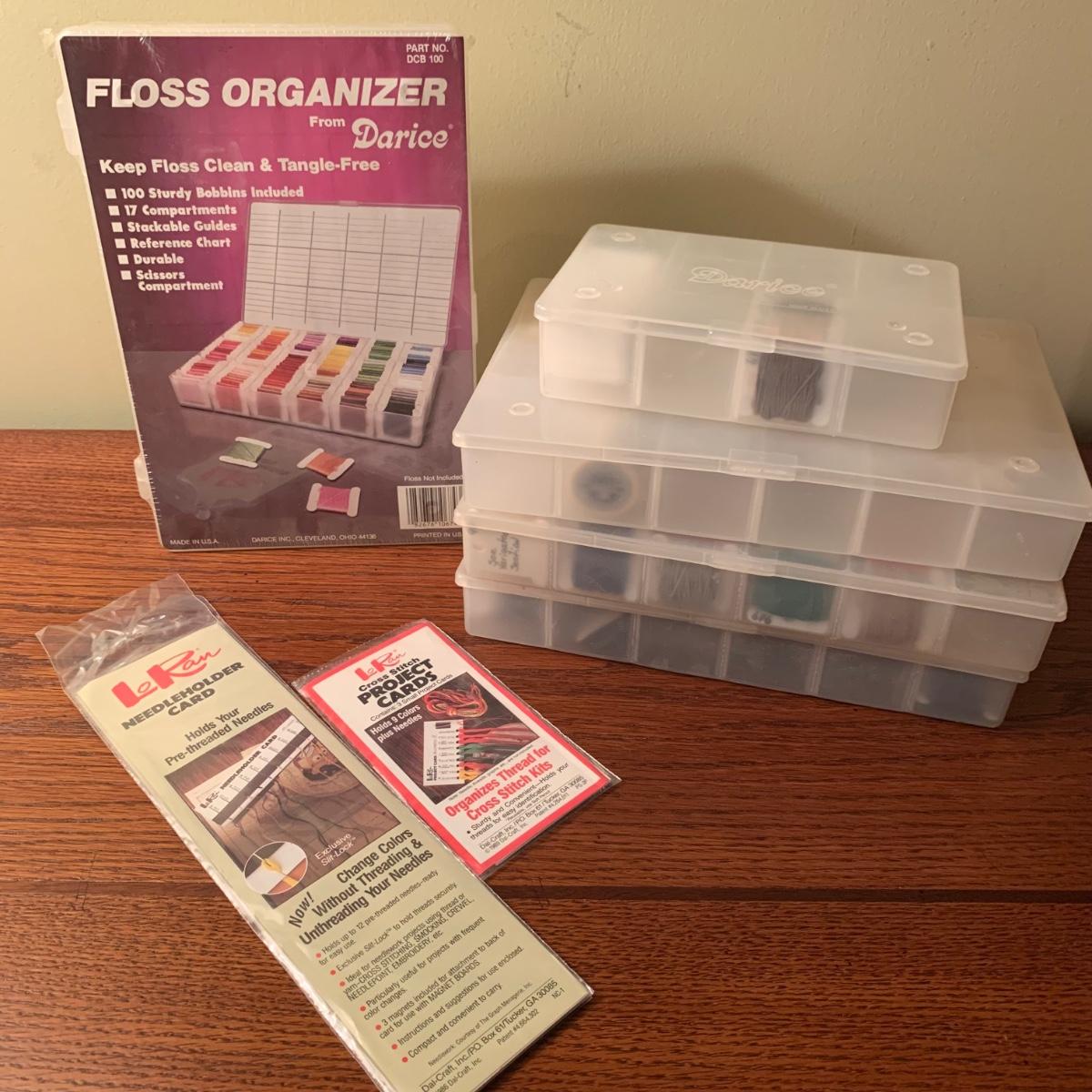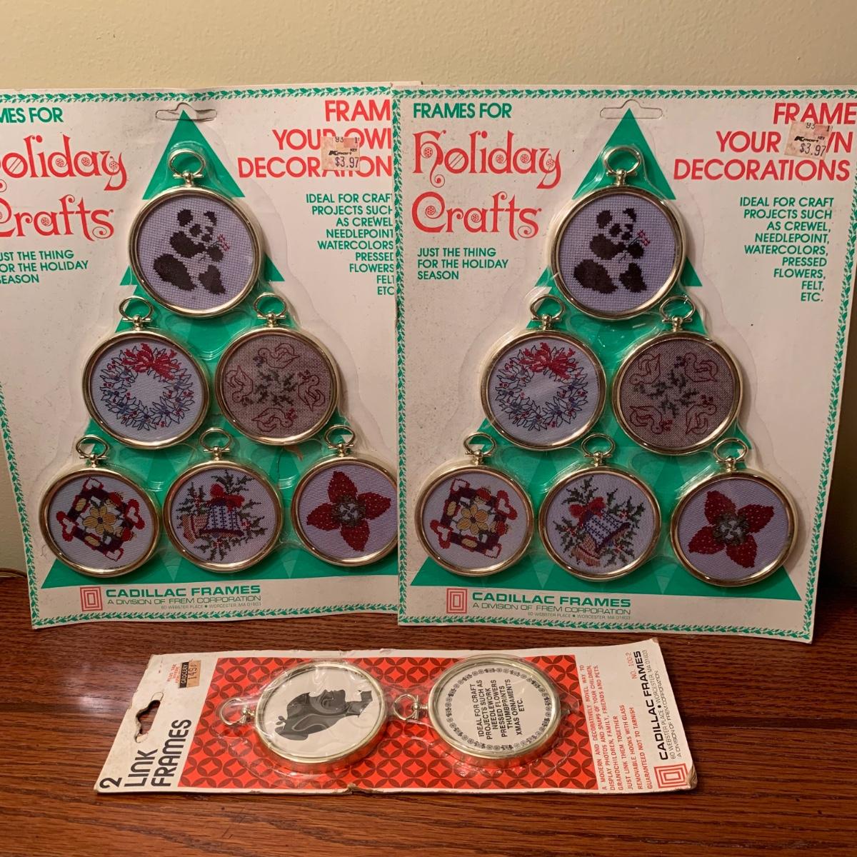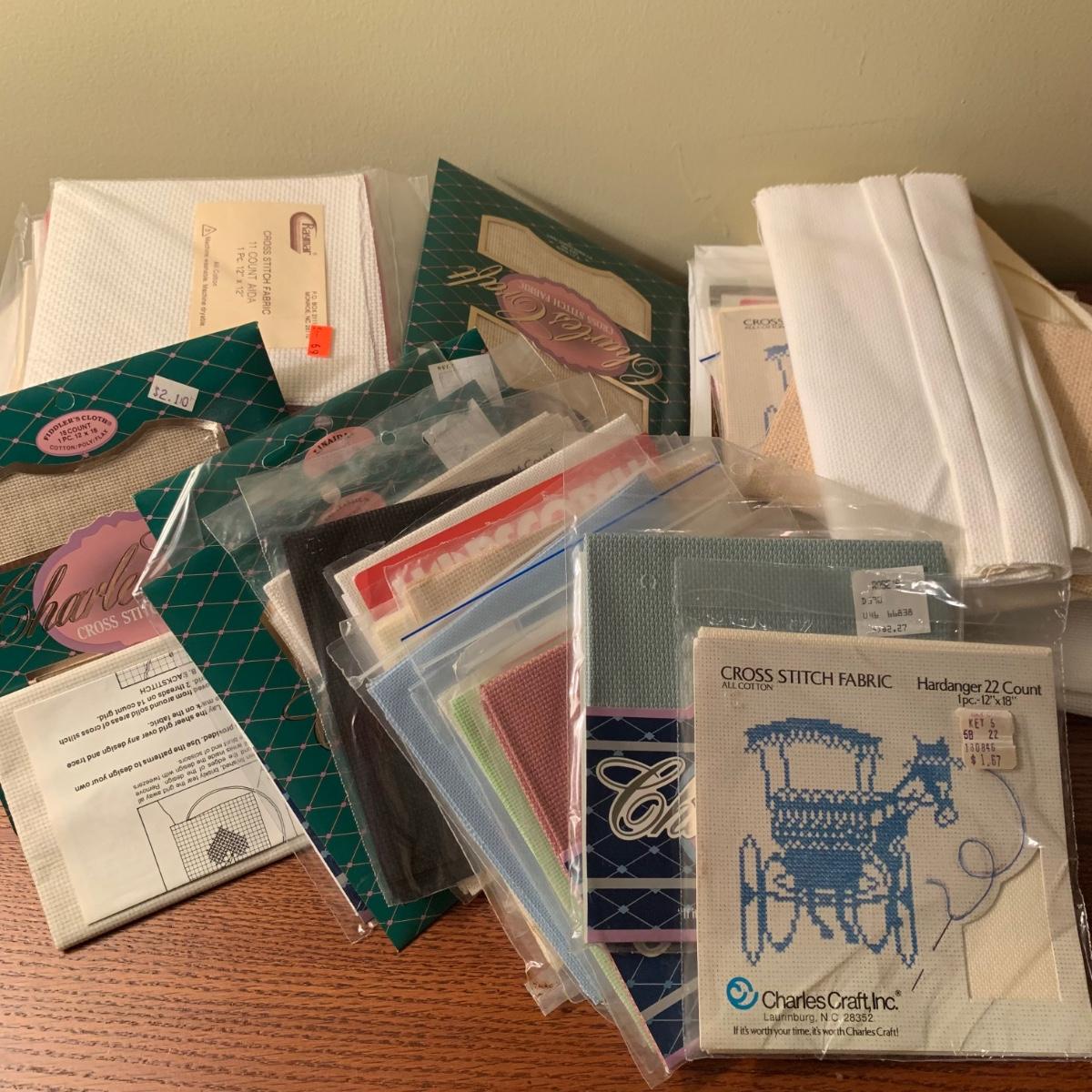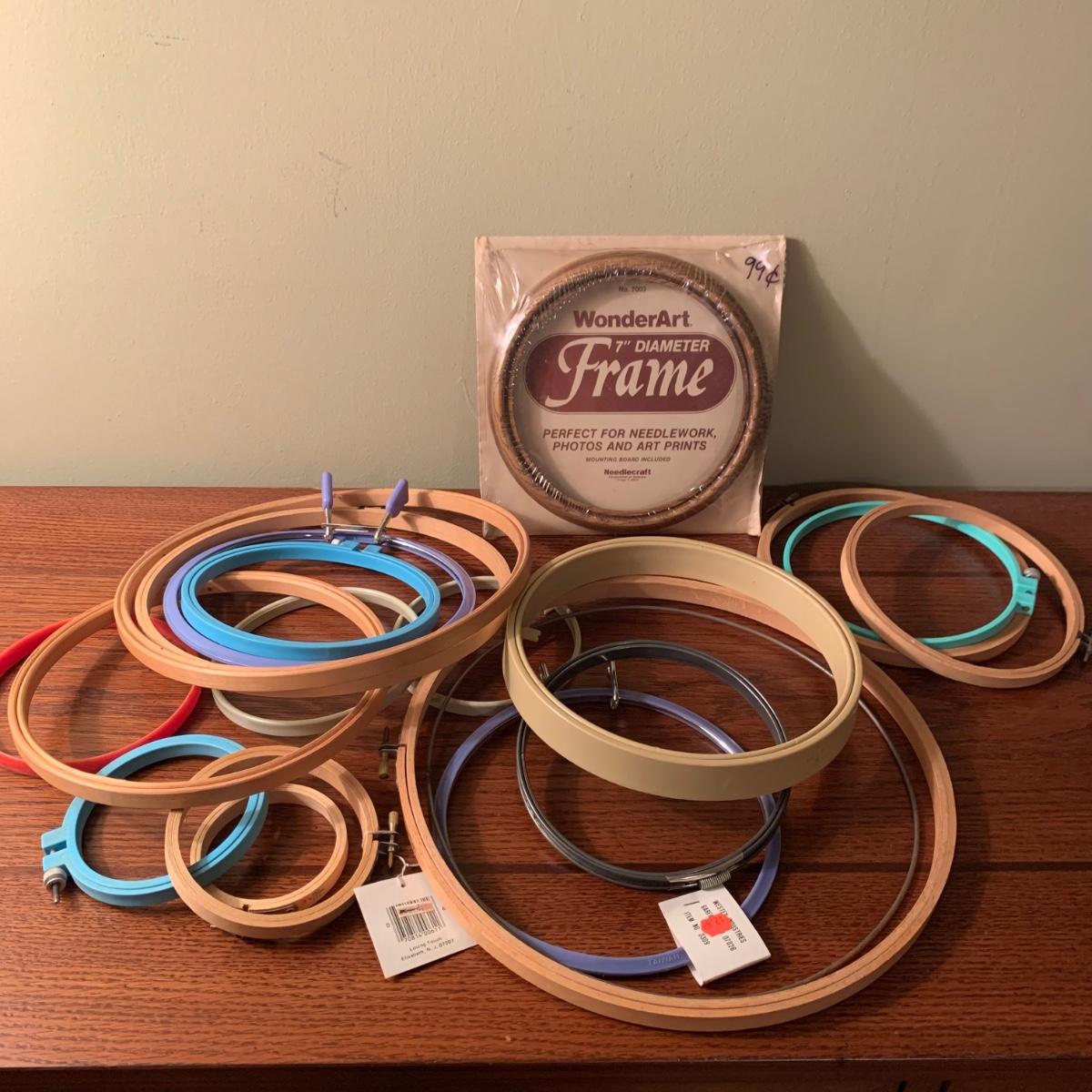 This huge collection of needlework supplies includes a NIB Crown Crafts needlework easel, a few books, holiday craft frames, a variety of wicking yarn and embroidery floss, pillow inserts, and tons of embroidery hoops in many sizes (most wood, some plastic). There are also thread organizers, many packages of cross stitch fabric, and more. Please see photos for details.