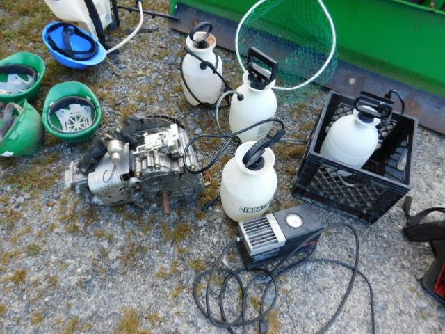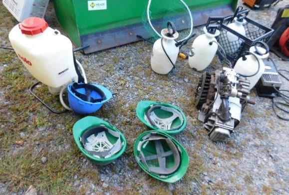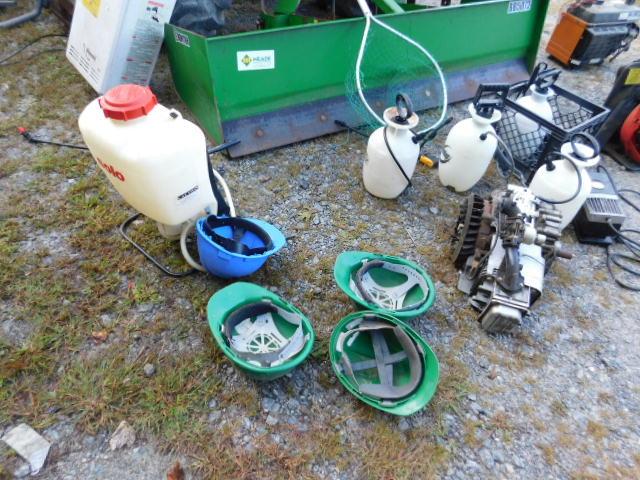 Large Collection of Outdoor Pump Sprayers, Safety Helmets, and More (A) condition unknown