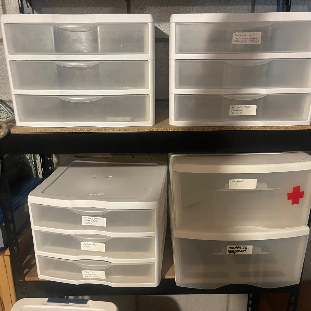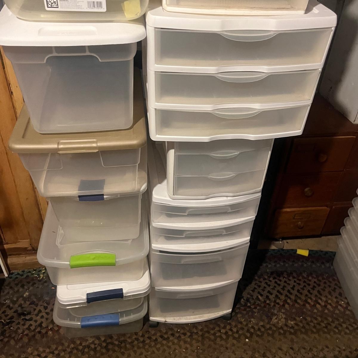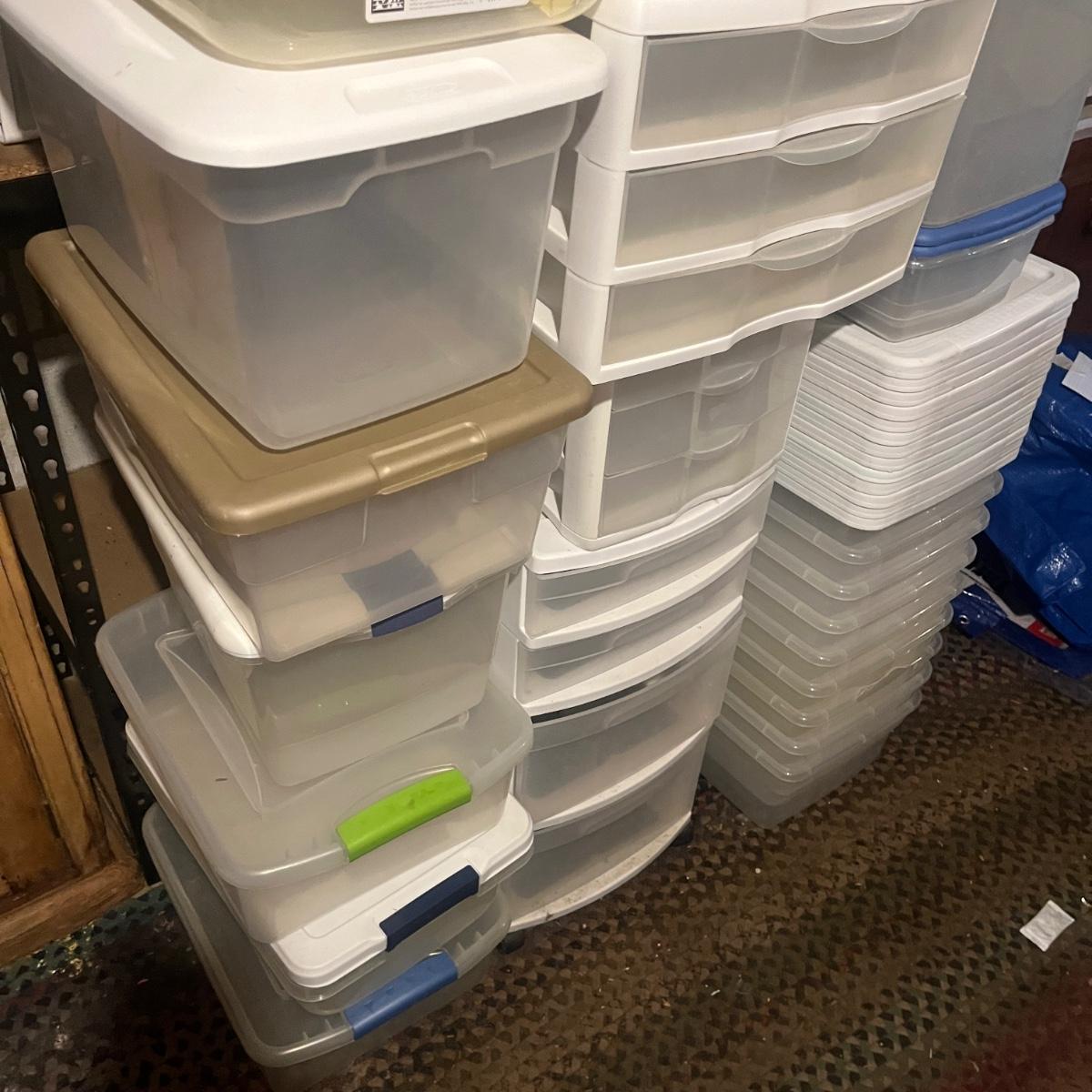Lot contains a collection of over twenty plastic storage containers in a variety of sizes and six plastic containers with drawers. Largest container measures 13” x 14” x 26”H.