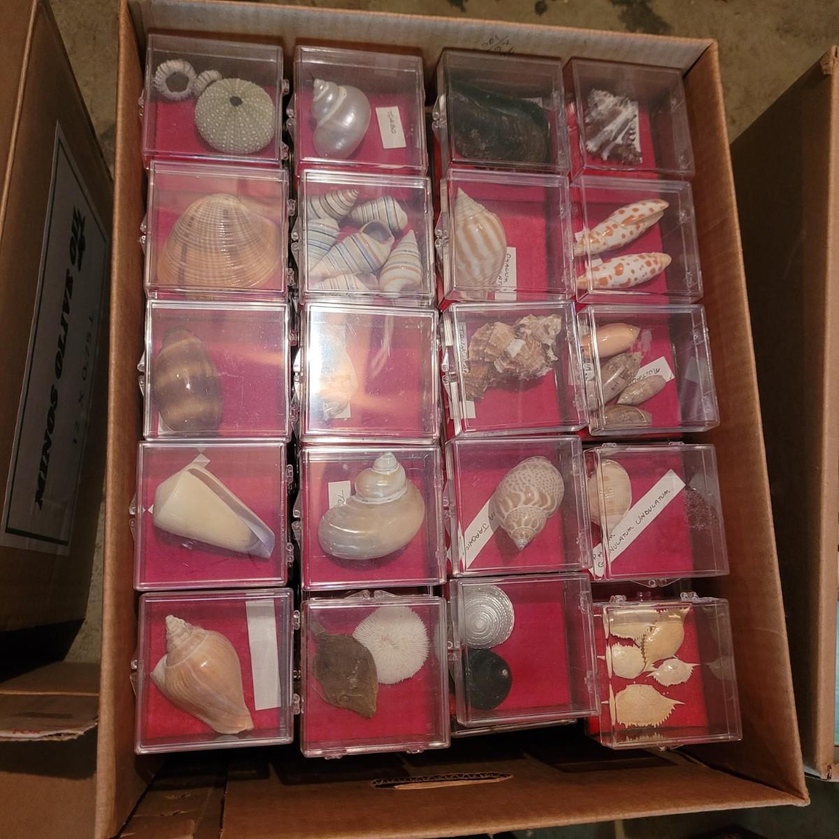 This lot is a wonderful addition to any shell lover's collection! The collection is quite extensive with many well organized, labeled cases, in addition to fish artifacts, driftwood, stones and more. Shipping available. Shipping can be costly. We suggest contacting our preferred local shipping provider, Postage Express, with dimensions and getting an estimate before bidding: (828) 670-5501or postageexpress@yahoo.com.