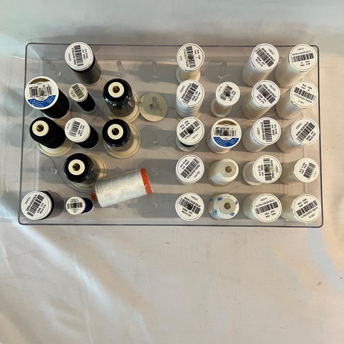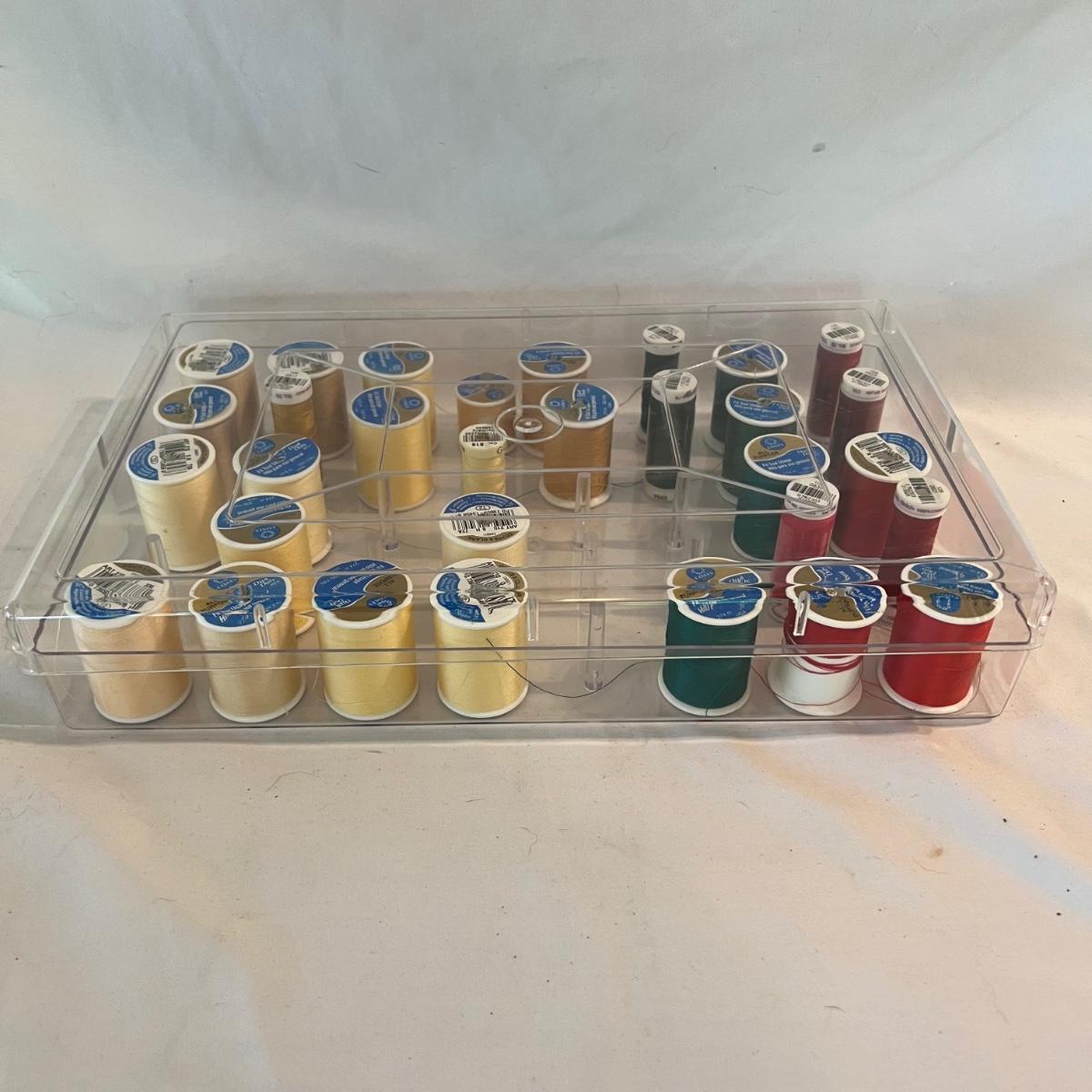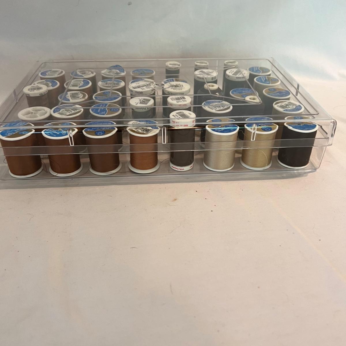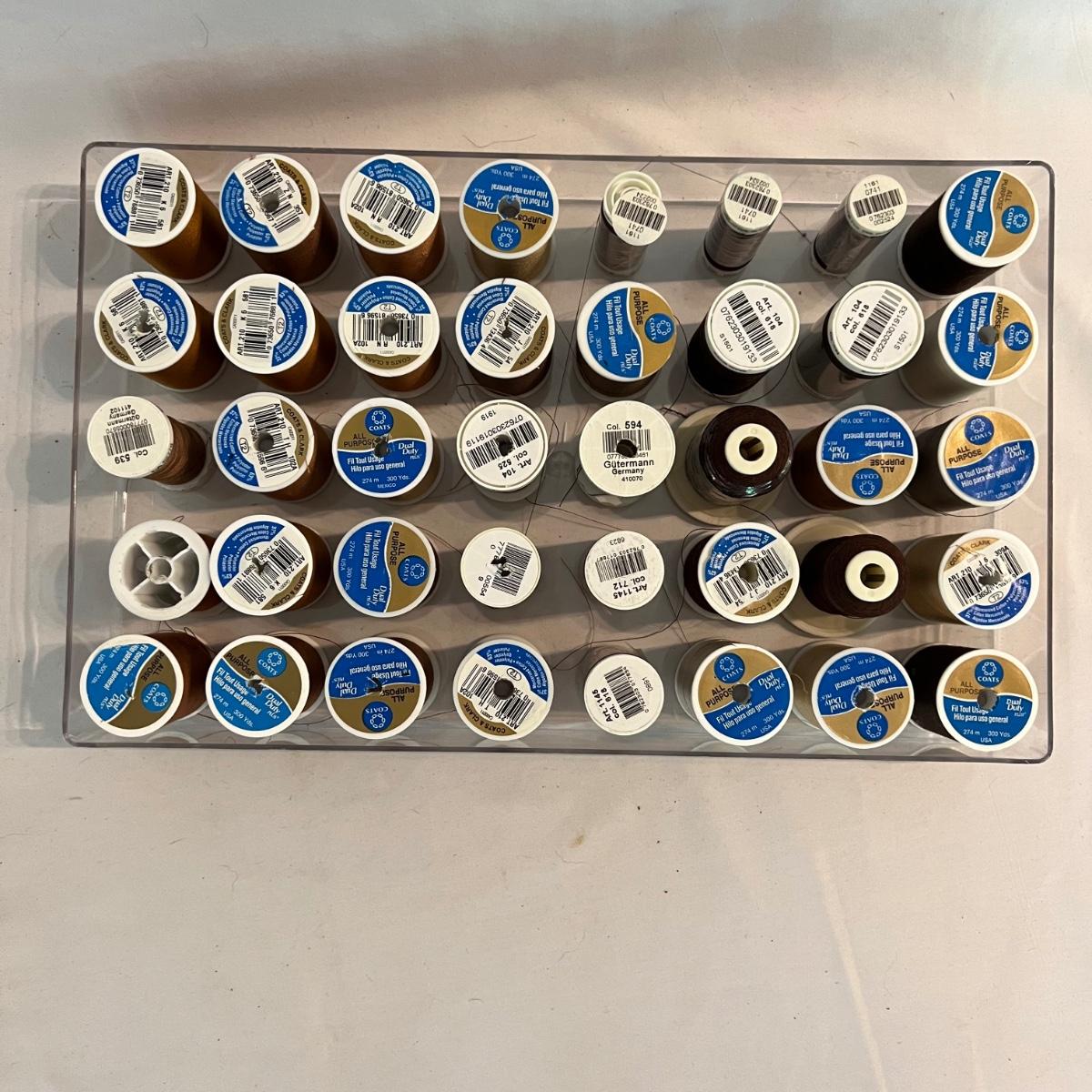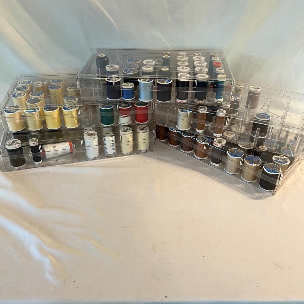 Very large collection of thread in plastic thread storage cases. Black, white, yellow, red, green, brown and blue.
