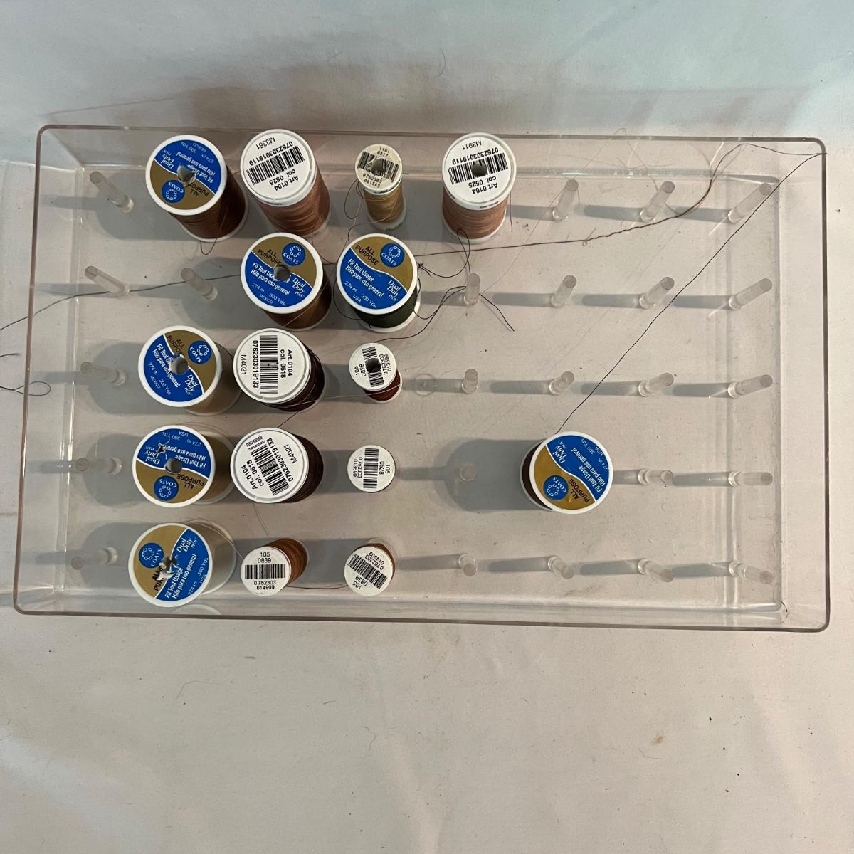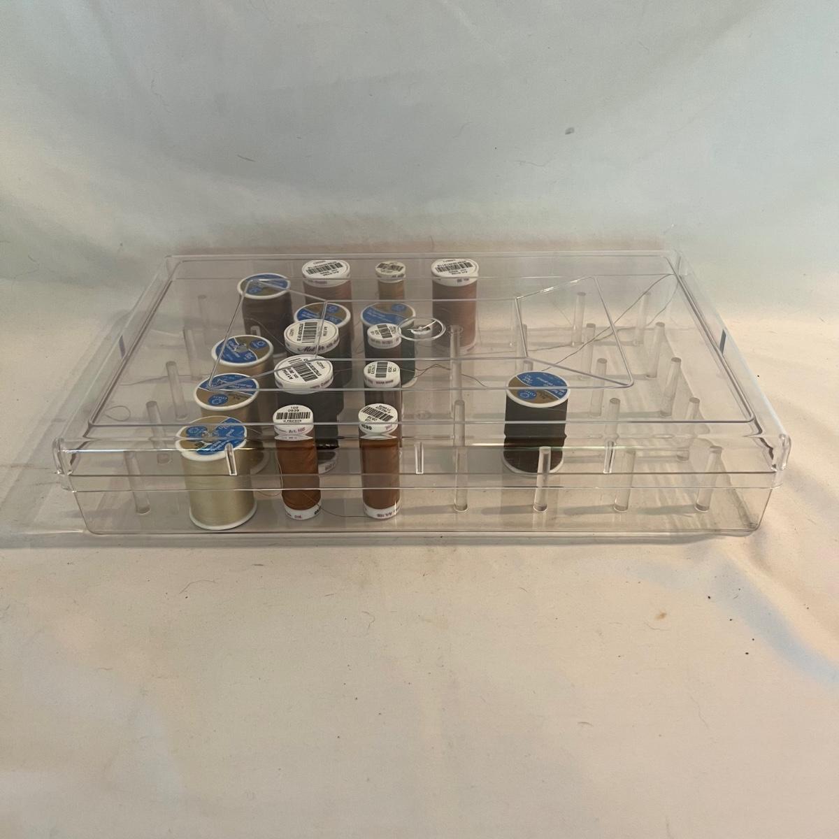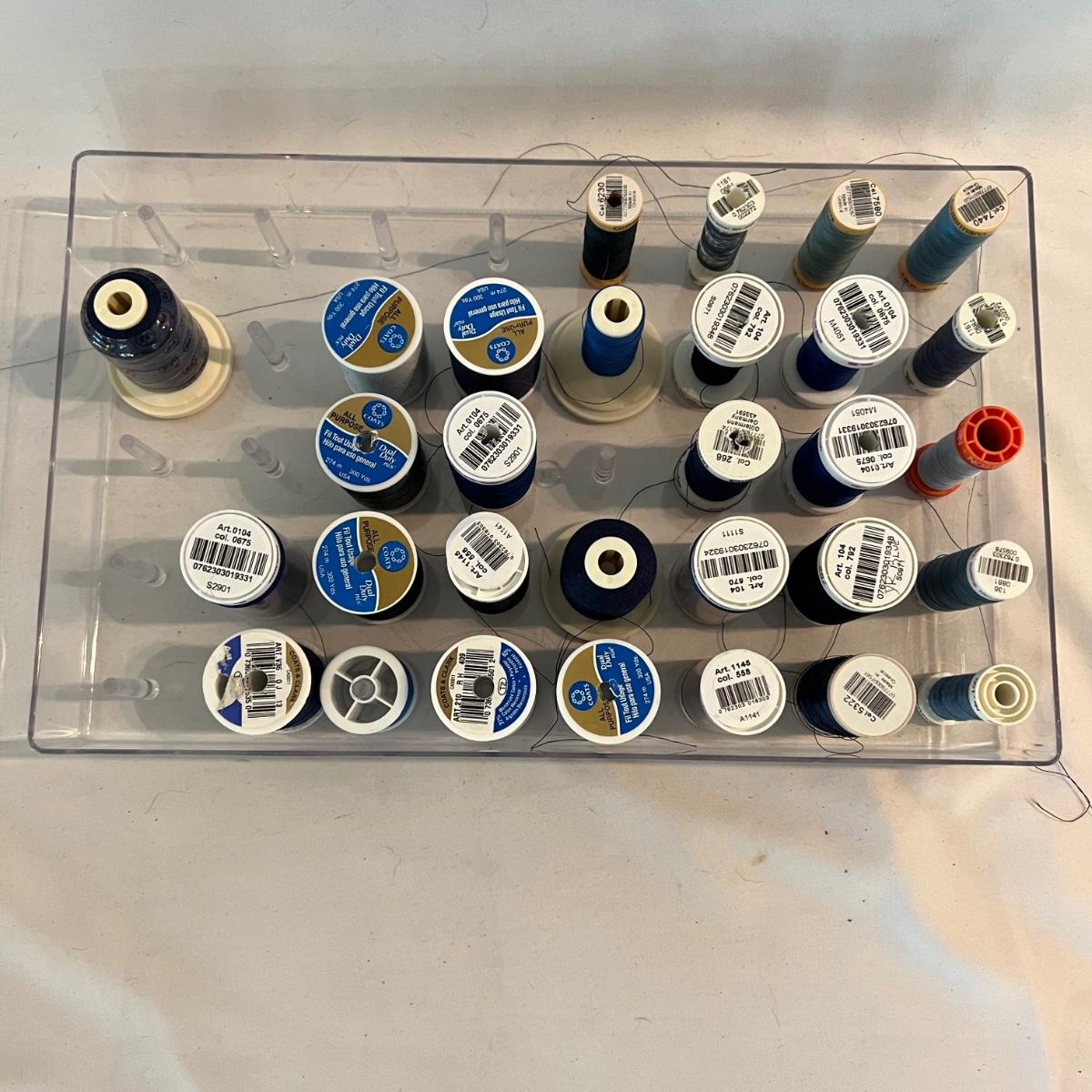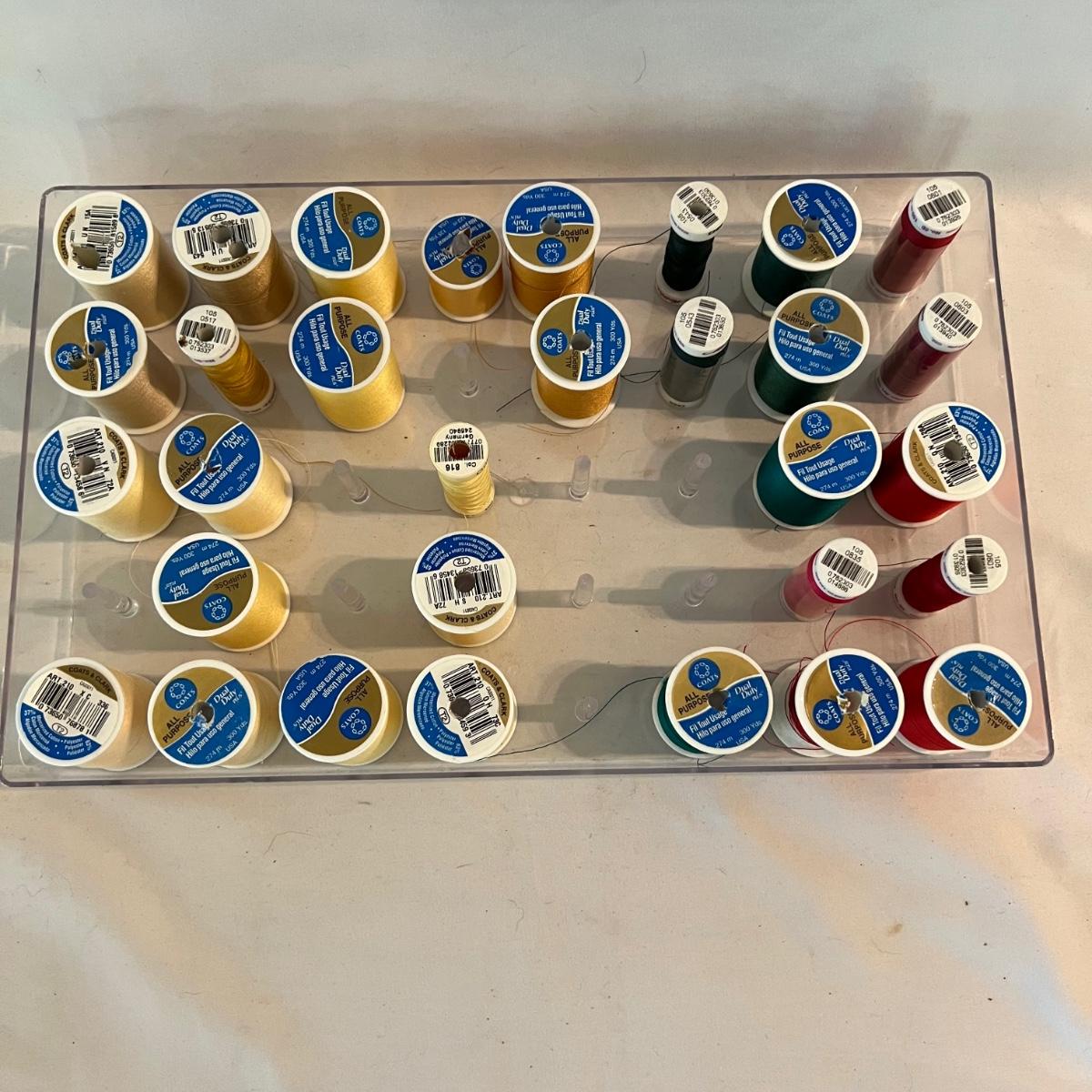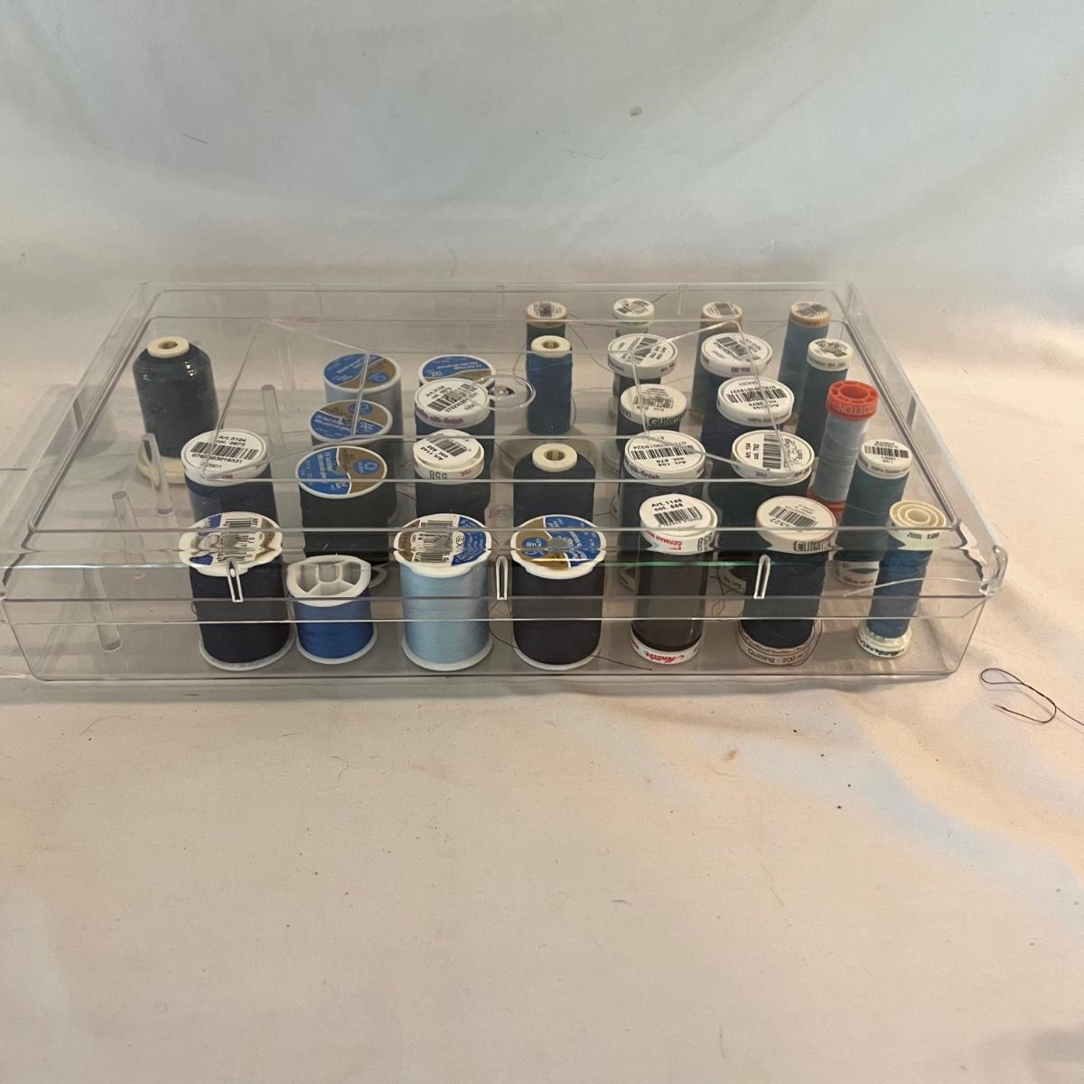 Very large collection of thread in plastic thread storage cases. Black, white, yellow, red, green, brown and blue.