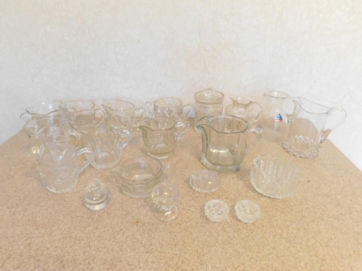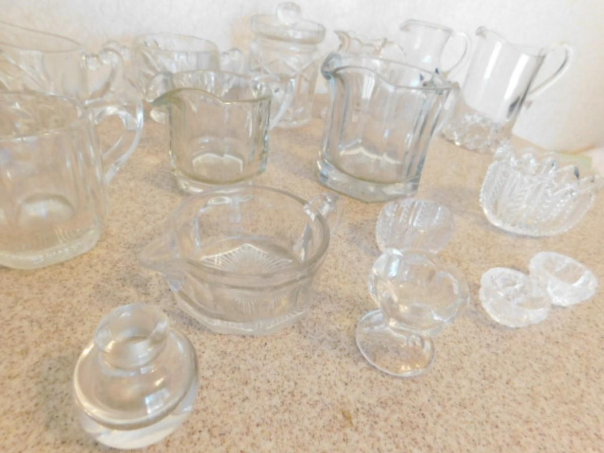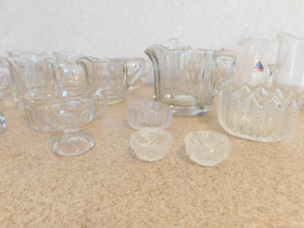 Large Collection of Vintage Glassware Table Service Pieces includes Creamers, Salt Servers, and More