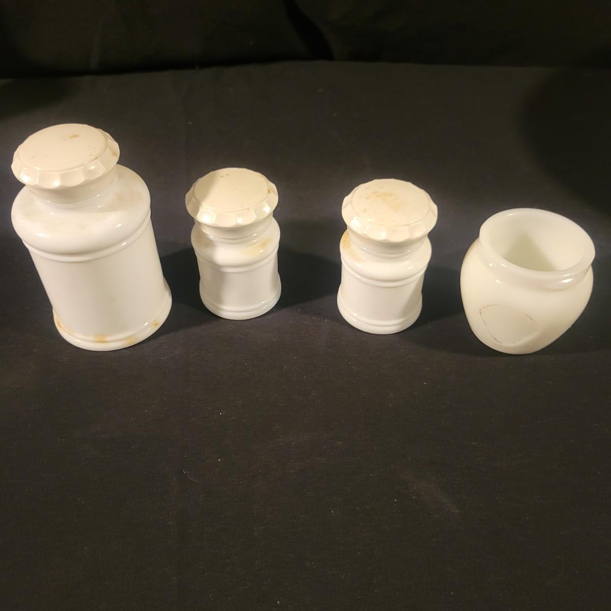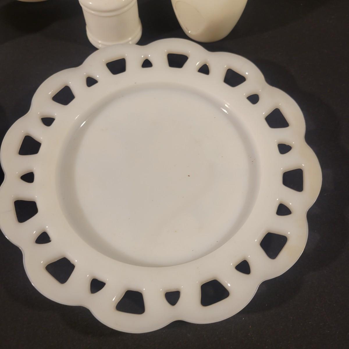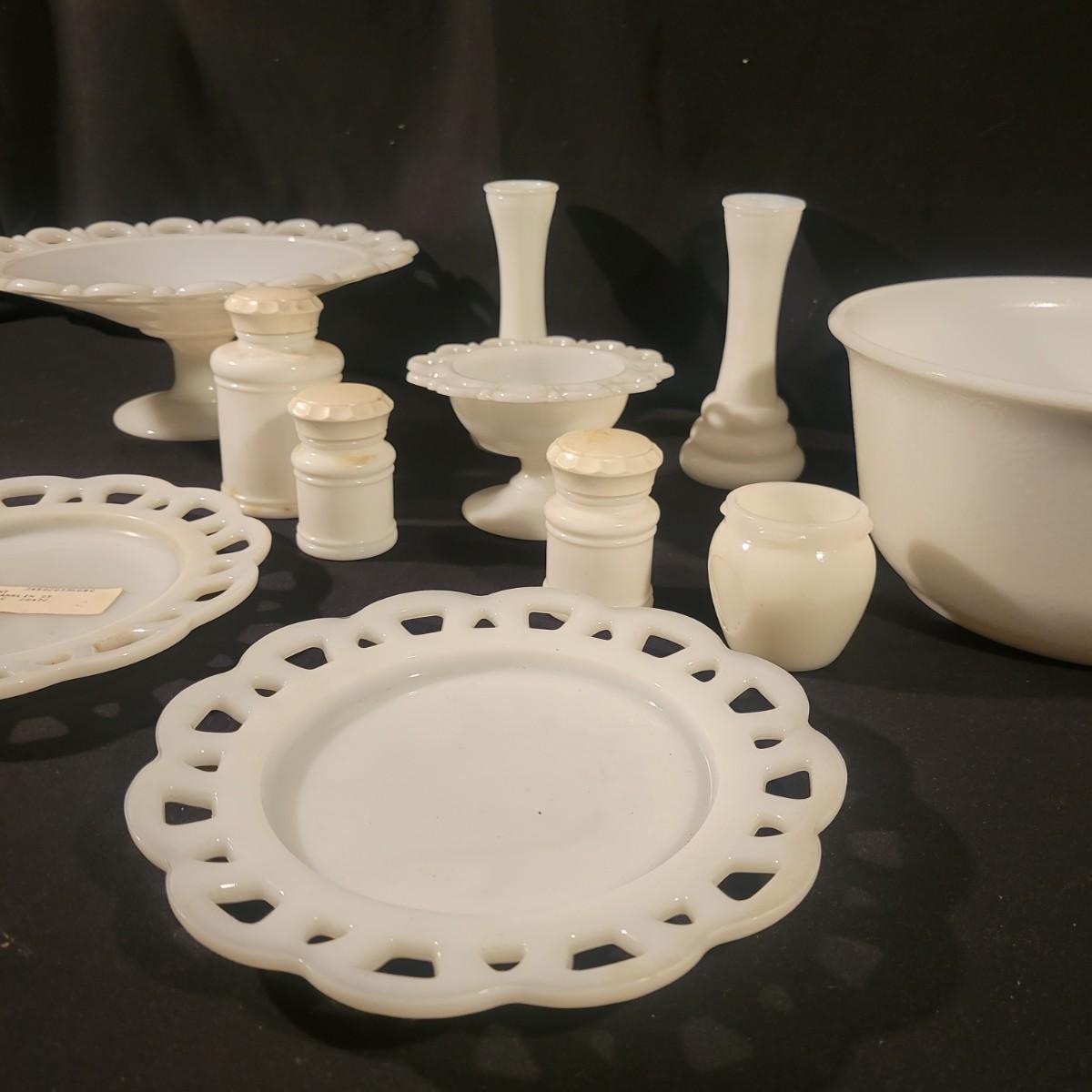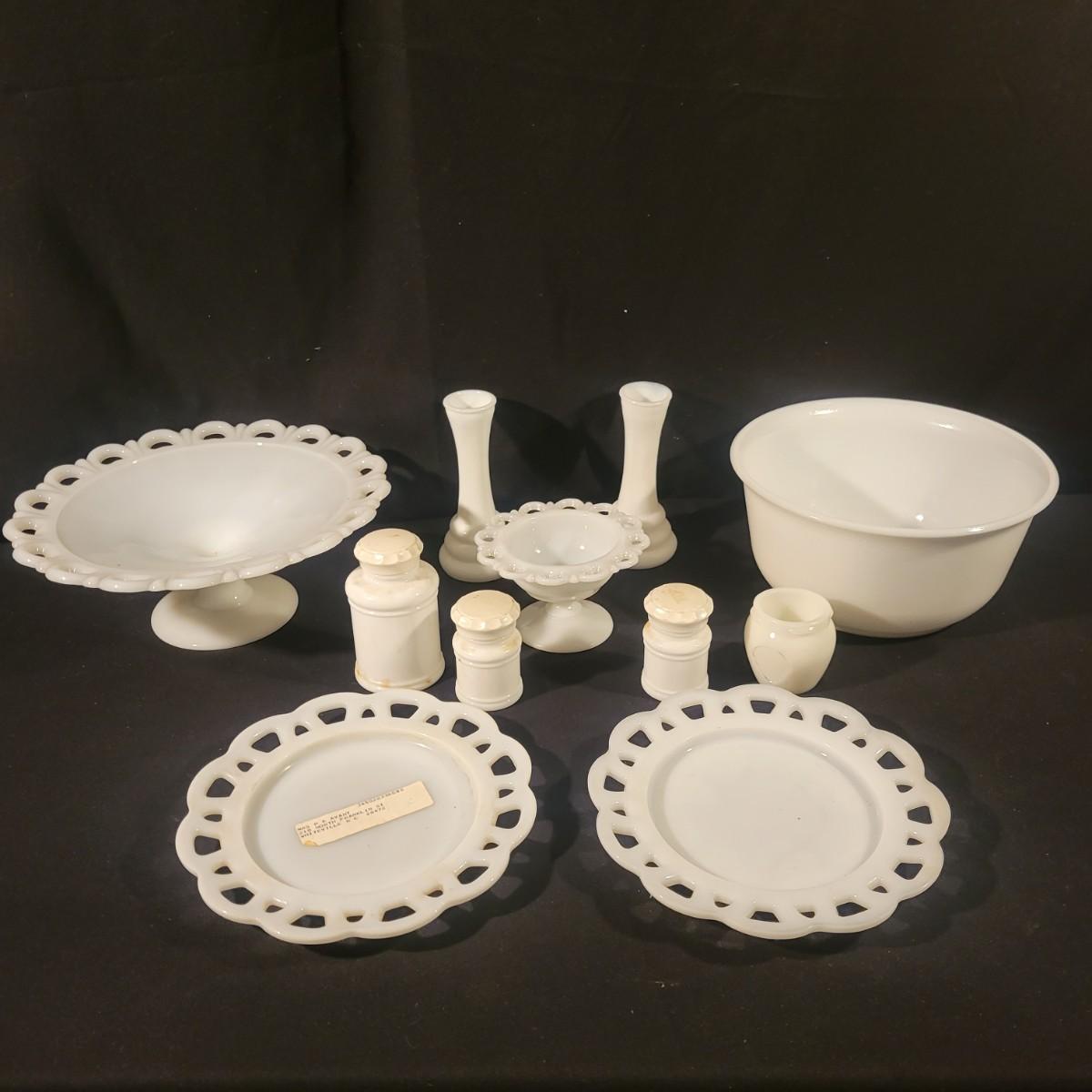 A collection of white glass pieces ranging from bowls, vases, serving dishes and more. 11 pieces in total in good to excellent condition. No pieces have any cracks or chips, but one plate has a a sticker affixed to it and the screw top containers have some staining on their plastic lids. Largest piece is the bowl and measures approximately 9.5" x 5" Shipping available