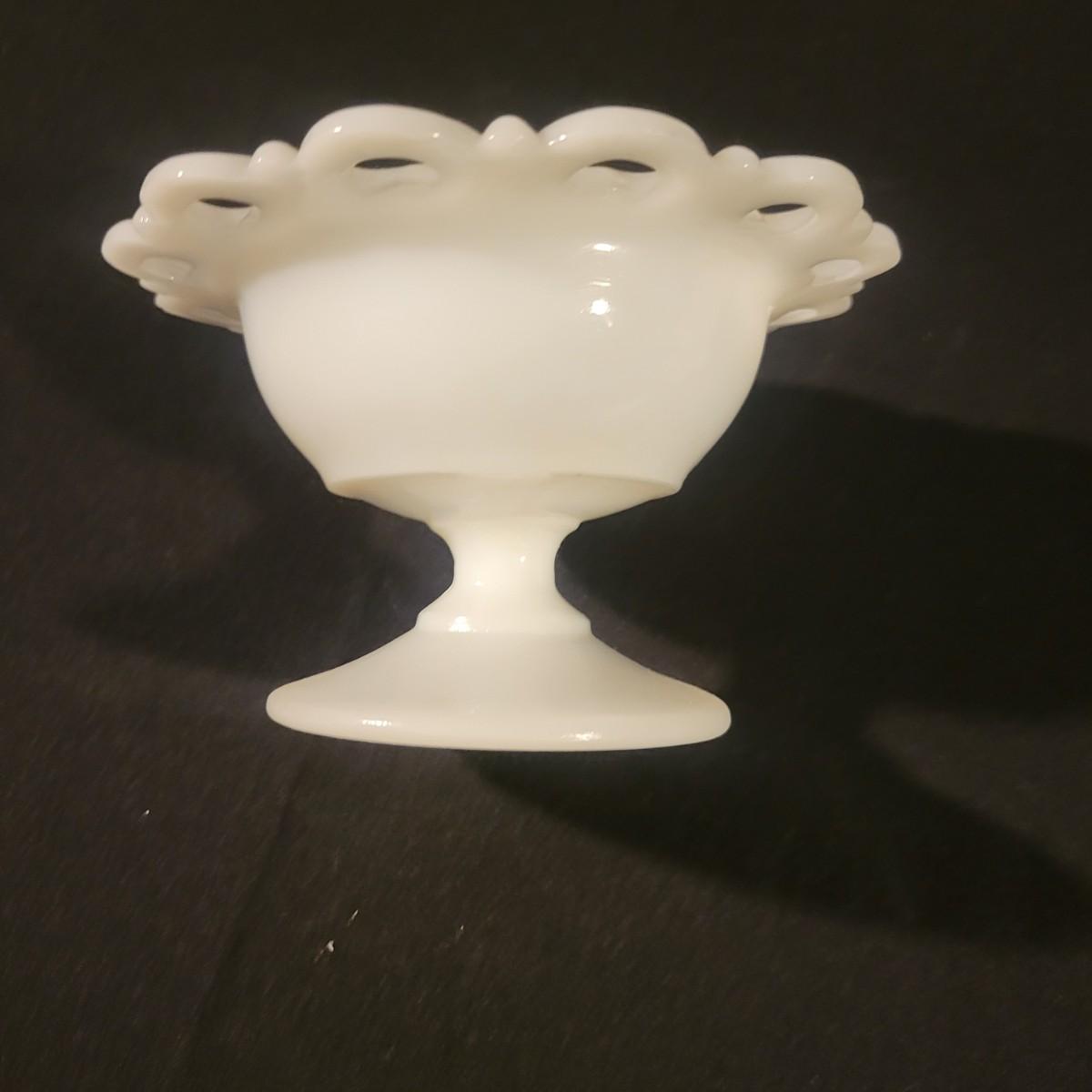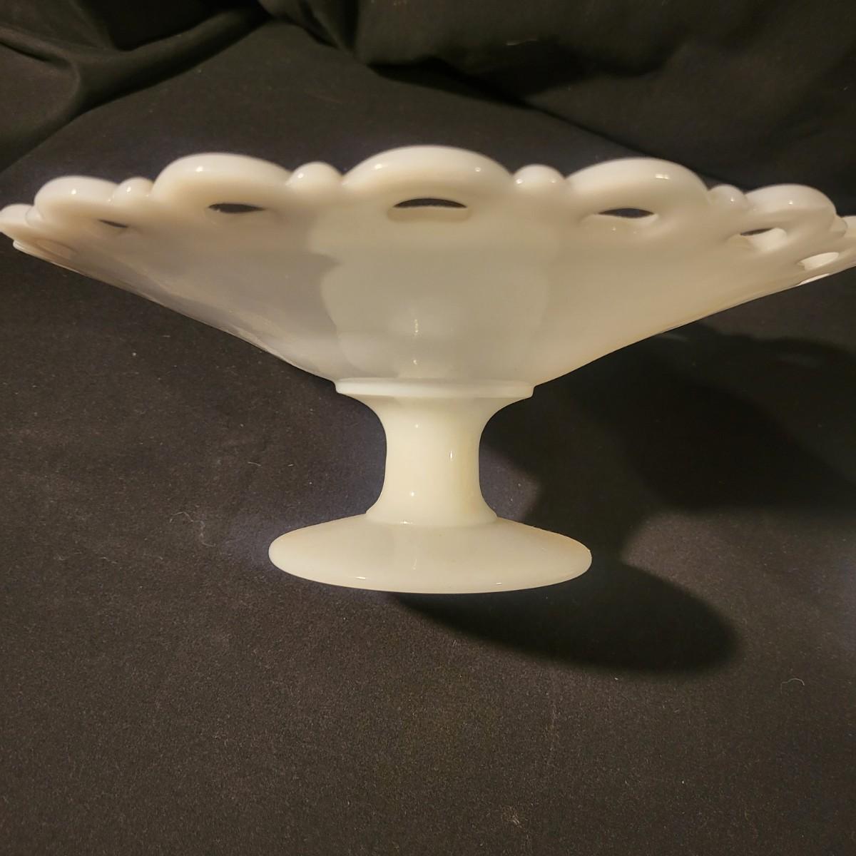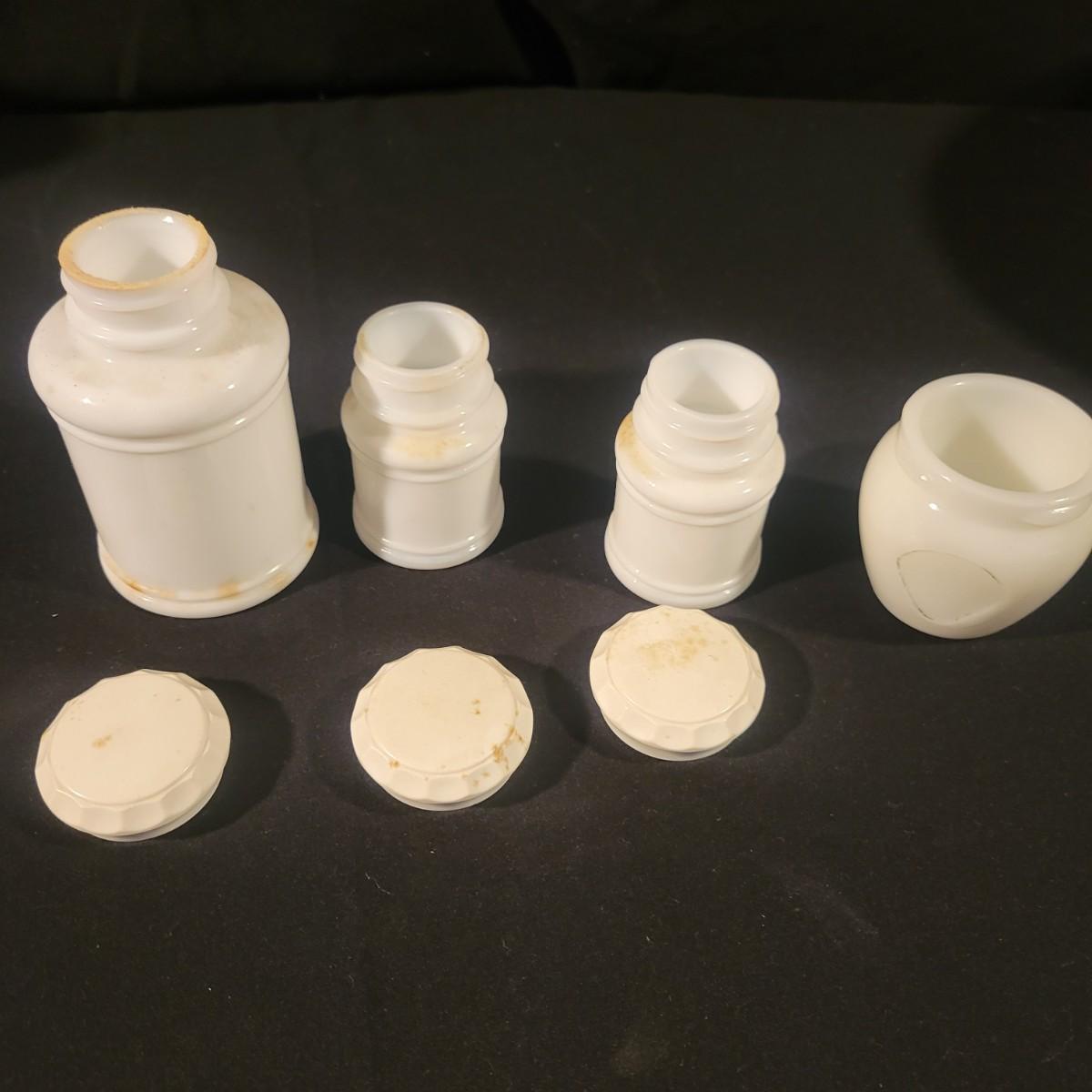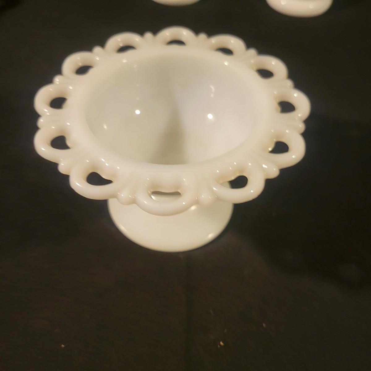A collection of white glass pieces ranging from bowls, vases, serving dishes and more. 11 pieces in total in good to excellent condition. No pieces have any cracks or chips, but one plate has a a sticker affixed to it and the screw top containers have some staining on their plastic lids. Largest piece is the bowl and measures approximately 9.5" x 5" Shipping available