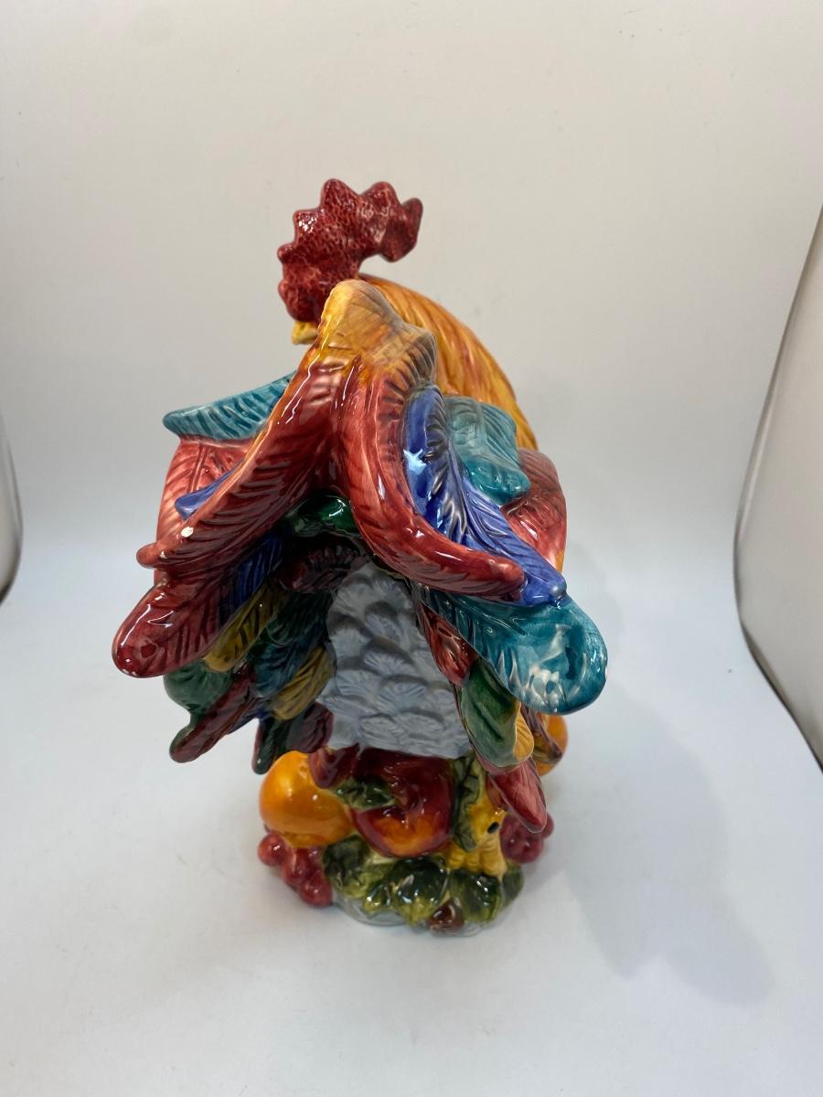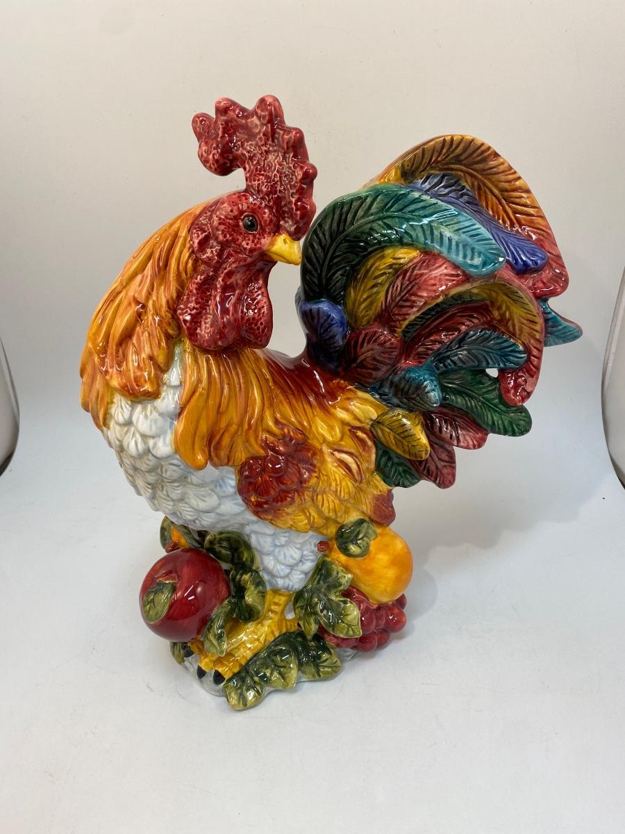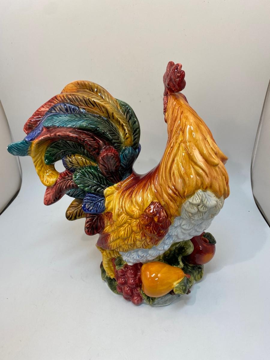 Large Colorful Ceramic Rooster Chicken Figurine Statuette. In good condition, small chip in glaze on tail feather, not noticeable when displayed. About 14" tall.