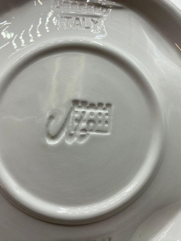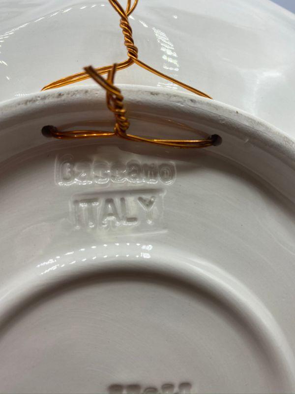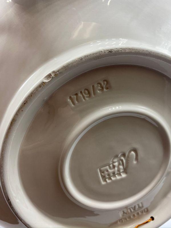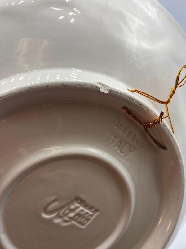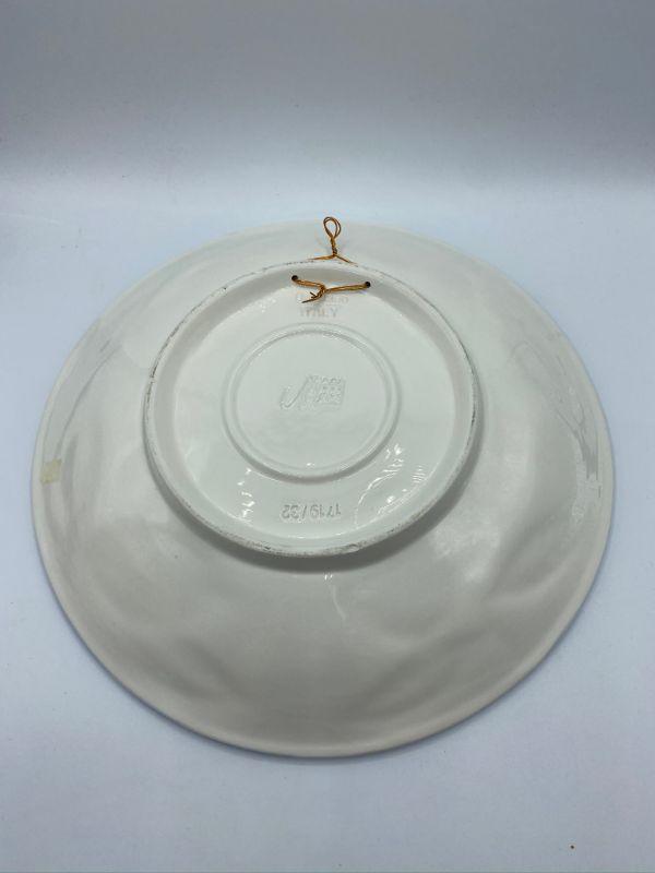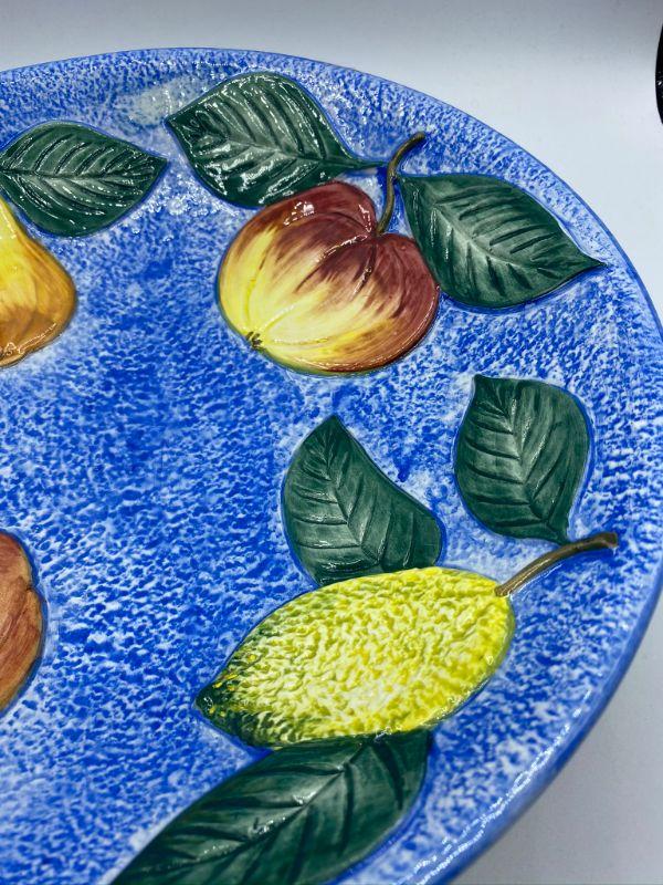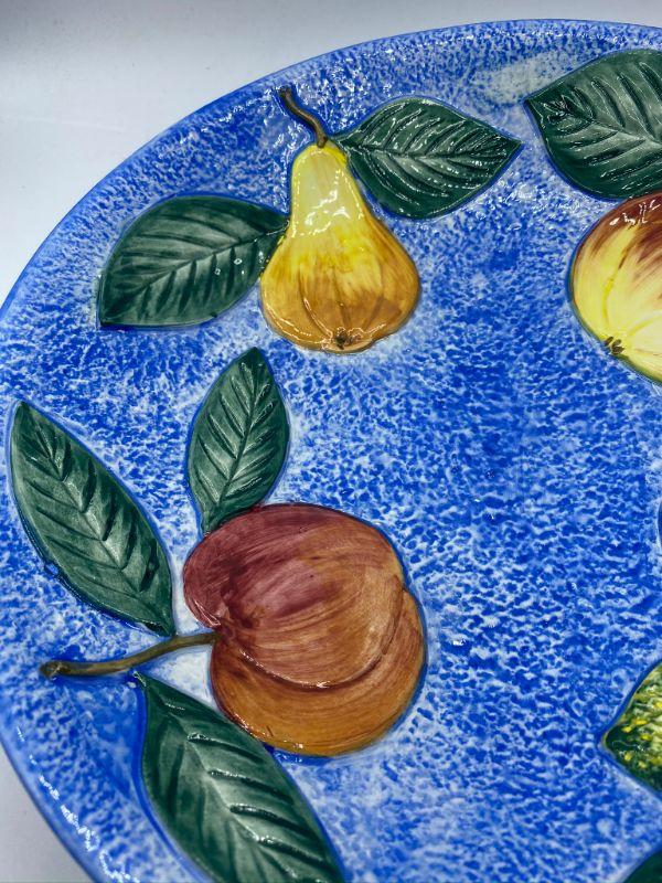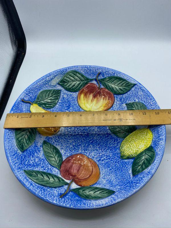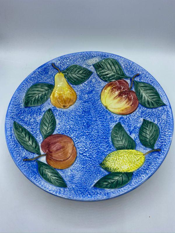 Large colorful fruit bowl. Bright blue with fruit. Cane be displayed on a surface or hung on the wall. Stamped on the back. Made in Italy. Does have a couple chips along rim of bottom, not noticeable unless turned over.