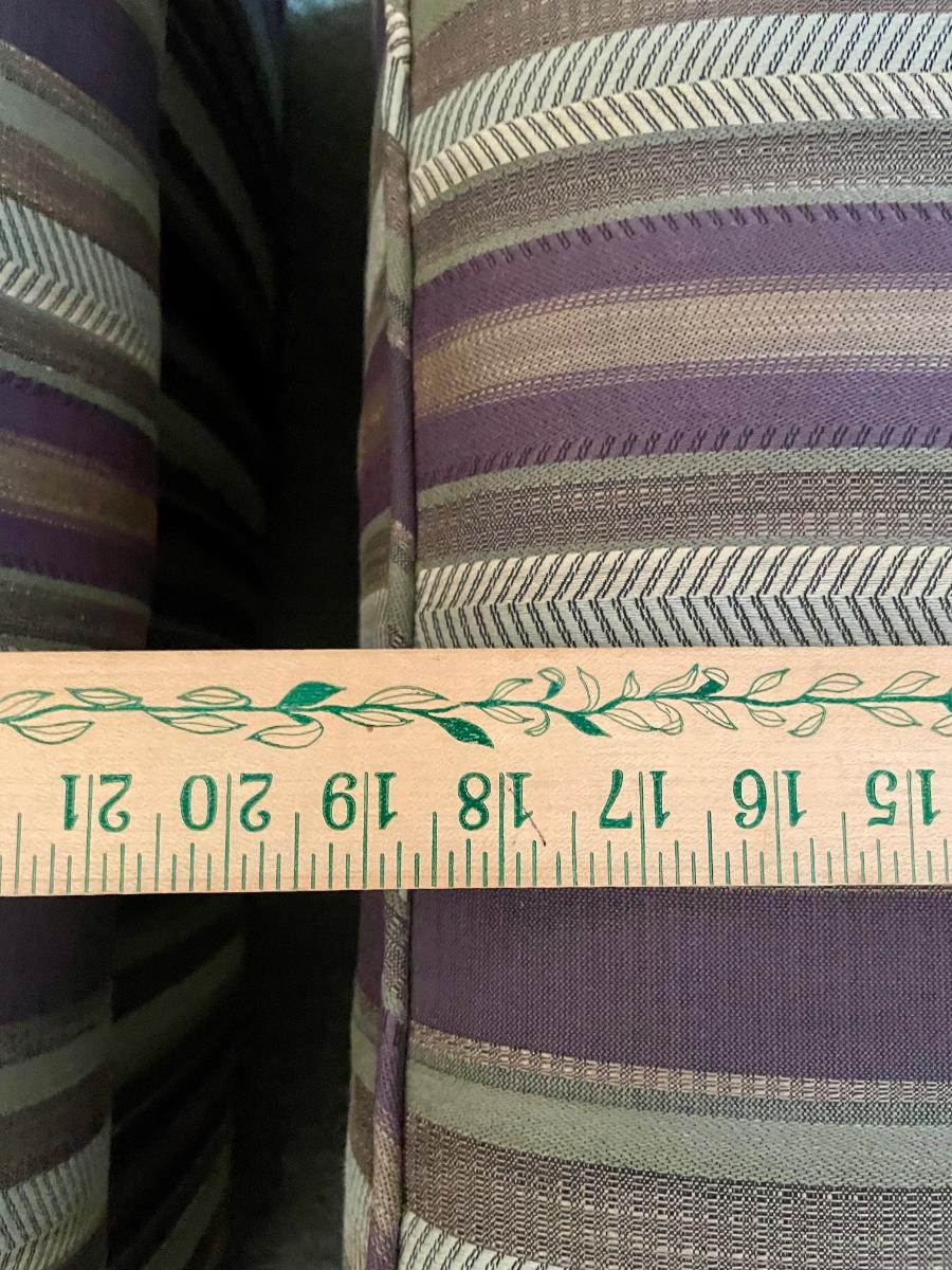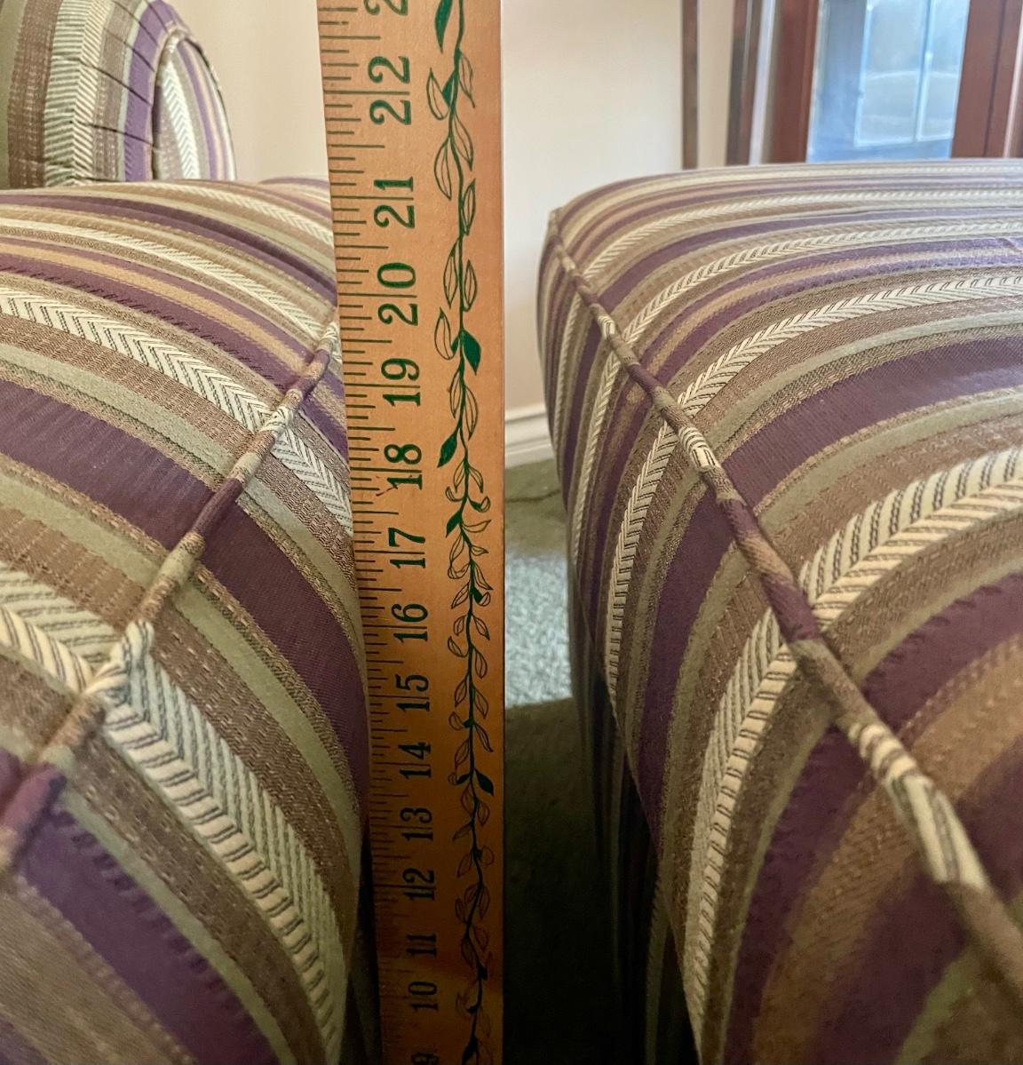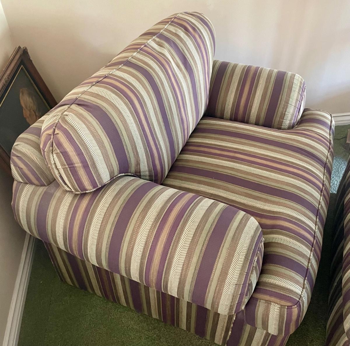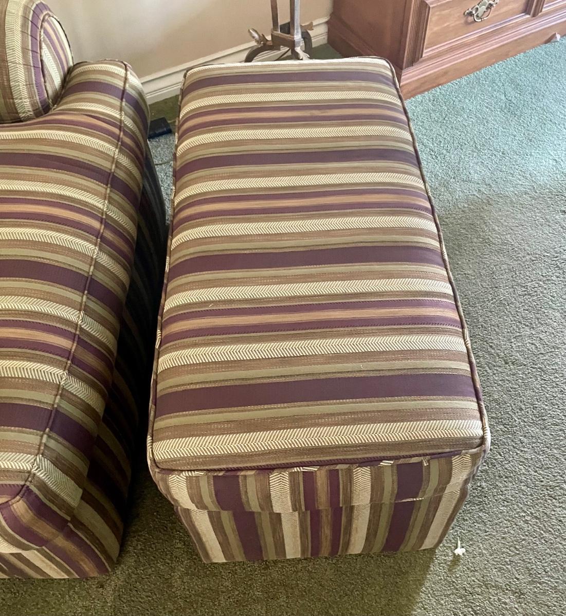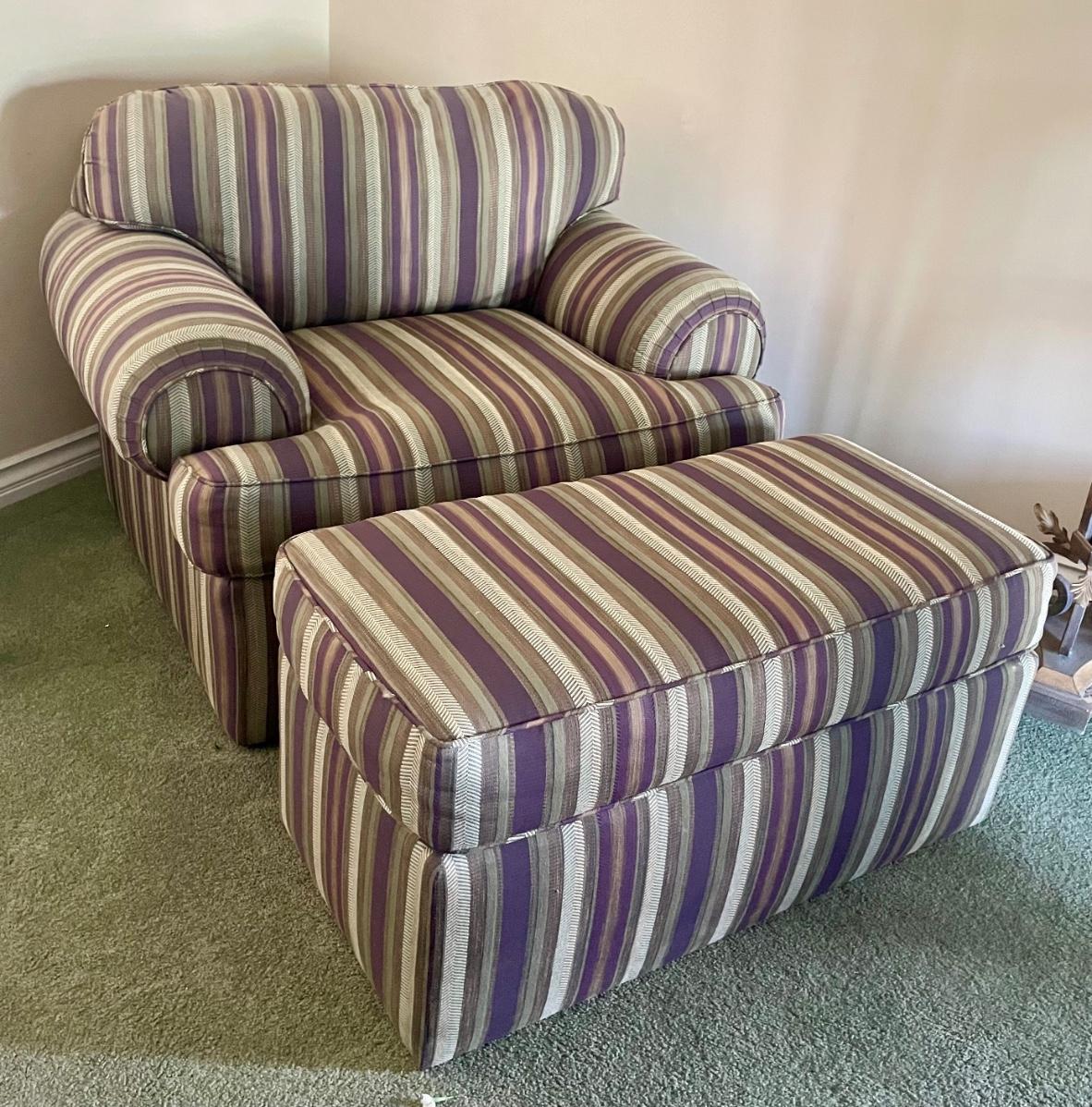 Measures: approx. 48” wide, 36” deep (chair only) and Ottoman is 20” x 40”. In good condition without wear marks.