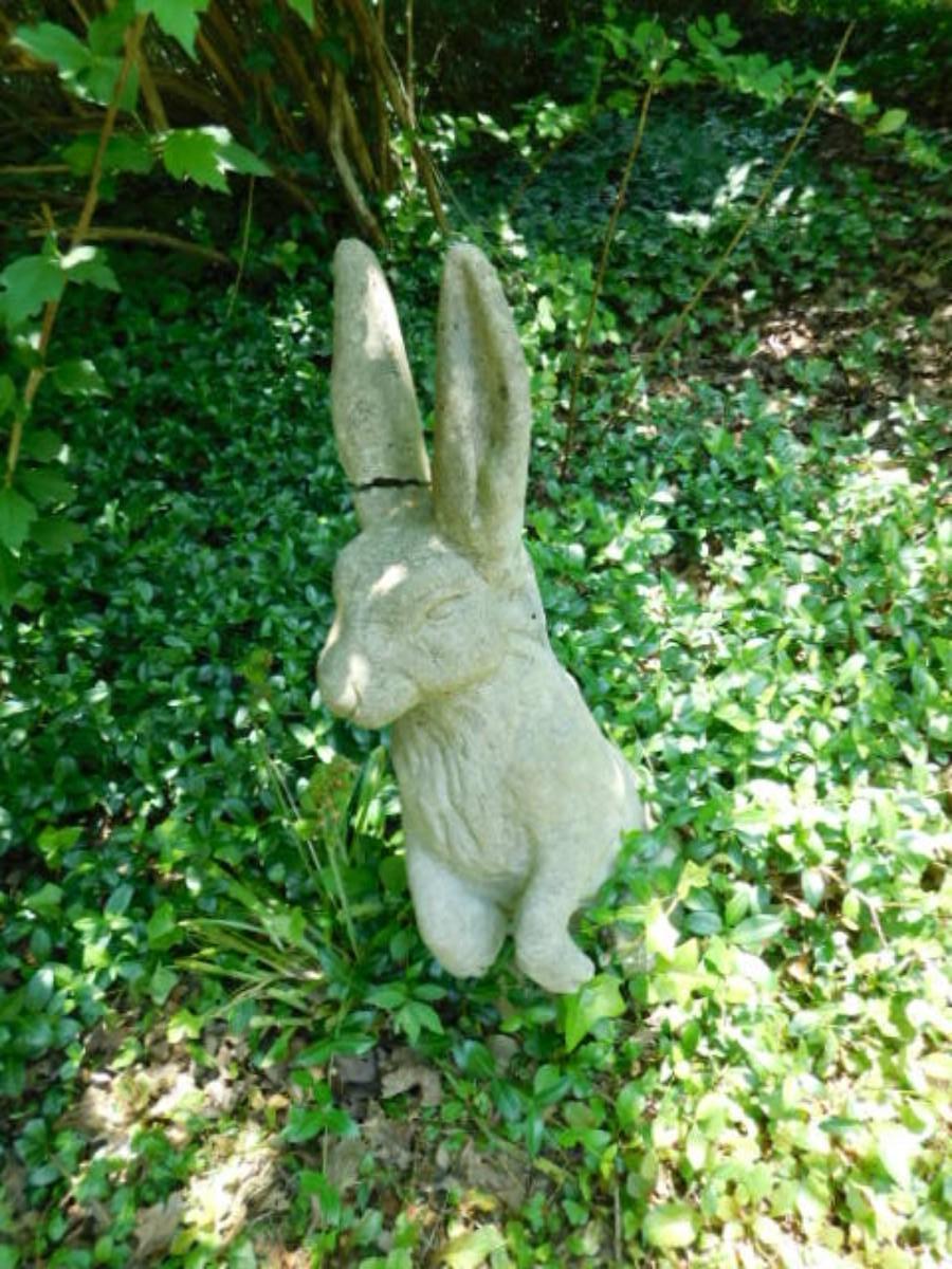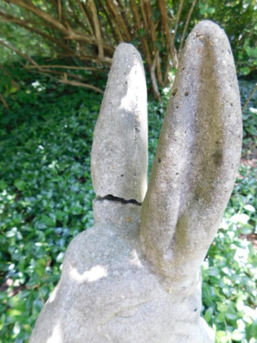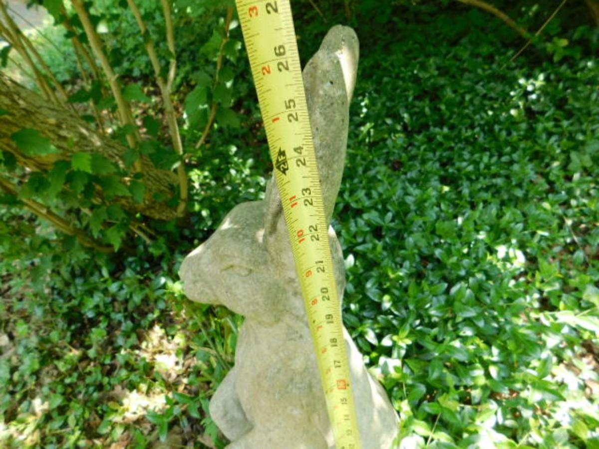 Large Concrete Rabbit Statuette. One Ear will need to be repaired as shown. Will need to bring help removing from yard. Expect weathering and color fade.