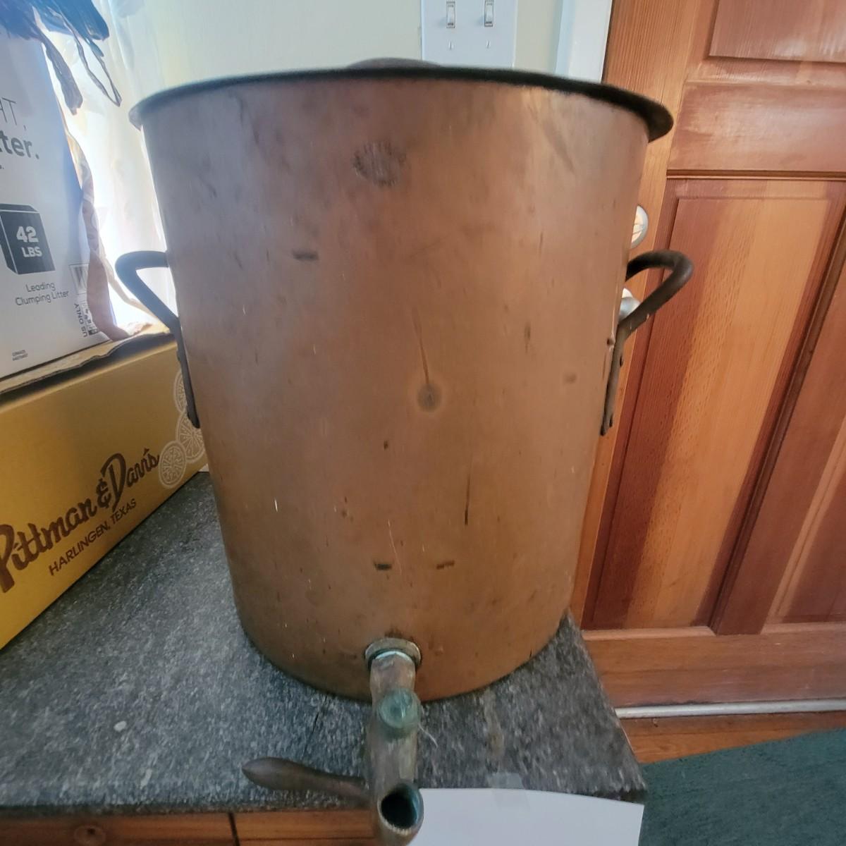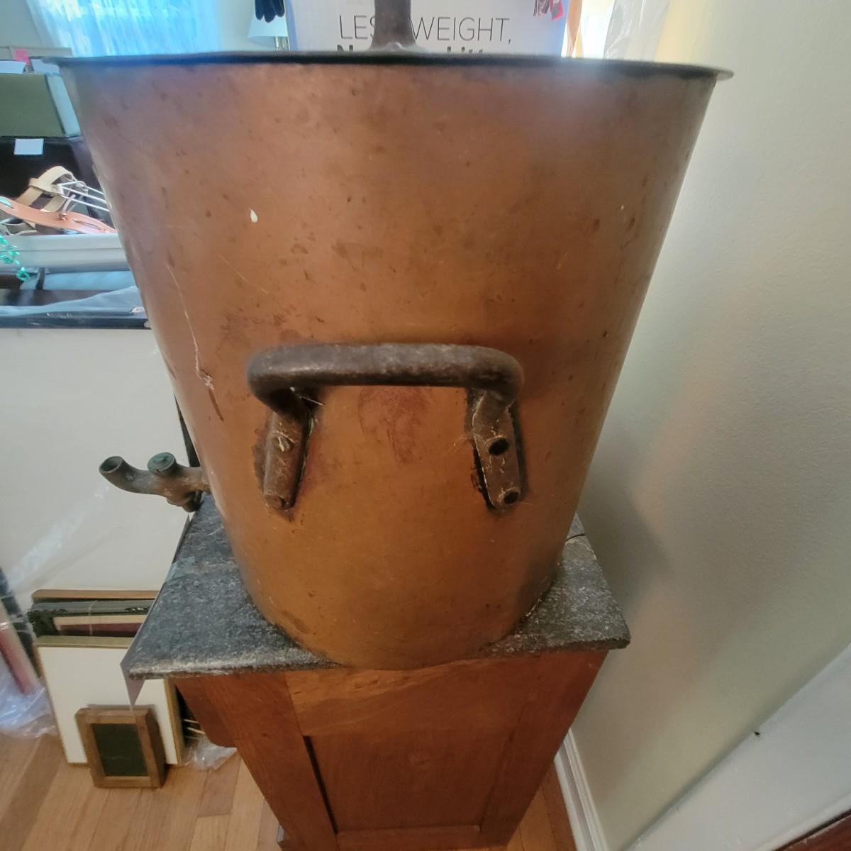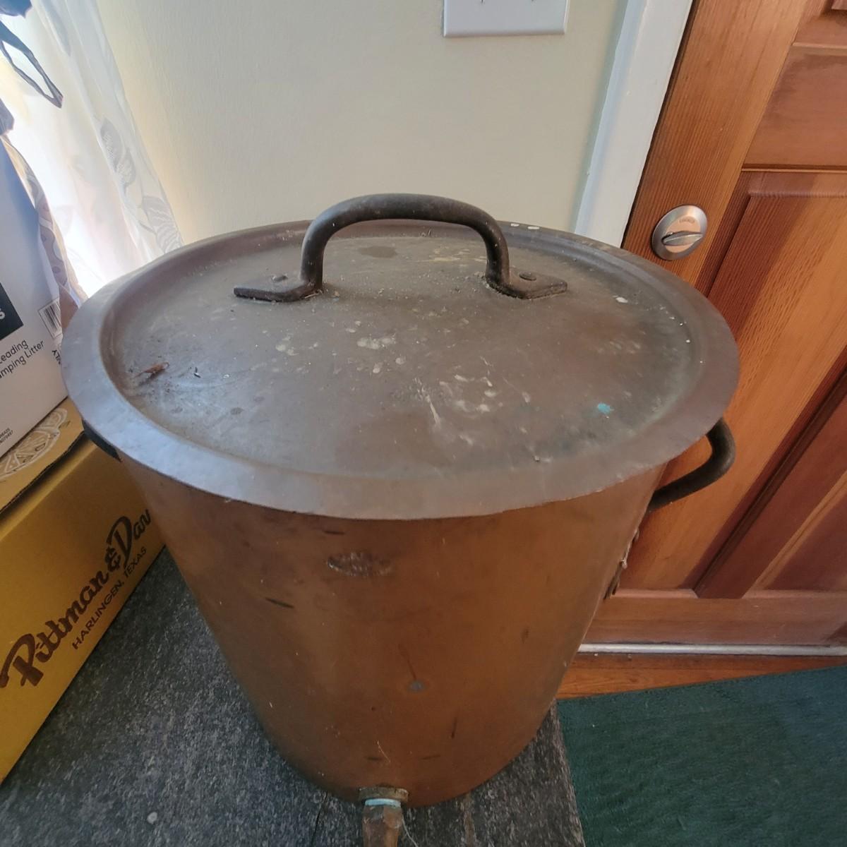 Large copper pot with lid and spout. Often used as water heaters on top of wood stoves. Pot is in good condition with no dents, but the spout is currently facing up and there is a patina on the interior of the pot. Measures approximately 14"d x 15" Local pickup only