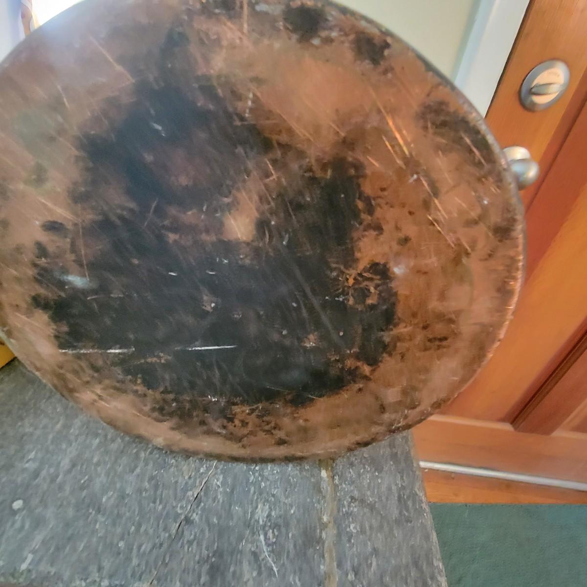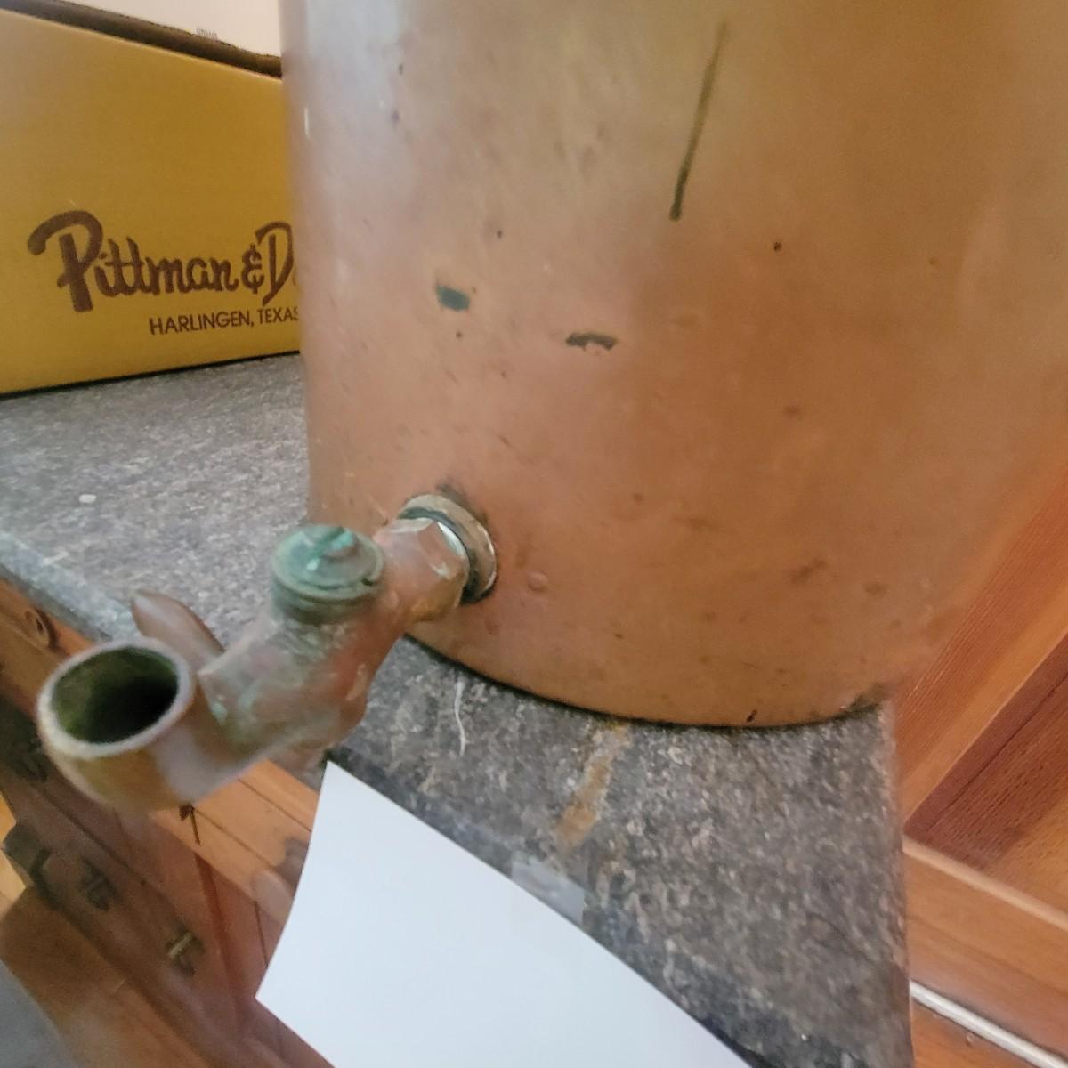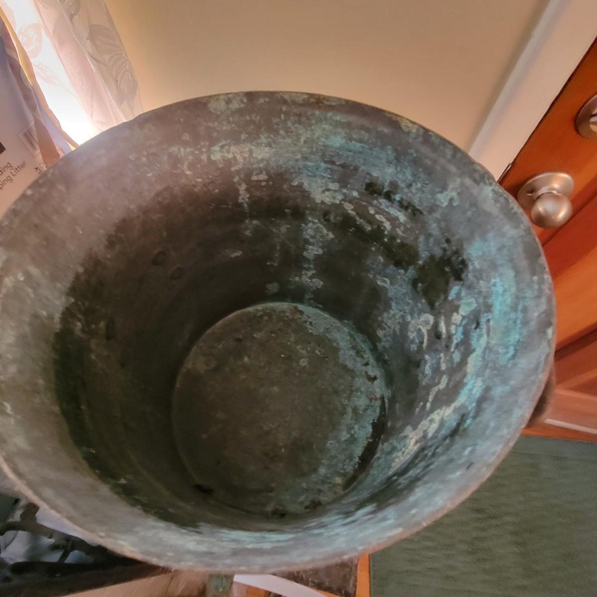 Large copper pot with lid and spout. Often used as water heaters on top of wood stoves. Pot is in good condition with no dents, but the spout is currently facing up and there is a patina on the interior of the pot. Measures approximately 14"d x 15" Local pickup only