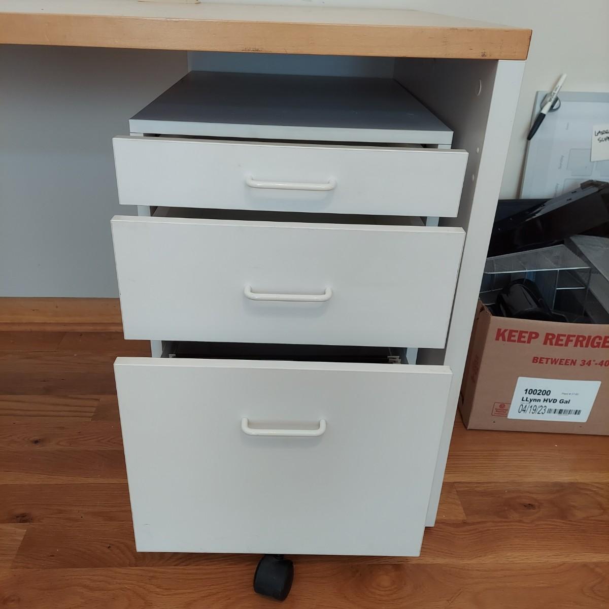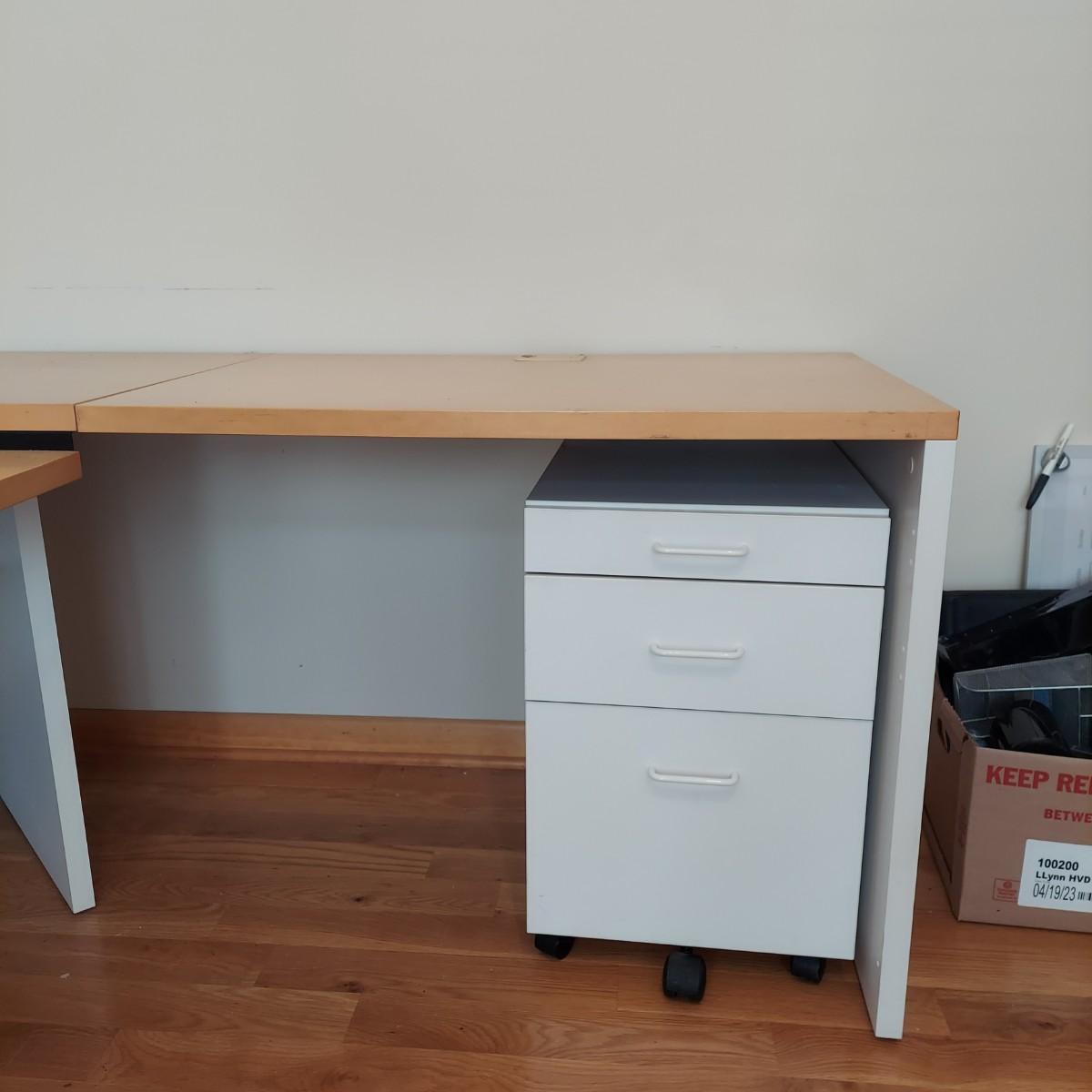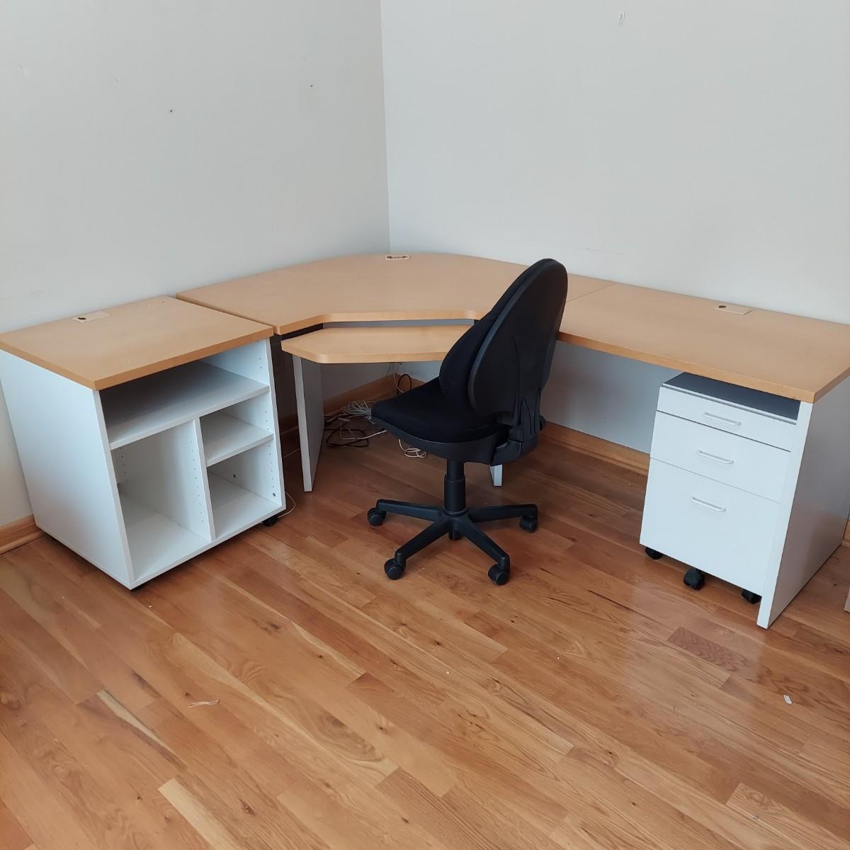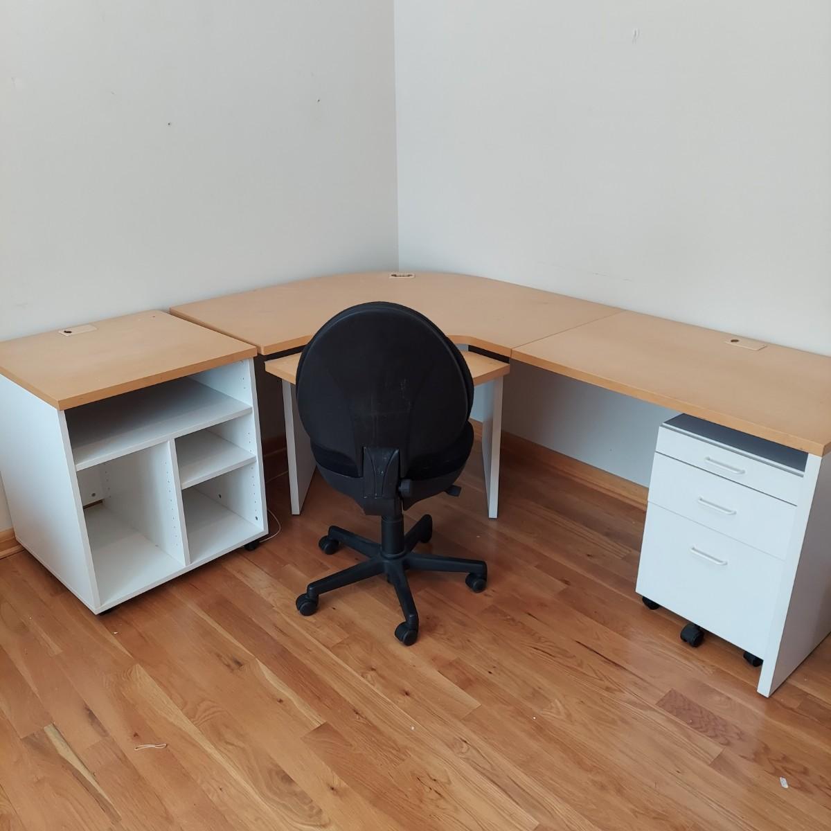 Large office corner desk. White pressed wood base with blonde wood top. The smaller section and white wood filing cabinet are on wheels. Also comes with an office chair. Will need to be taken apart in the middle and winning bidder will need a Phillips head screwdriver to dismantle. The right side of the desk (the larger side) measures 81” x 45” x 21H”. The smaller section measures 24”square x 29”H, adding this piece to the main desk would reach 69”, the rounded corner to the keyboard shelf is 45.5”. Local Pickup Only. Winning bidder must bring assistance to help move and load this item due to its weight and/or size.