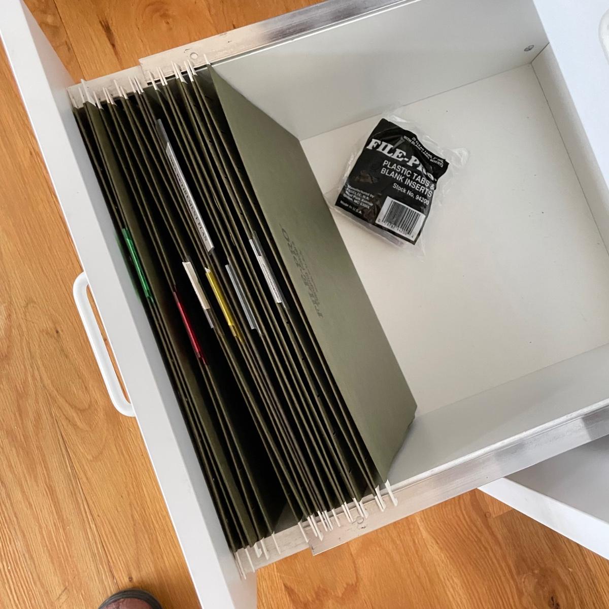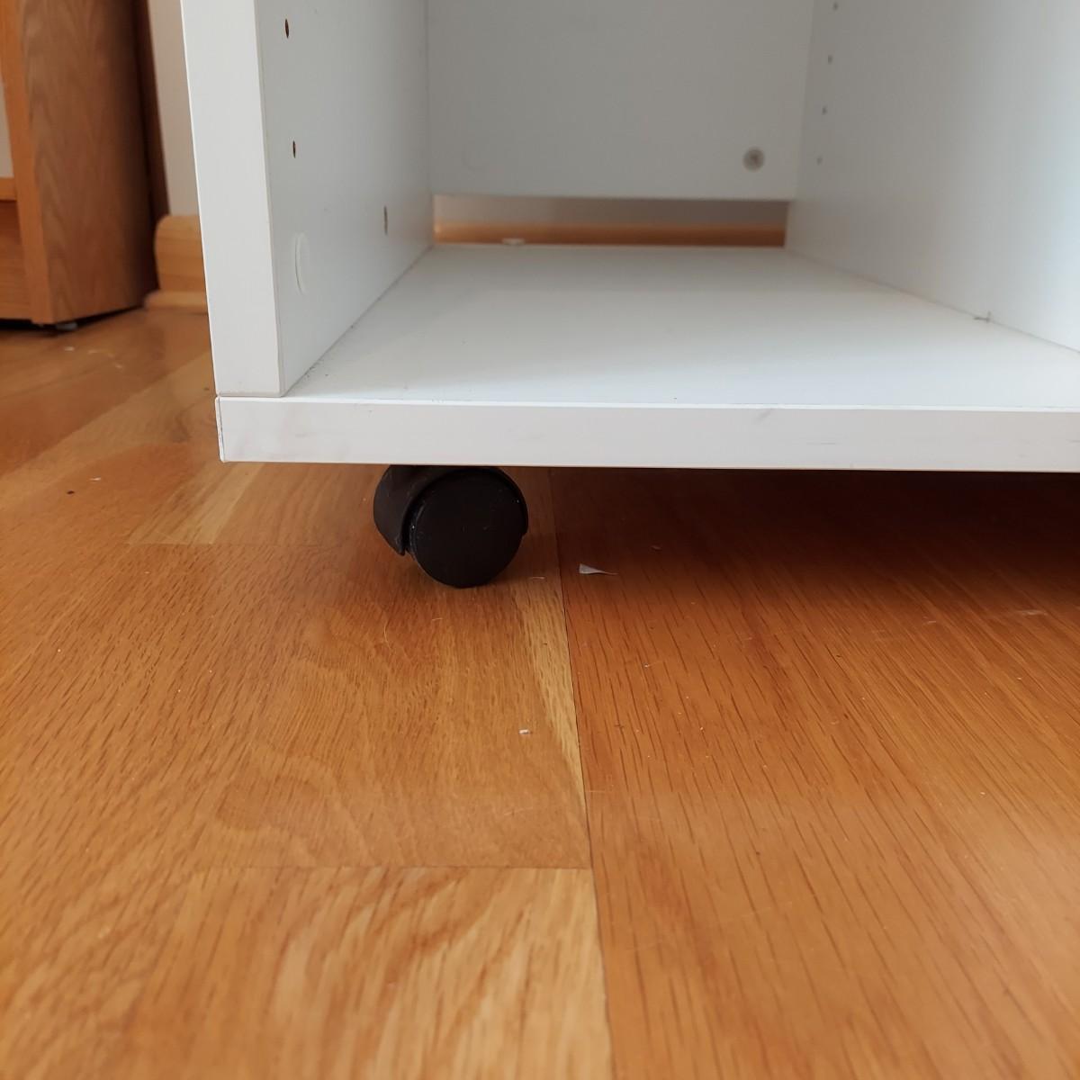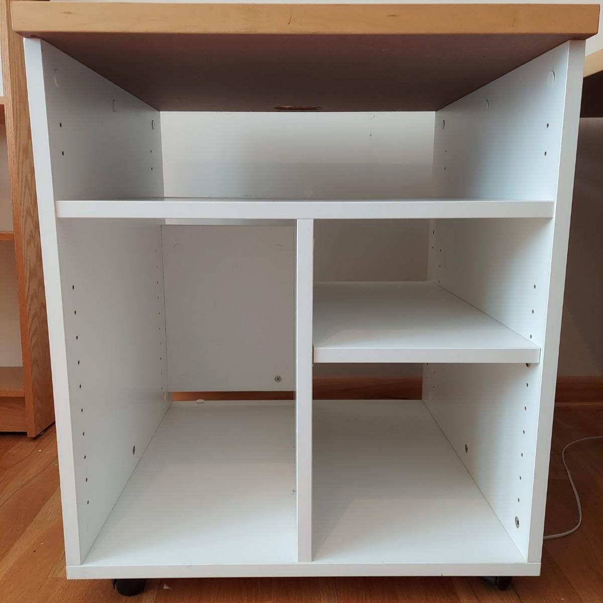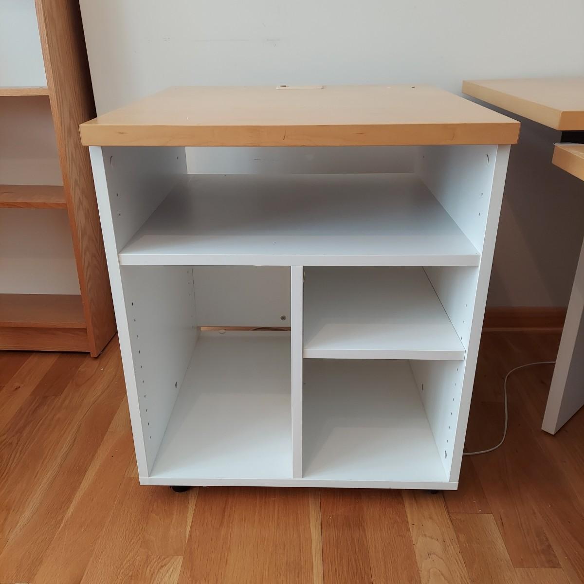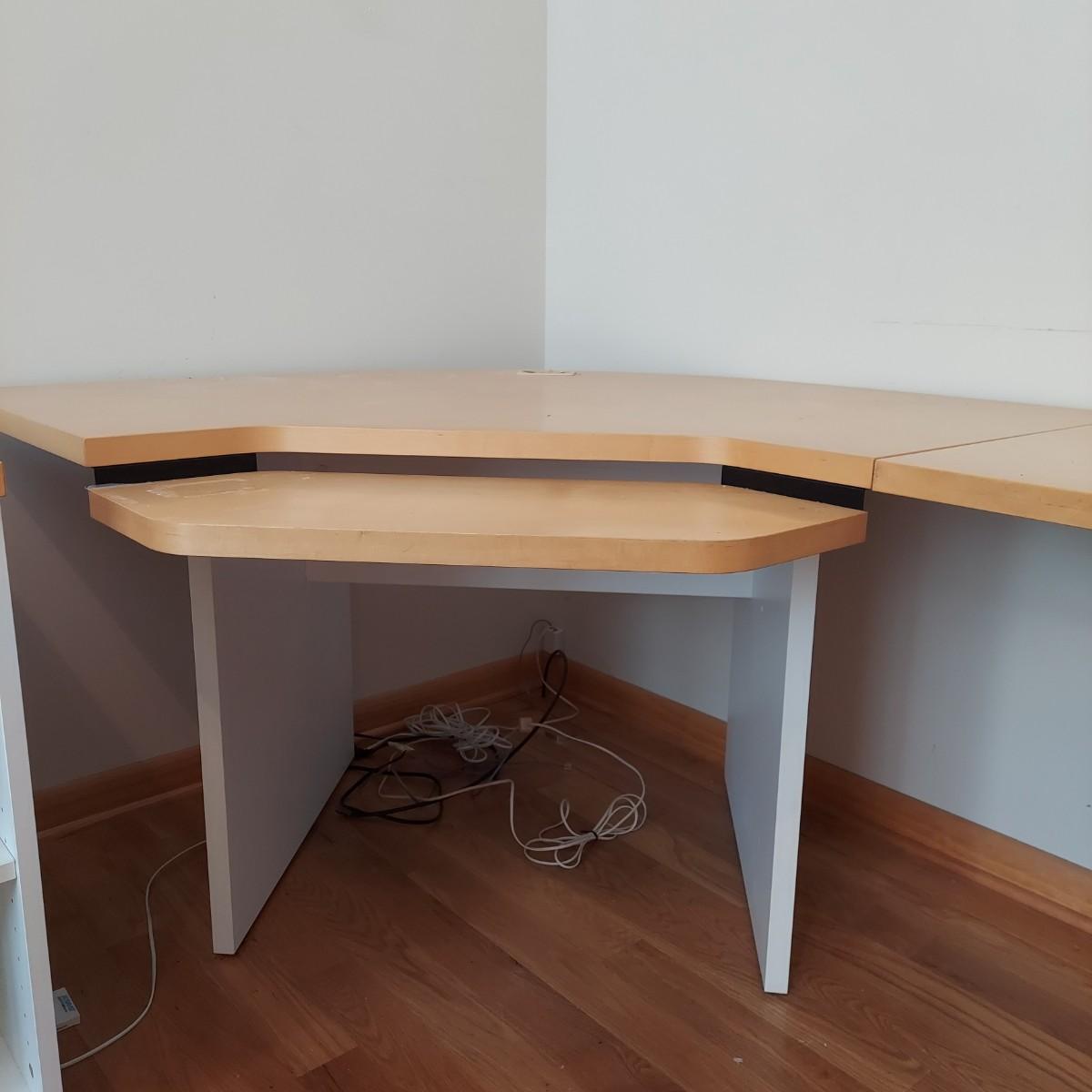 Large office corner desk. White pressed wood base with blonde wood top. The smaller section and white wood filing cabinet are on wheels. Also comes with an office chair. Will need to be taken apart in the middle and winning bidder will need a Phillips head screwdriver to dismantle. The right side of the desk (the larger side) measures 81” x 45” x 21H”. The smaller section measures 24”square x 29”H, adding this piece to the main desk would reach 69”, the rounded corner to the keyboard shelf is 45.5”. Local Pickup Only. Winning bidder must bring assistance to help move and load this item due to its weight and/or size.