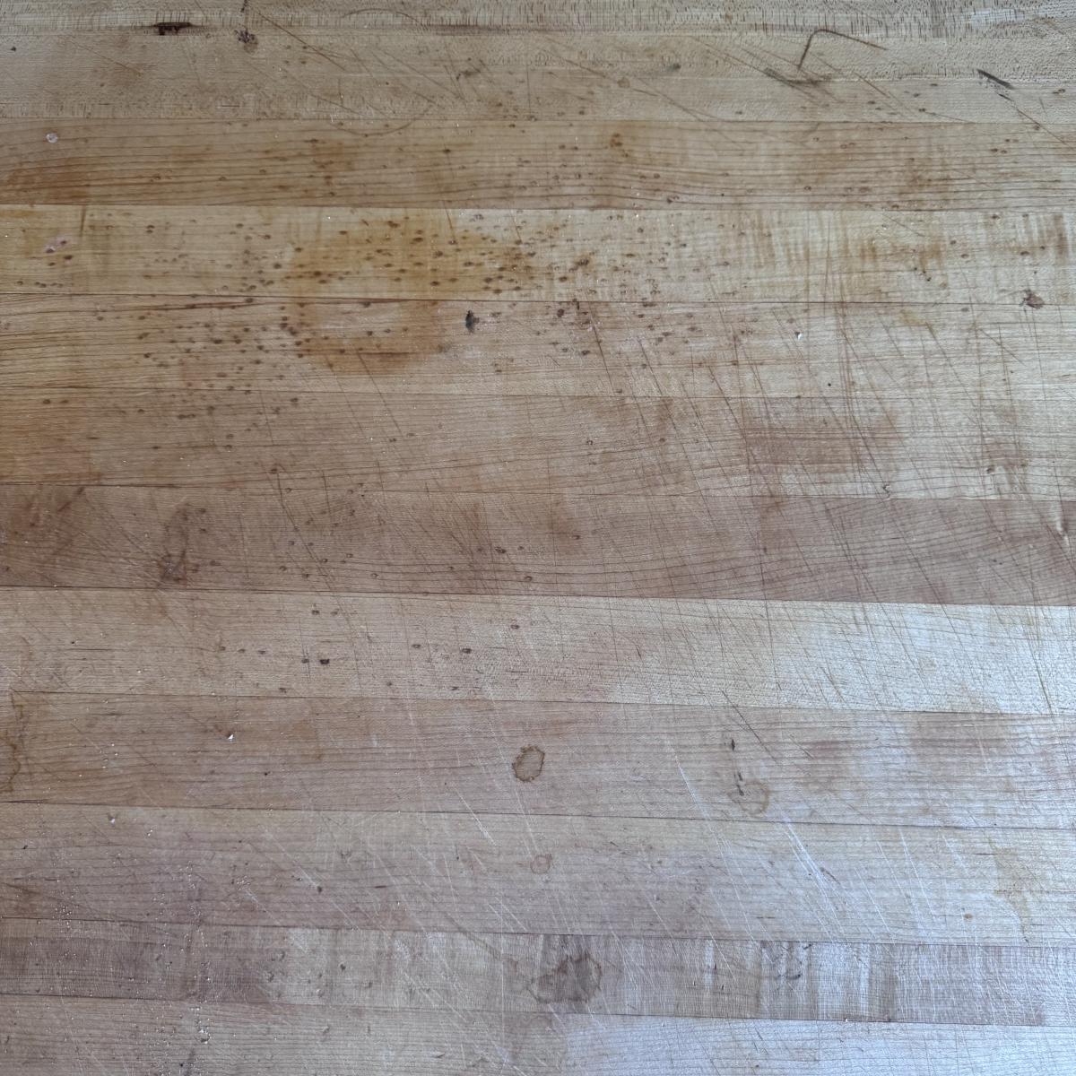 This lot includes one large countertop butcher block. It’s a sturdy piece that has been well maintained and used. There are stains and knife marks throughout - see pictures included. It measures 29.25” x 24.95” x 1.5”H. Local pickup only.