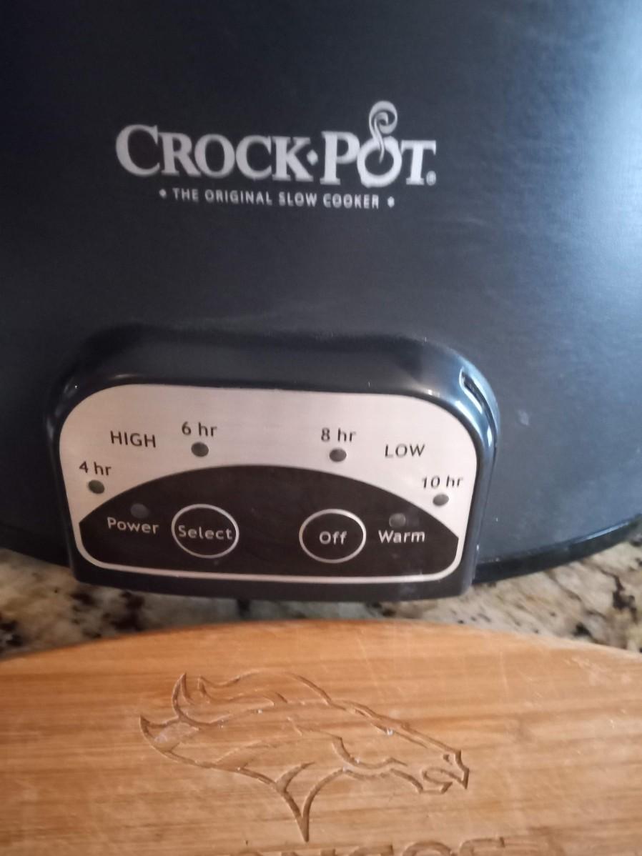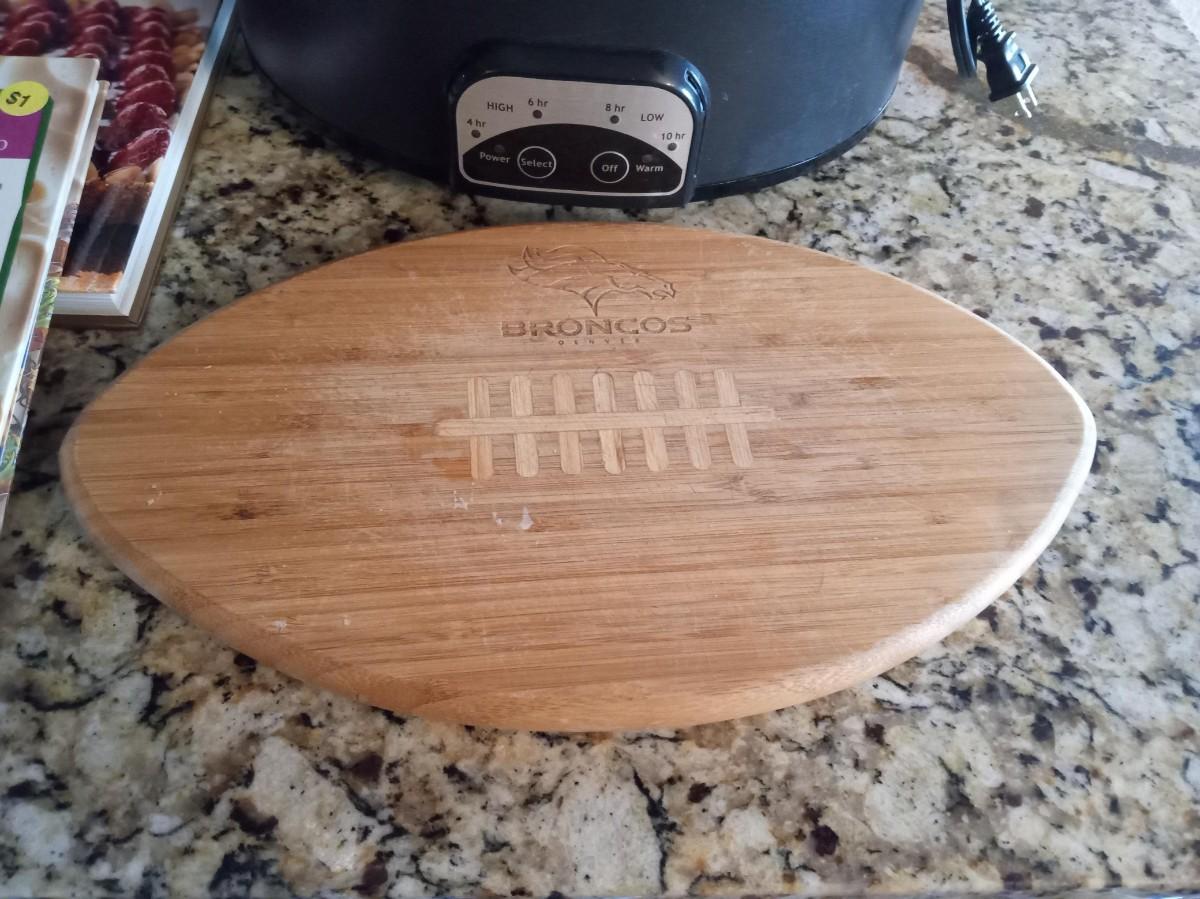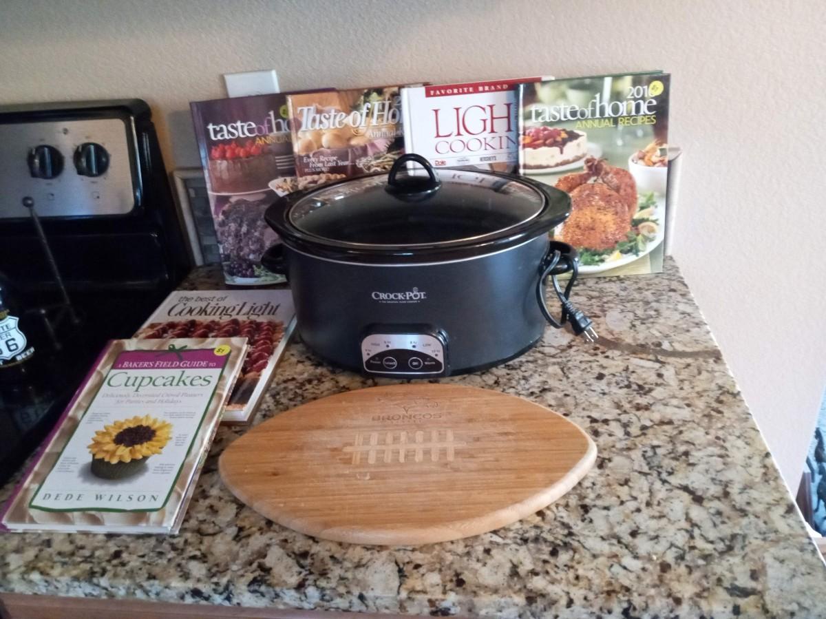 LARGE CROCK POT, DENVER BRONCOS CUTTING BOARD AND COOKBOOKS