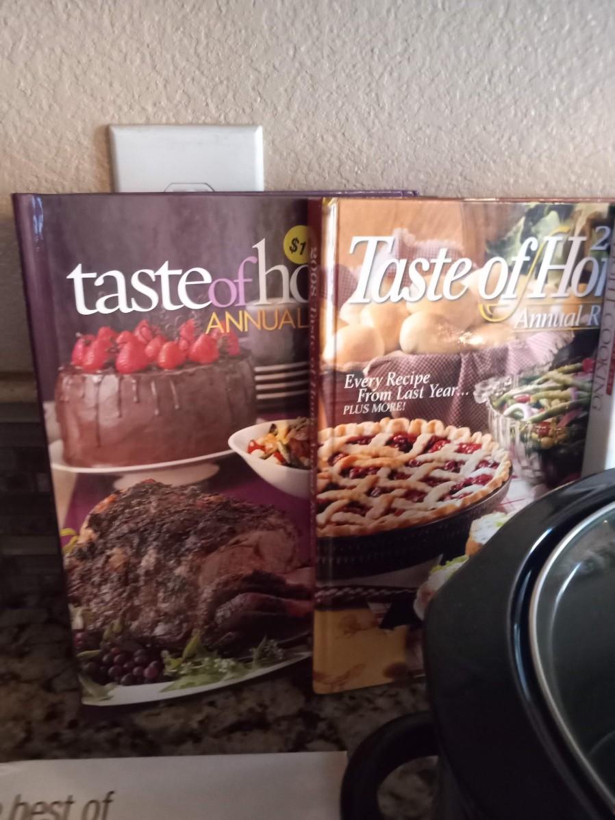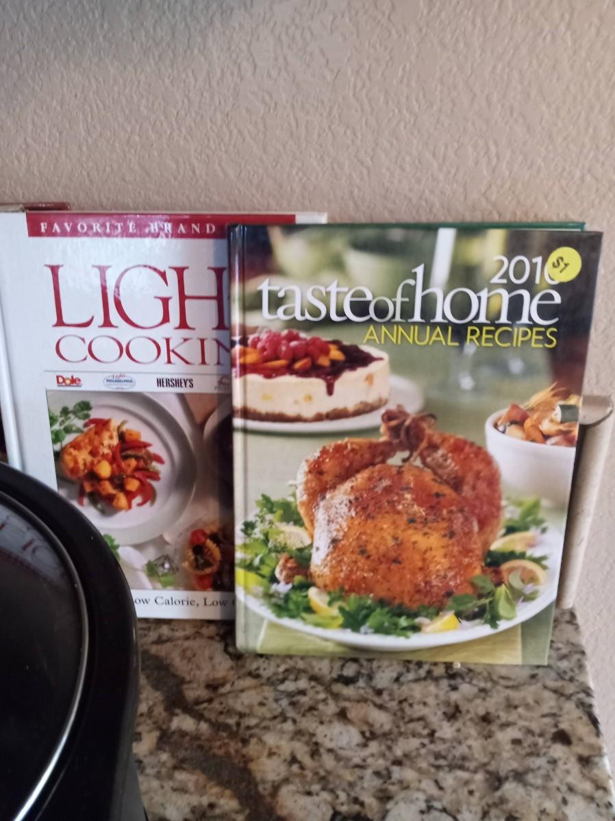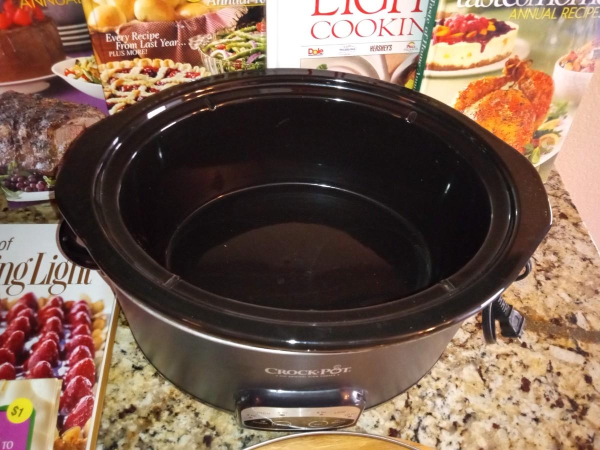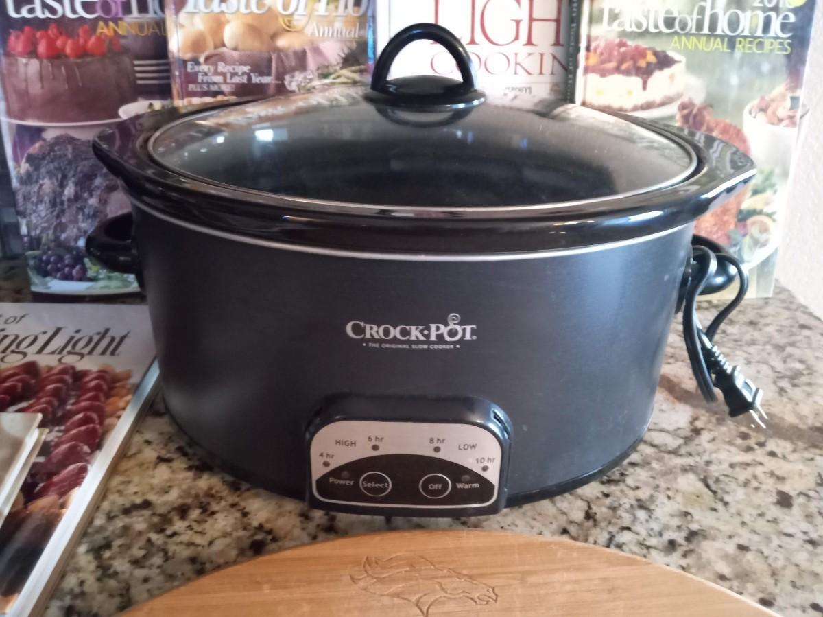 LARGE CROCK POT, DENVER BRONCOS CUTTING BOARD AND COOKBOOKS