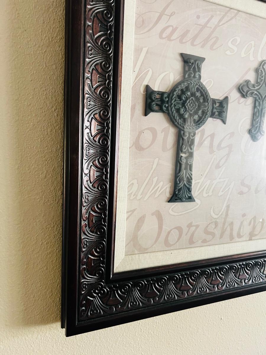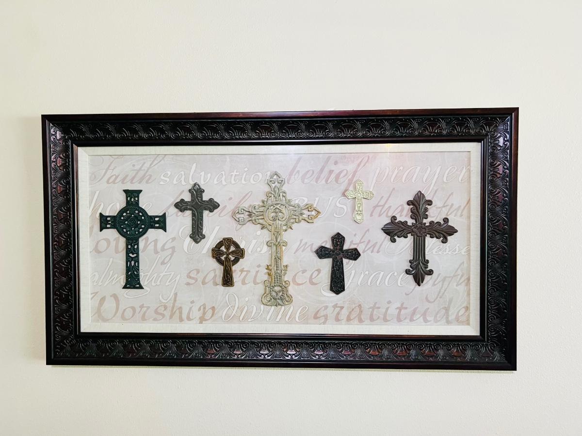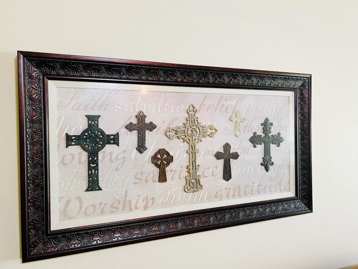 Large framed Cross Picture measures 22 1/2 inches tall, 41 1/2 inches wide and 1 1/2 inches deep