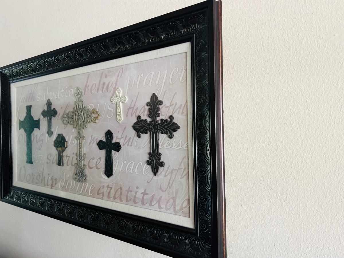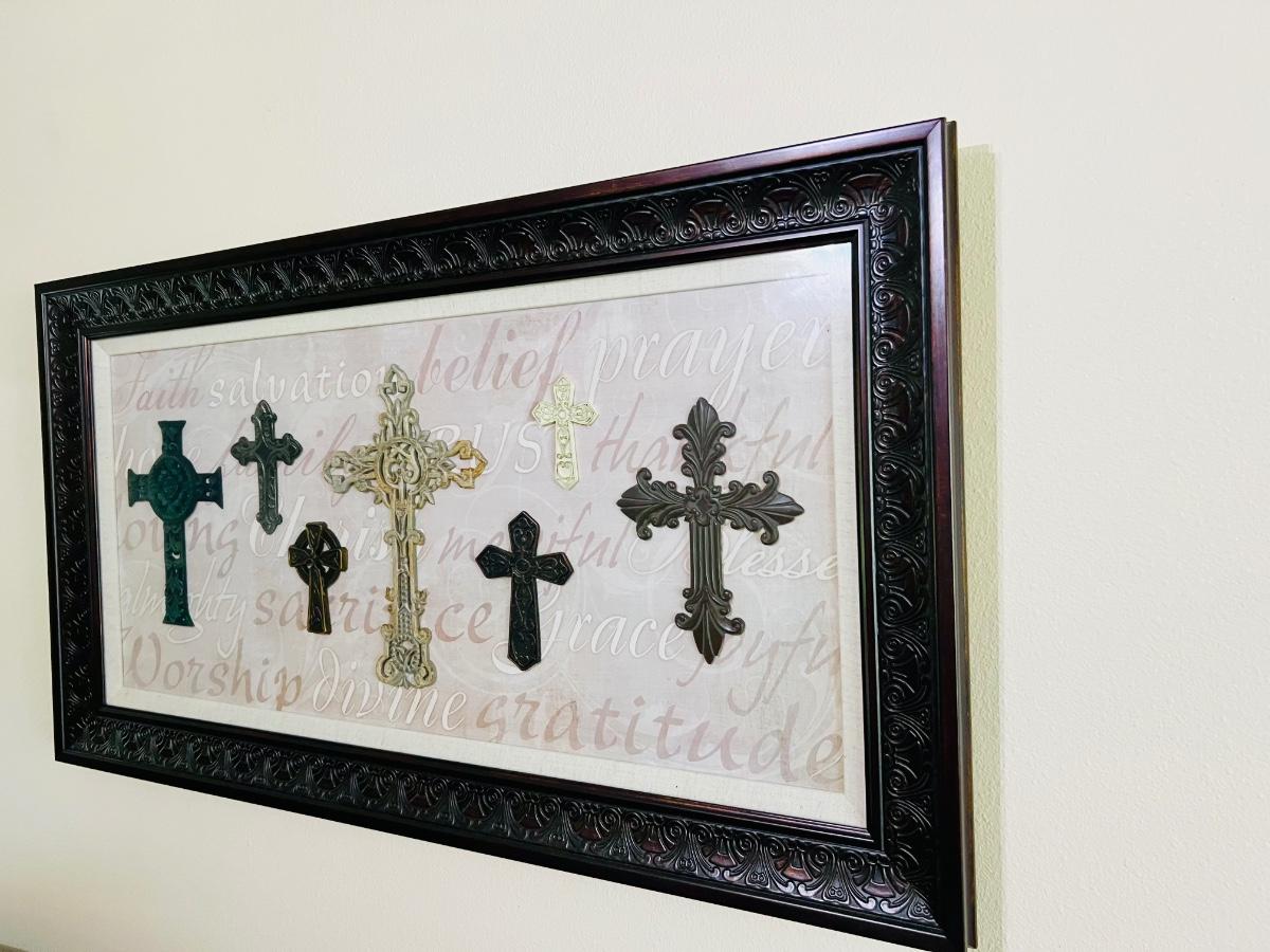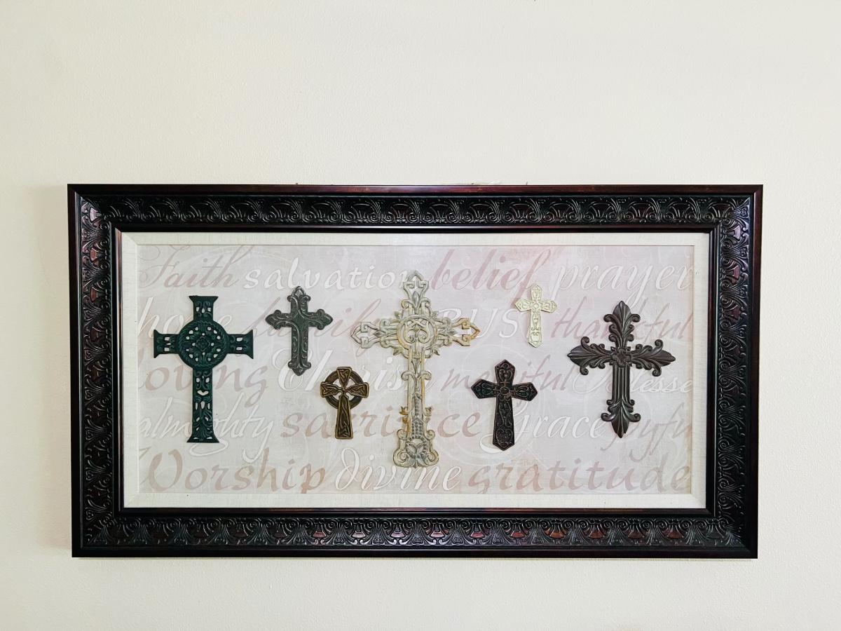 Large framed Cross Picture measures 22 1/2 inches tall, 41 1/2 inches wide and 1 1/2 inches deep