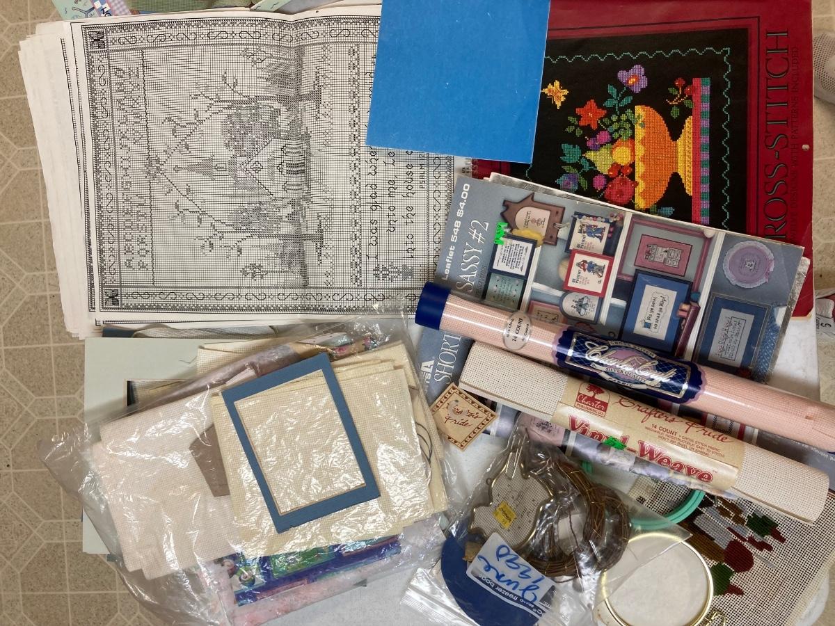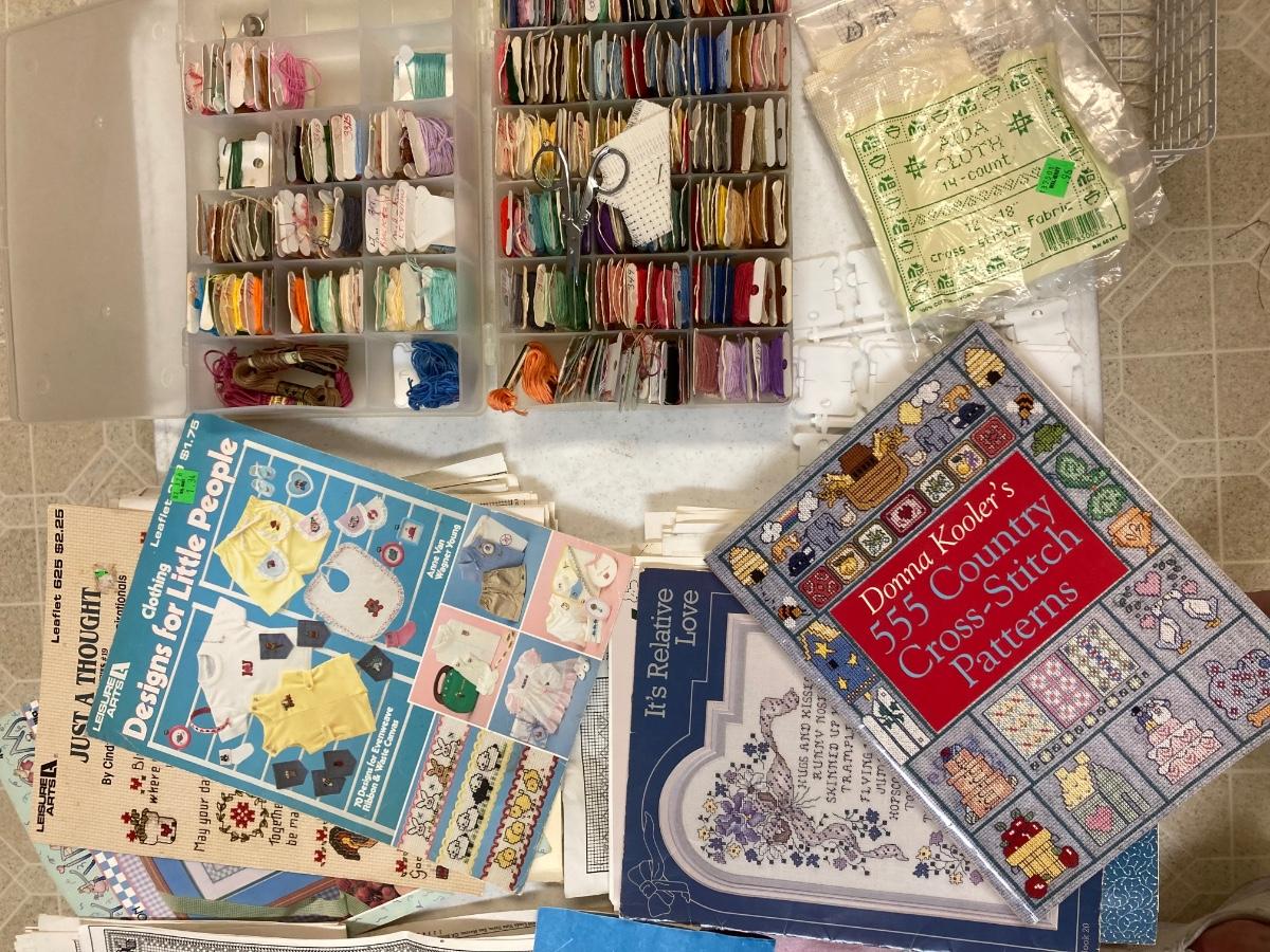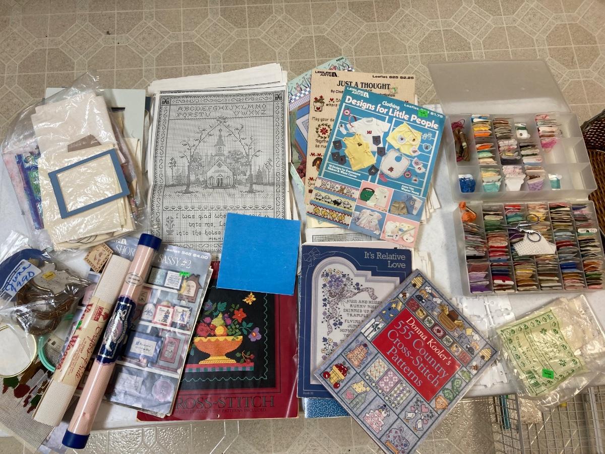 Large cross stitch lot. Thread, patterns, books, fabric, frames, etc.