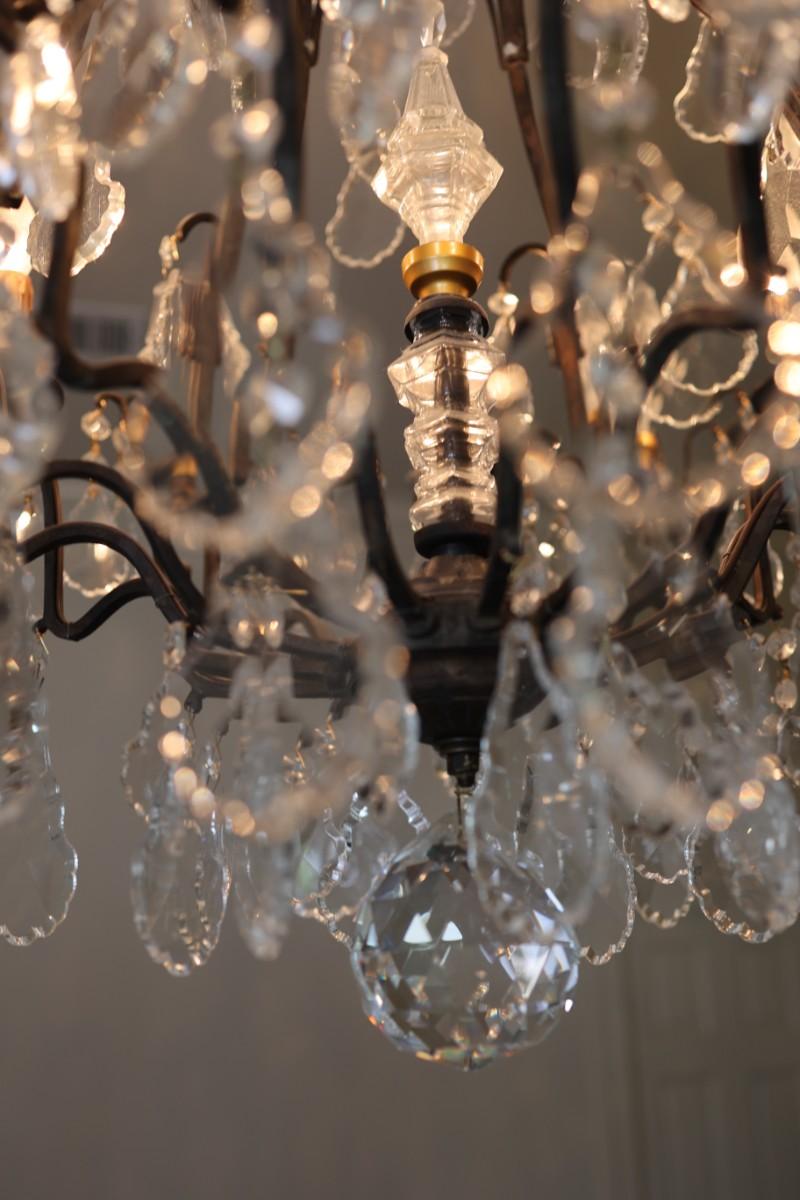 Elegant multi-tiered chandelier adorned with high-quality, faceted real crystal prisms and finished with a large crystal ball finial.