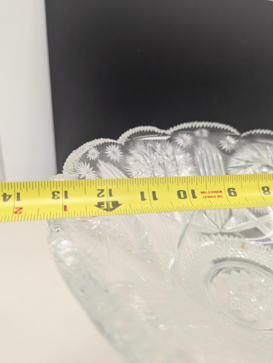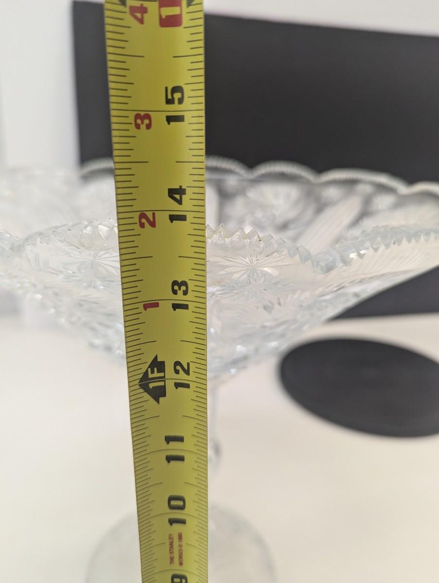 This large cut glass centerpiece stands at 14 1/2" tall, making it a striking and elegant addition to any collection or display. The intricate design and craftsmanship of the piece add a touch of sophistication to any room. The cut glass material adds a touch of luxury and prestige to the overall aesthetic, making it a standout piece for collectors or those who appreciate fine decor.