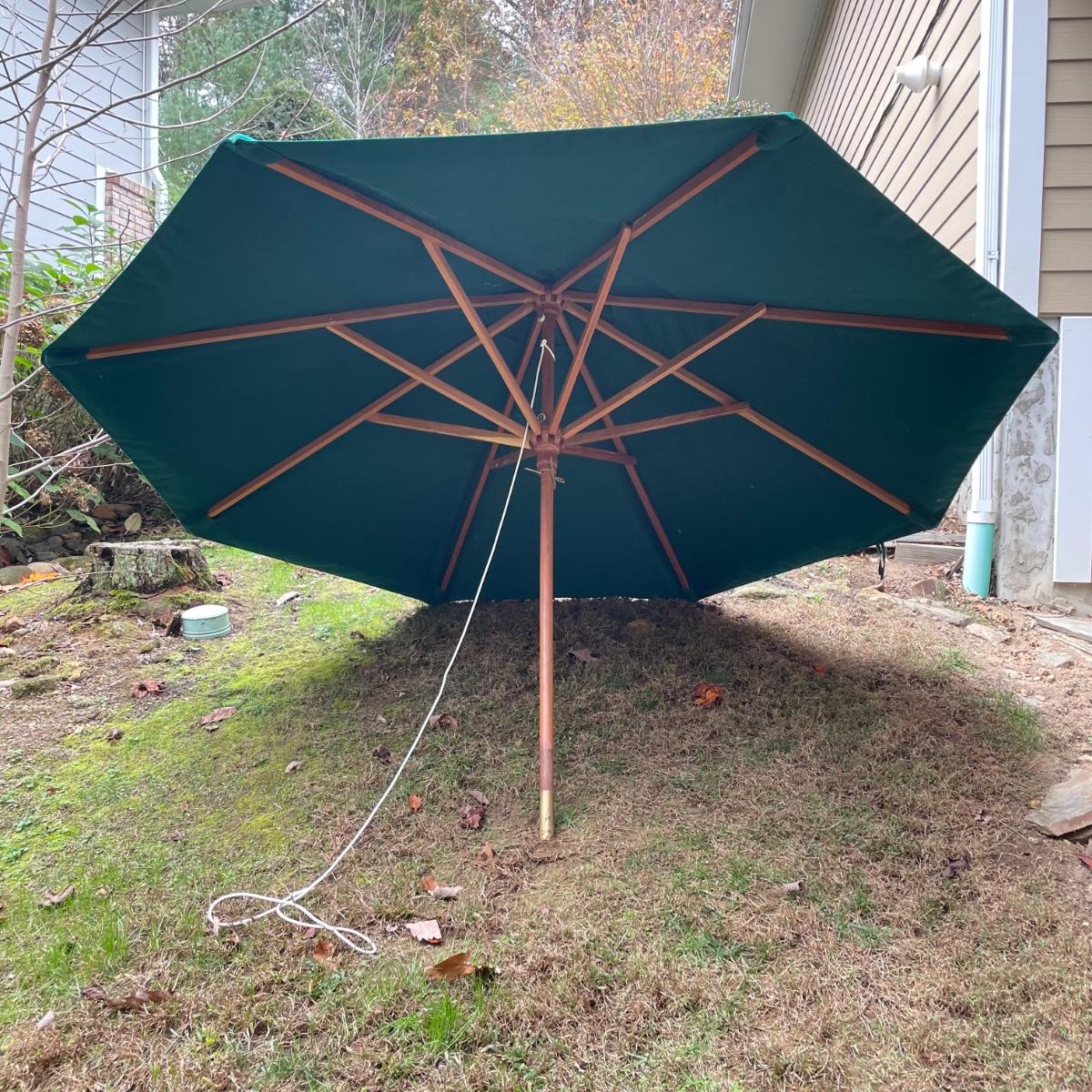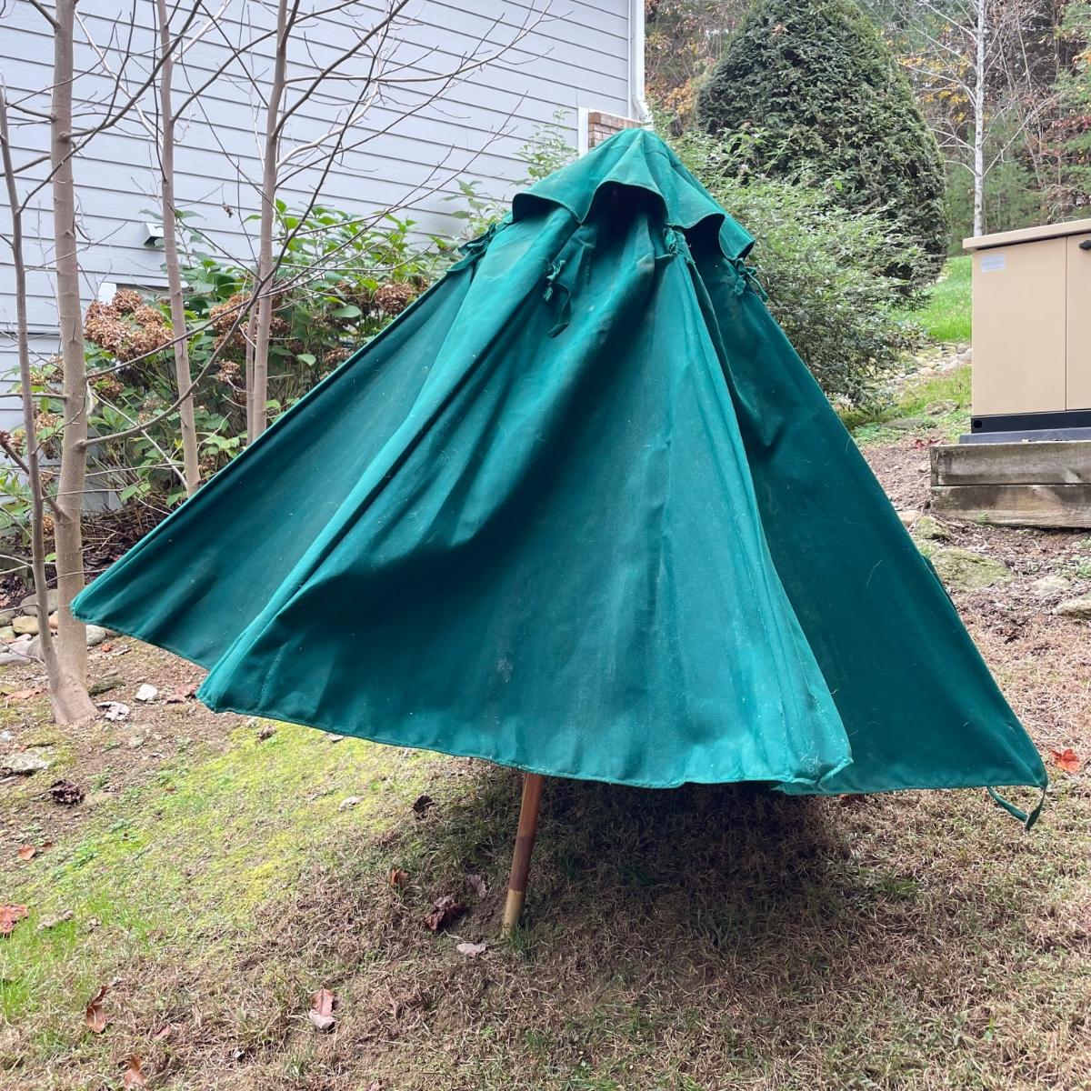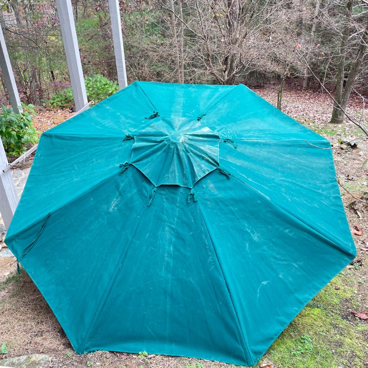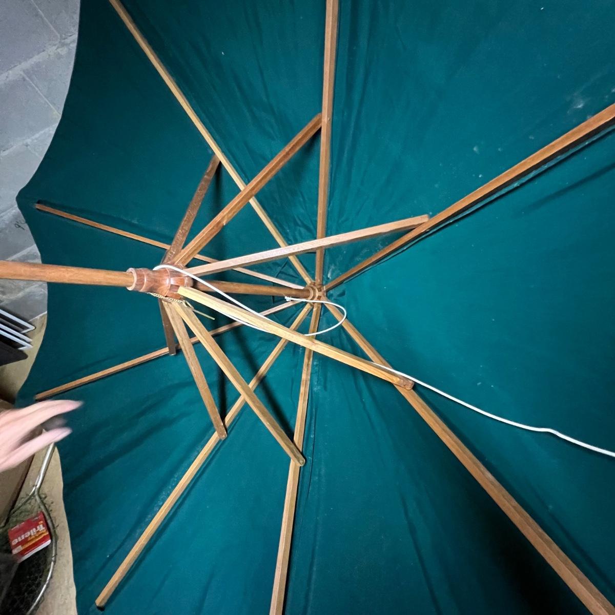 This large well made patio table umbrella has a wood frame , brass fittings and a durable dark green fabric shade. It measures 104” x 106”H.