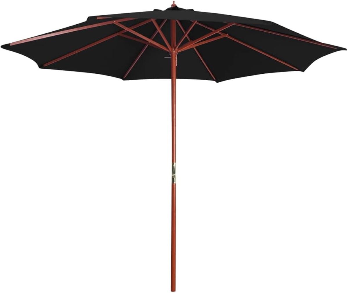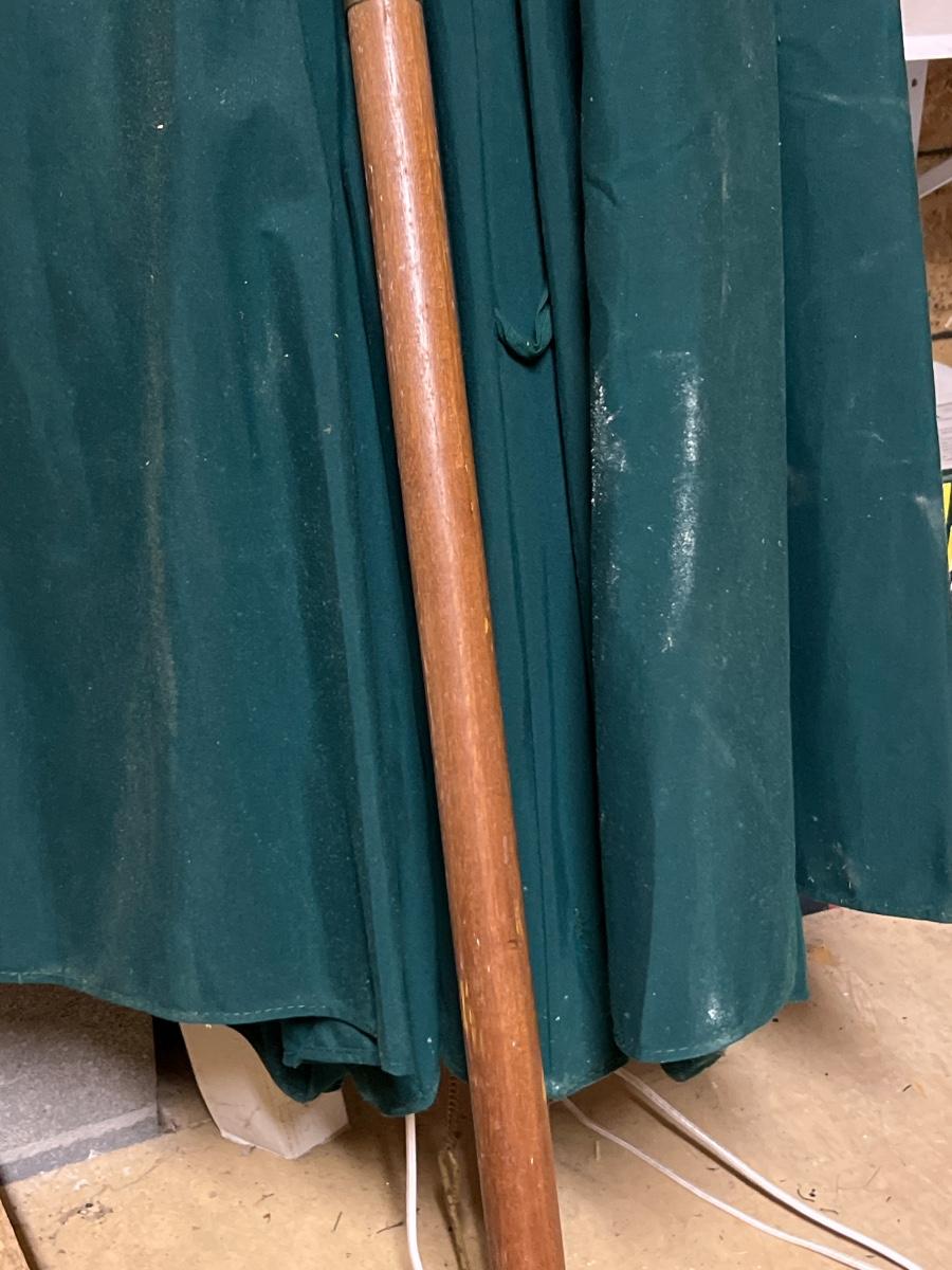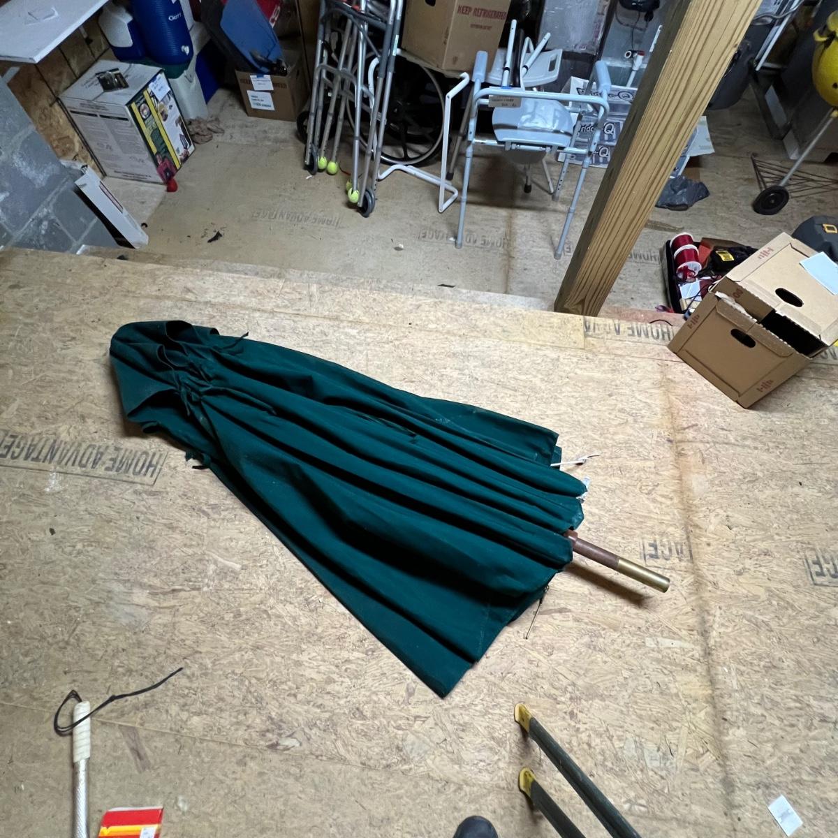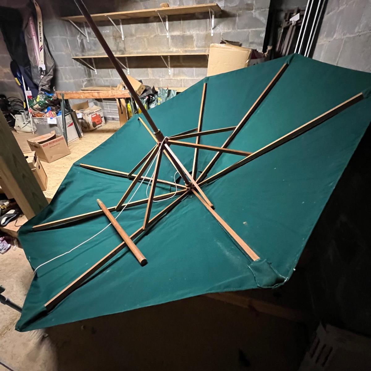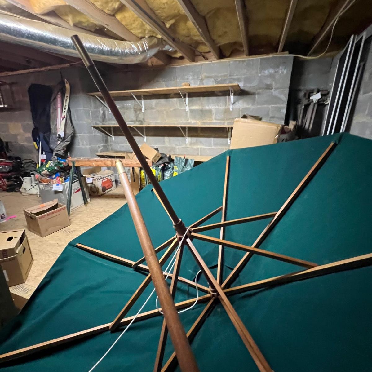 This large well made patio table umbrella has a wood frame , brass fittings and a durable dark green fabric shade. It measures 104” x 106”H.