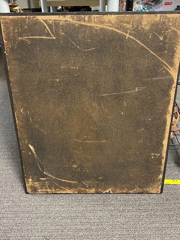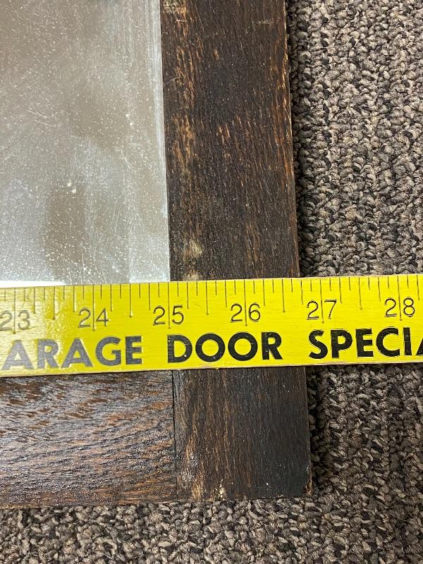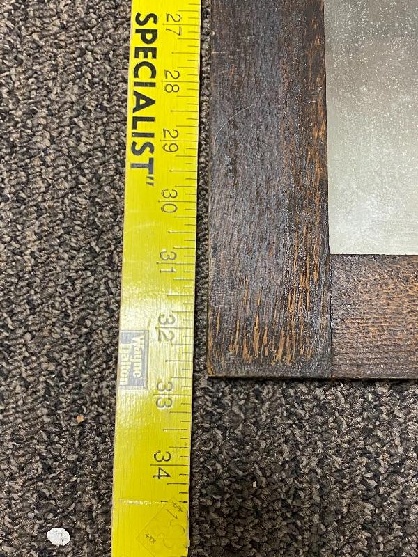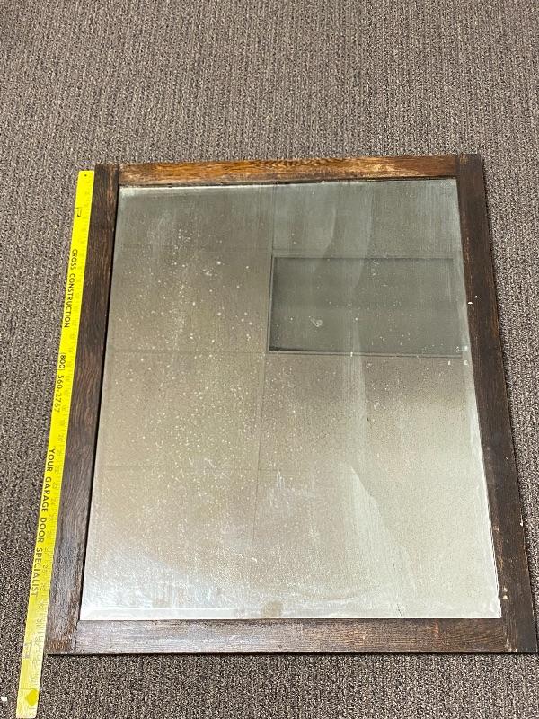 Large dark finished wood framed mirror. Heavy thick glass. Measures roughly 33"x27". Does not have any hanging brackets on the back. Old mirror, has some speckling.