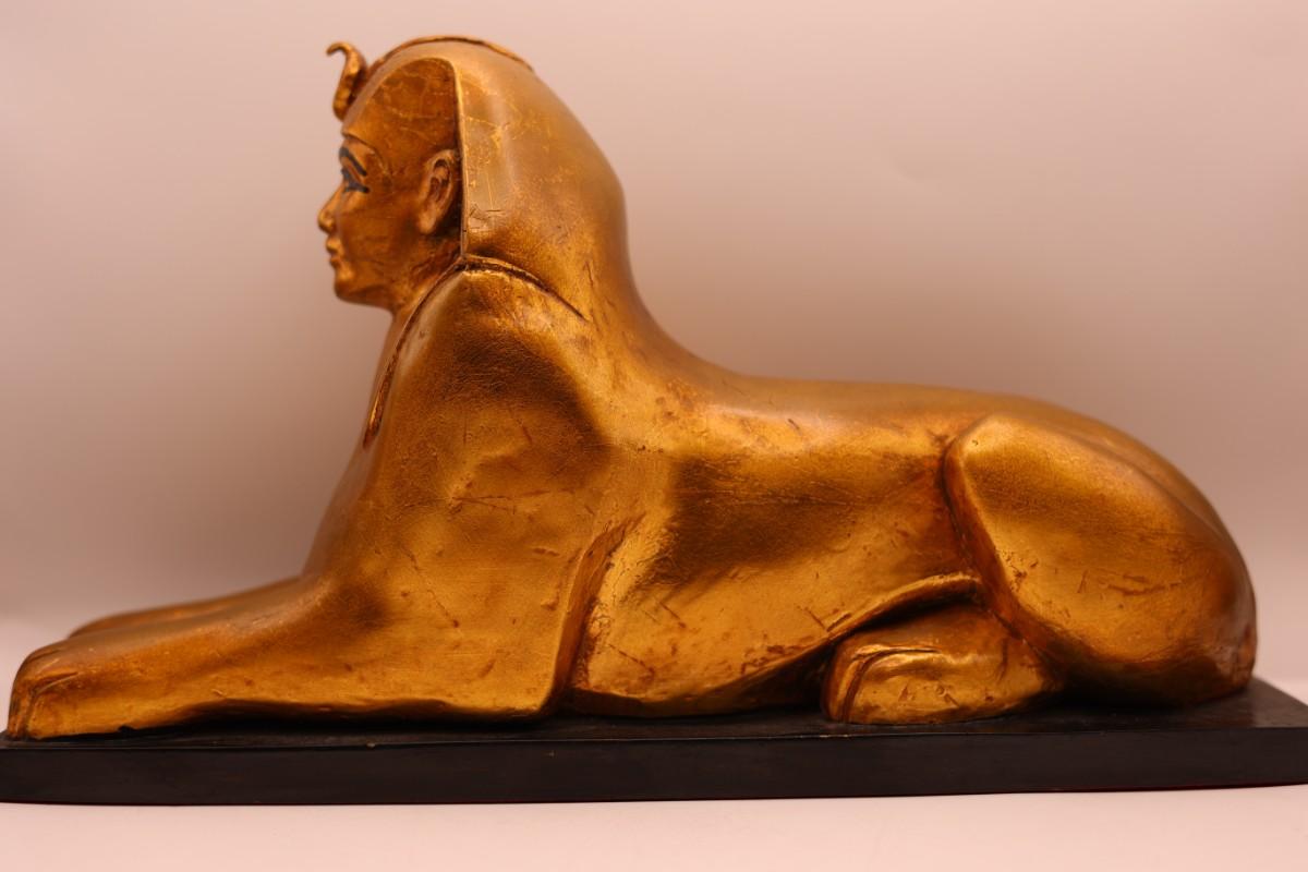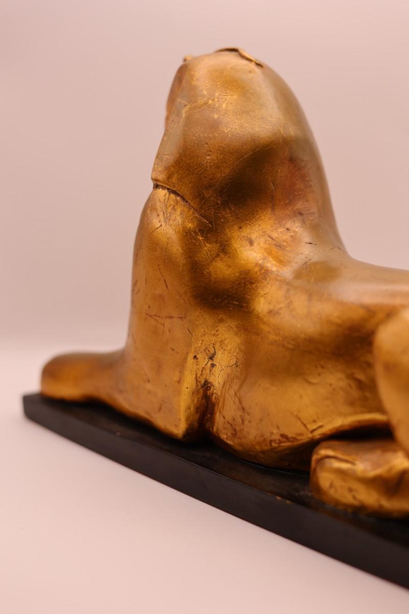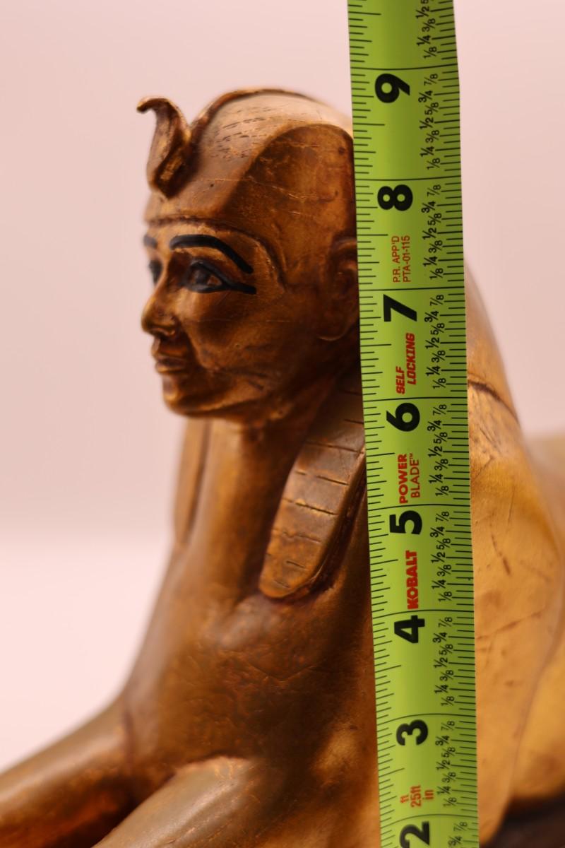 Decorative Egyptian-style sphinx figure with gilt finish on a rectangular base. Marked © T.E.I. ’83 on underside. See photos for details and condition.