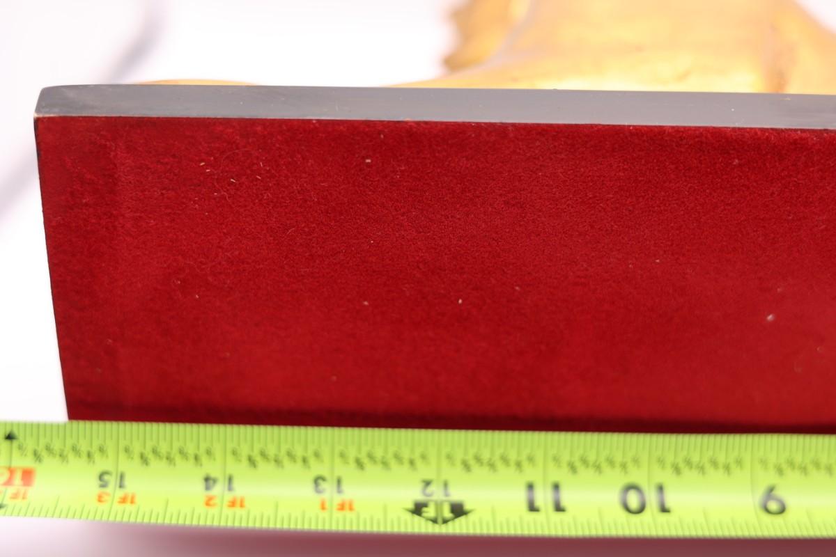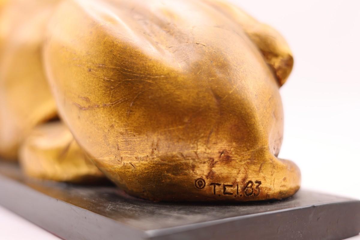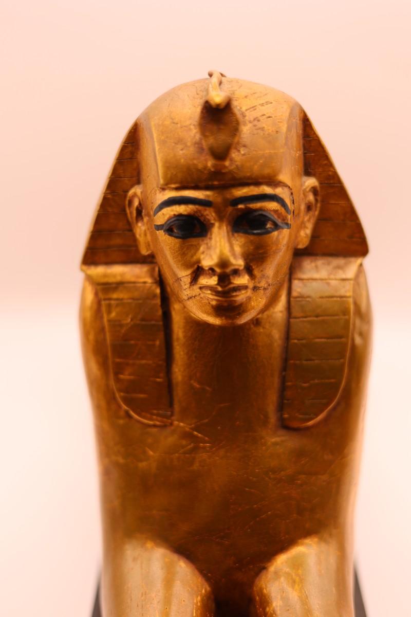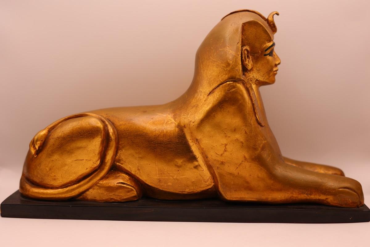 Decorative Egyptian-style sphinx figure with gilt finish on a rectangular base. Marked © T.E.I. ’83 on underside. See photos for details and condition.