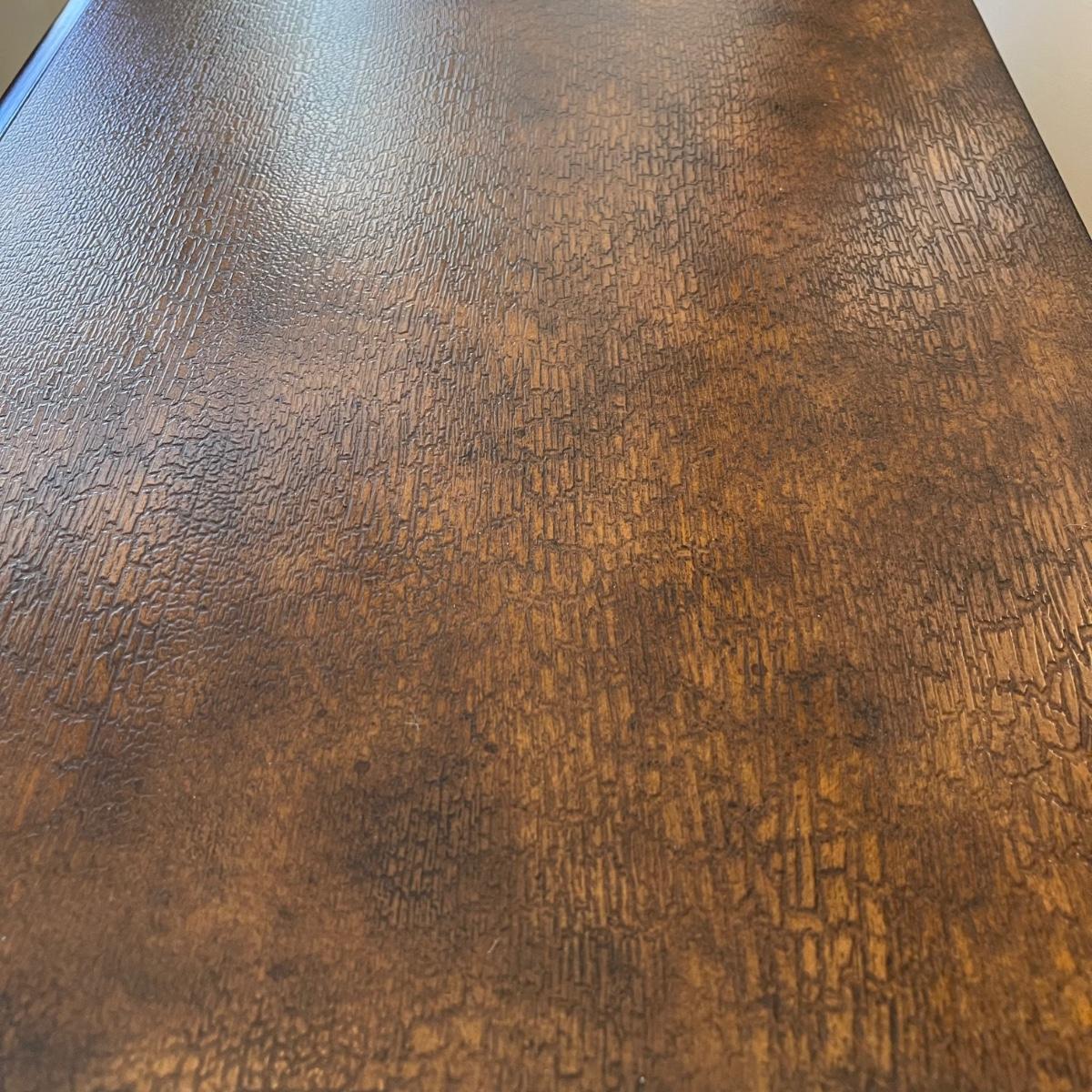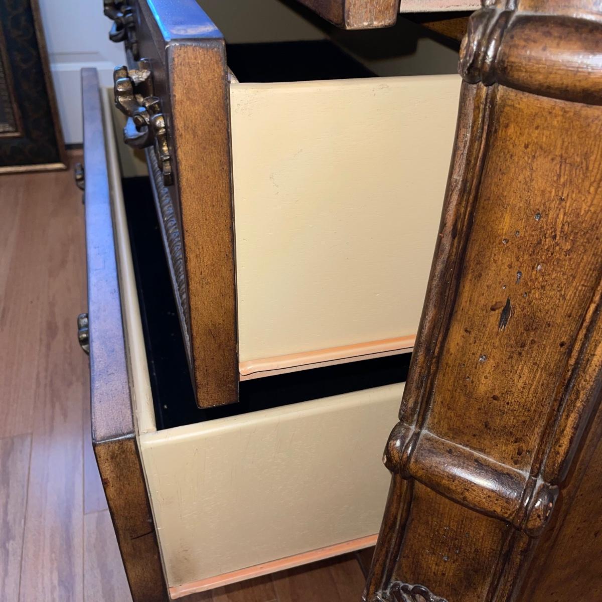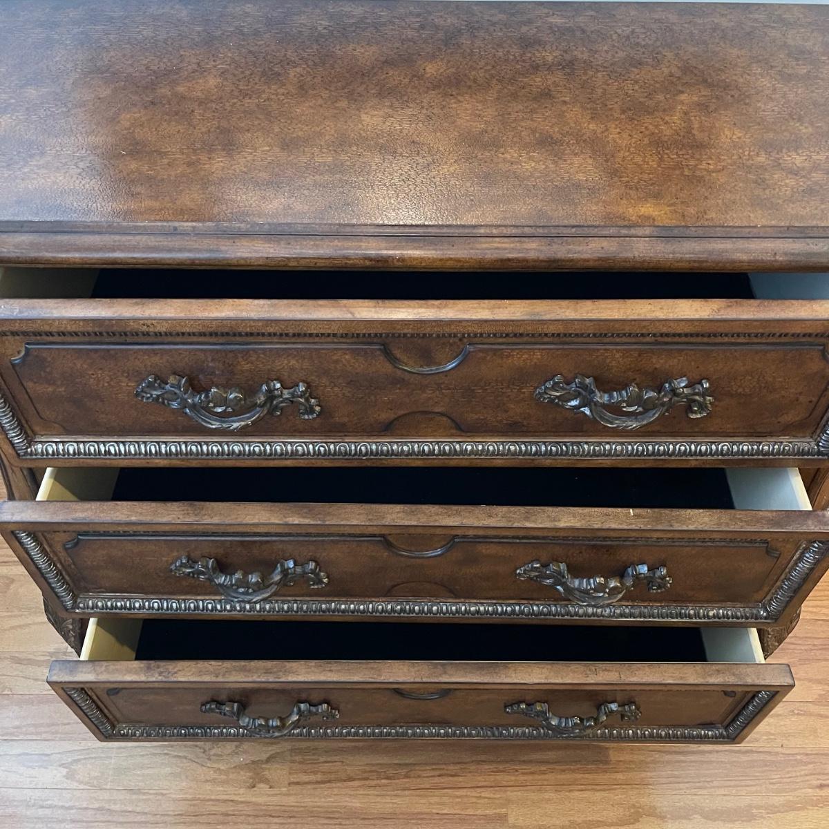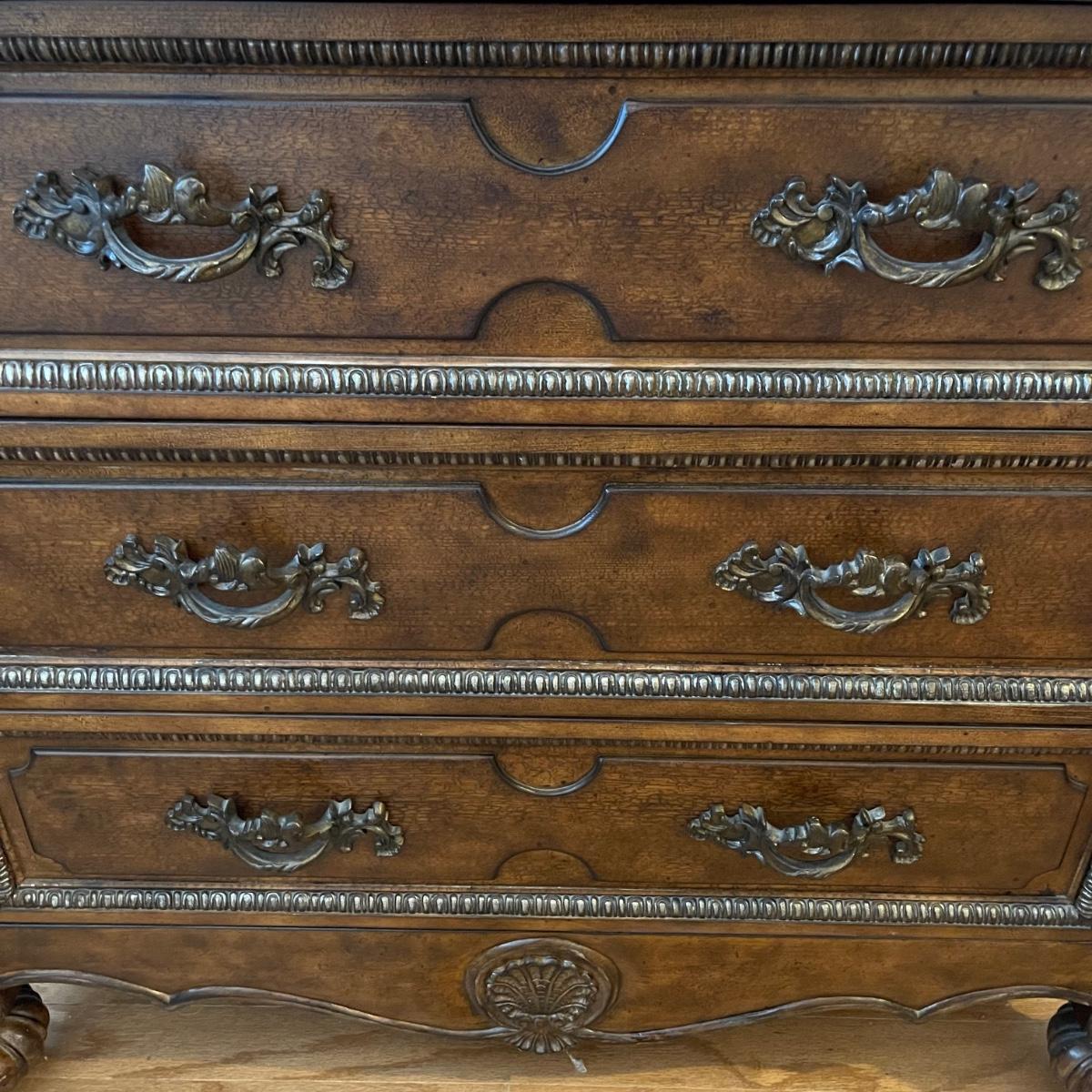 Large three drawer dresser with round feet wooden with decorative detailing. Made of solid wood with painted sides on the drawers, a veneer top and aged bronzed colored metal handles. It is about 48” x 21” x 38”. There is no noticeable brand name or signature on the back or inside the drawers.