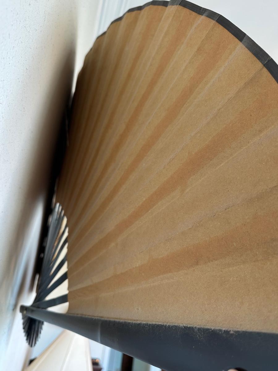 Large decorative folding wall fan featuring a gold-toned background with a hand-painted style landscape scene.