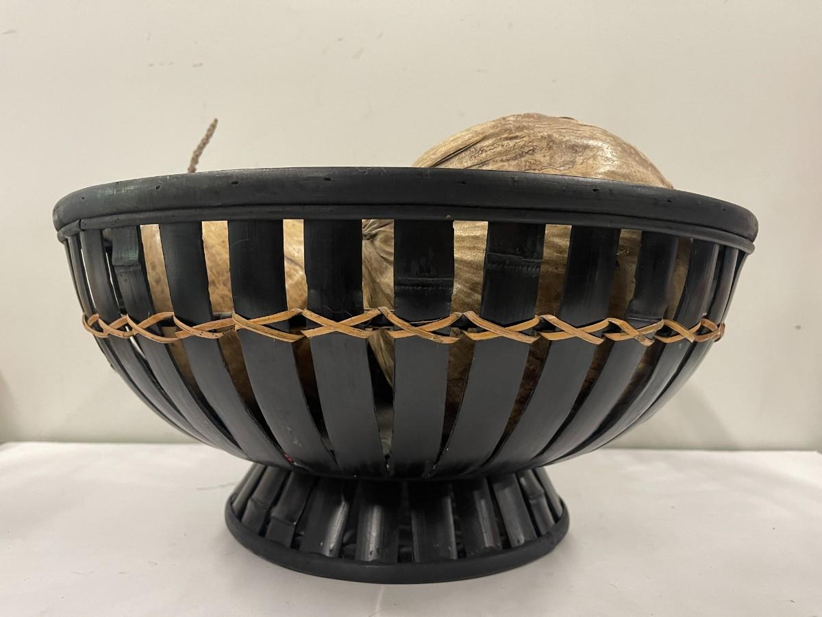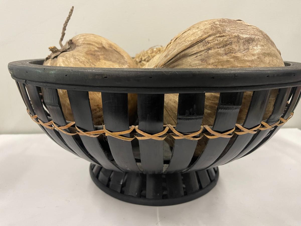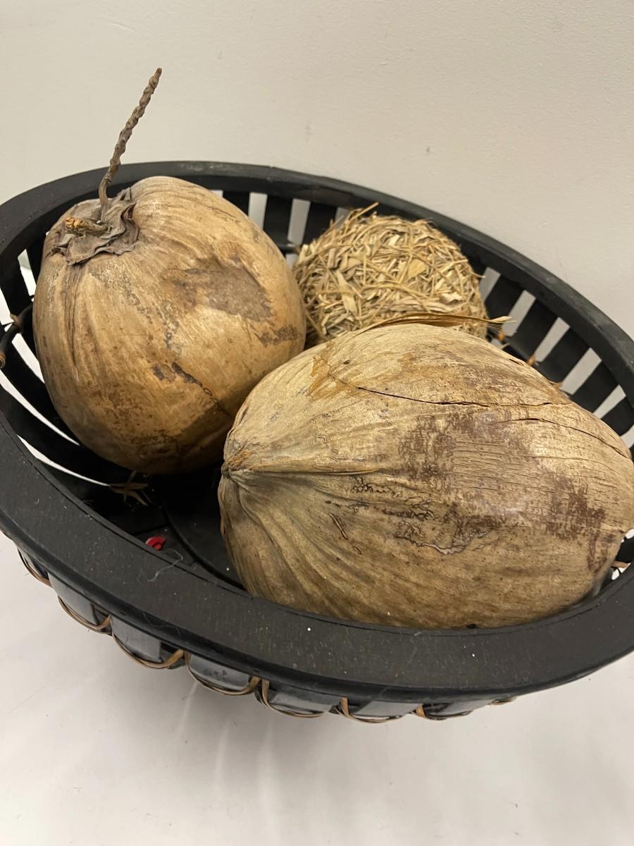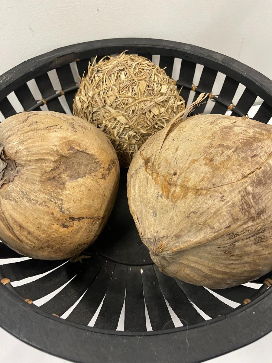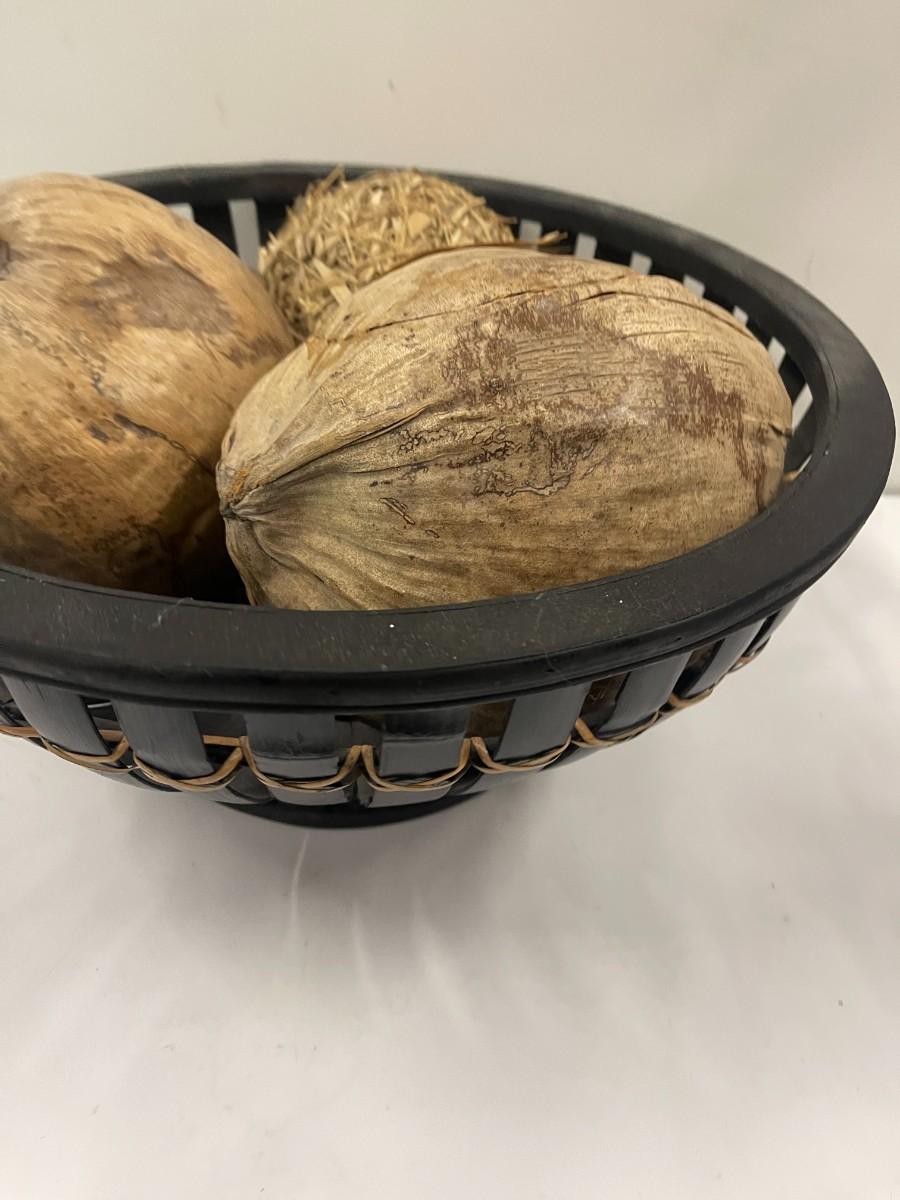 Large Decorative Wooden Bowl of Coconuts. 18" x 8"