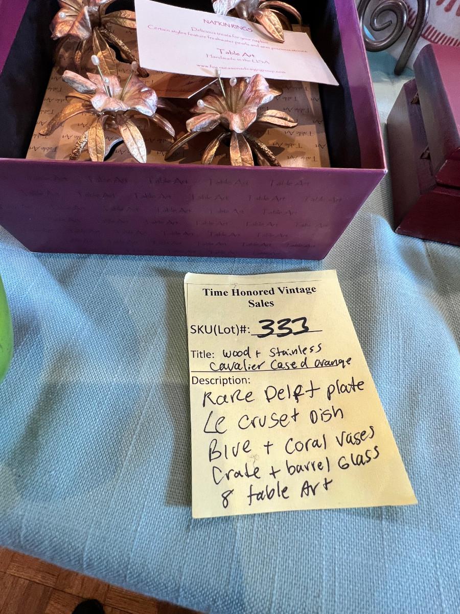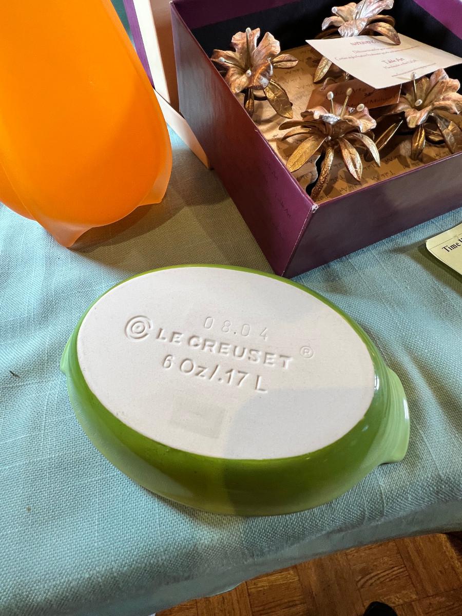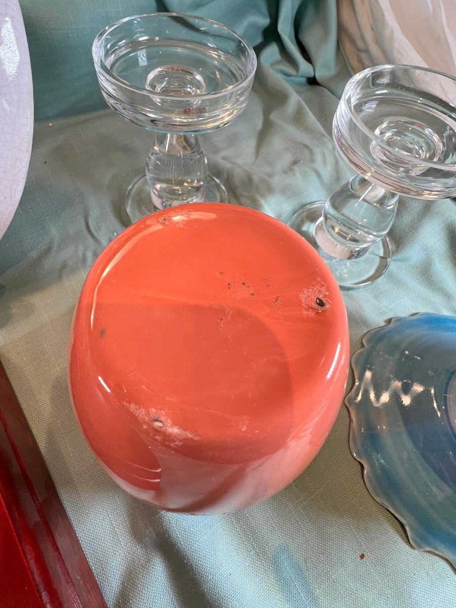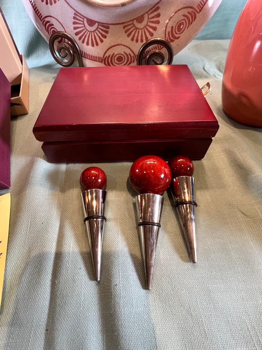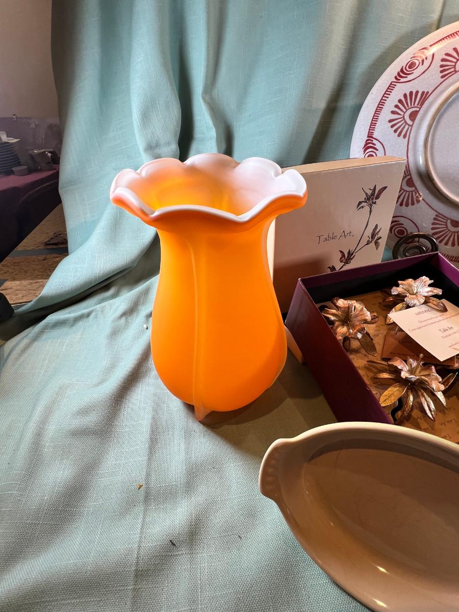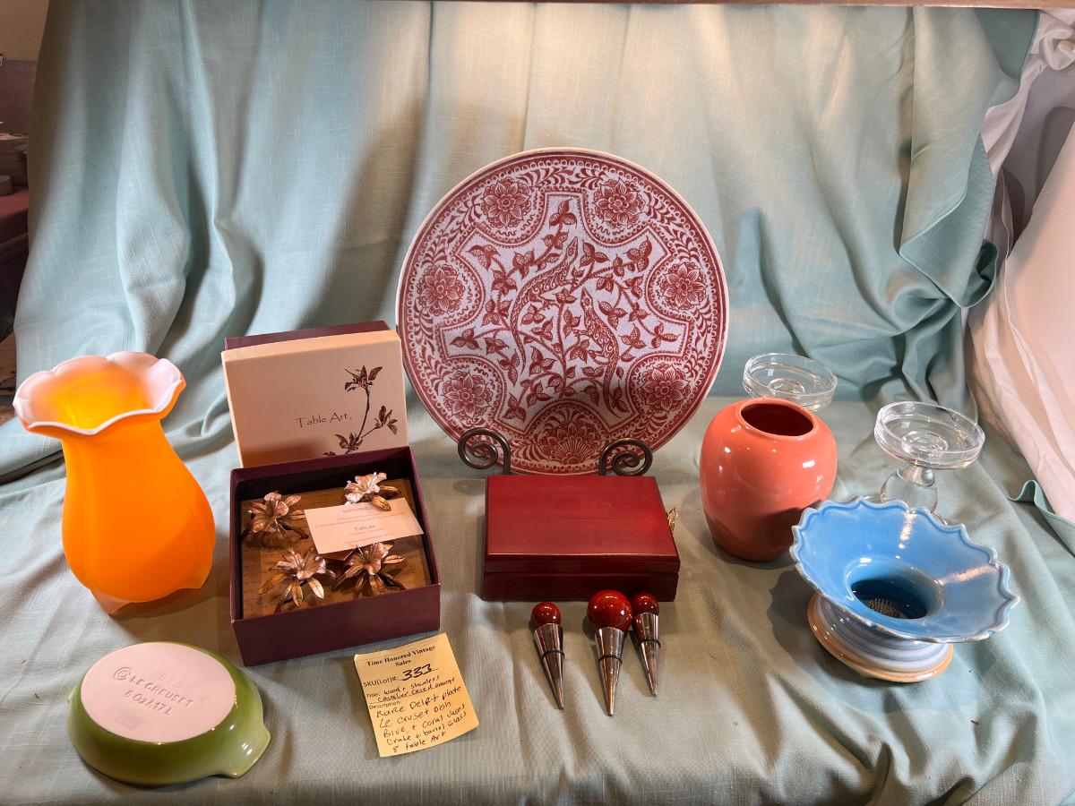 Wood Toppers bottle stoppers, Crate and barrel 2 Kronos Polish glass candle holders . Artisan made ceramic flower vase with frog, vintage orange ceramic vase, 2 new boxes of table art napkins rings. Cased glass orange vase, Le Cruset dish,