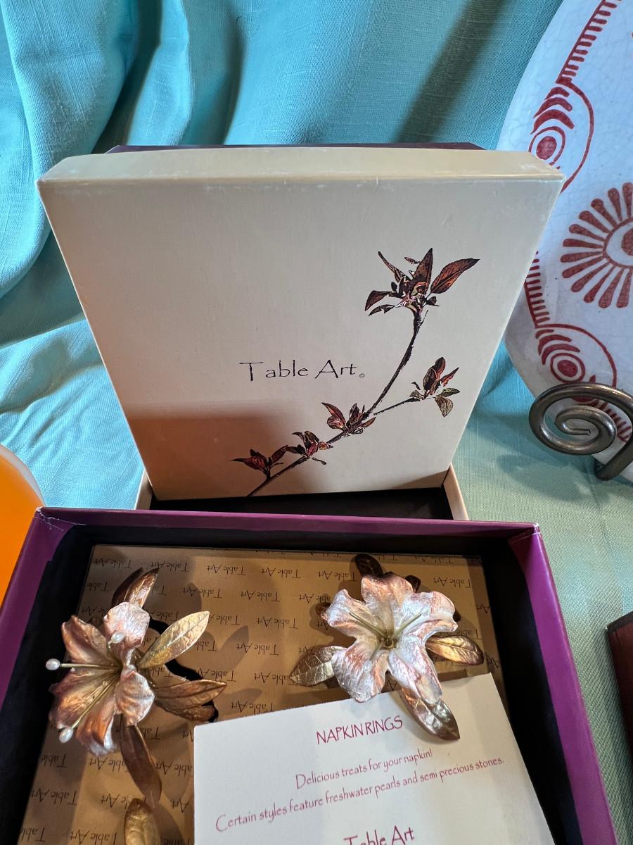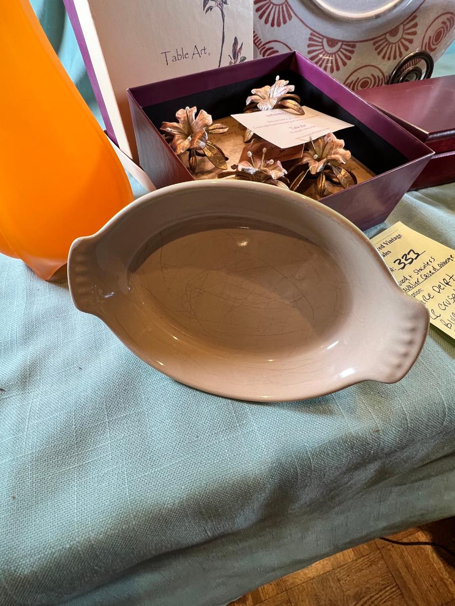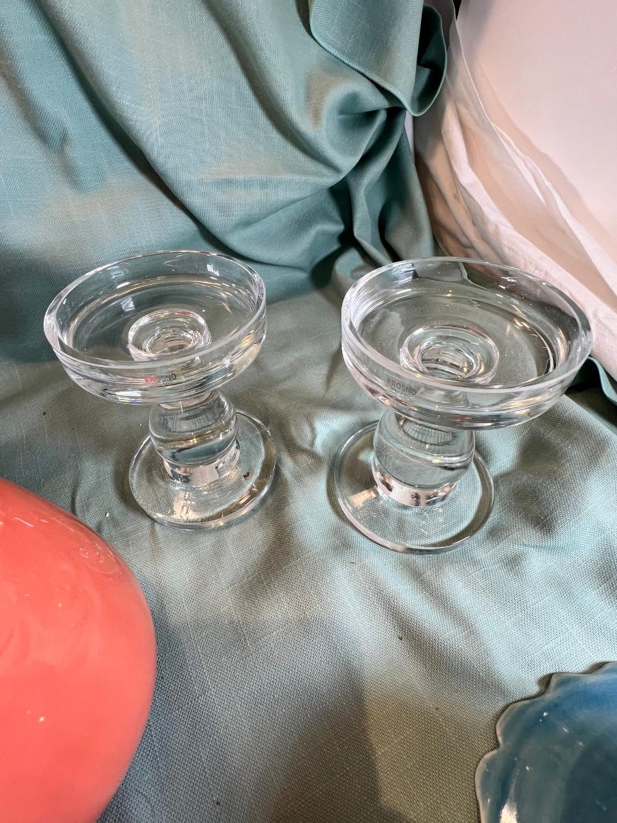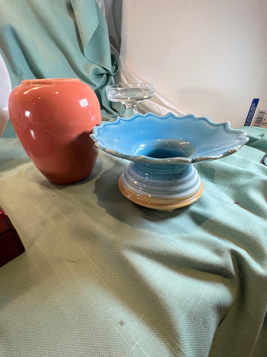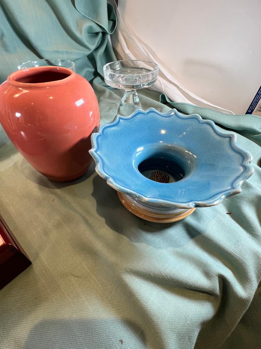 Wood Toppers bottle stoppers, Crate and barrel 2 Kronos Polish glass candle holders . Artisan made ceramic flower vase with frog, vintage orange ceramic vase, 2 new boxes of table art napkins rings. Cased glass orange vase, Le Cruset dish,