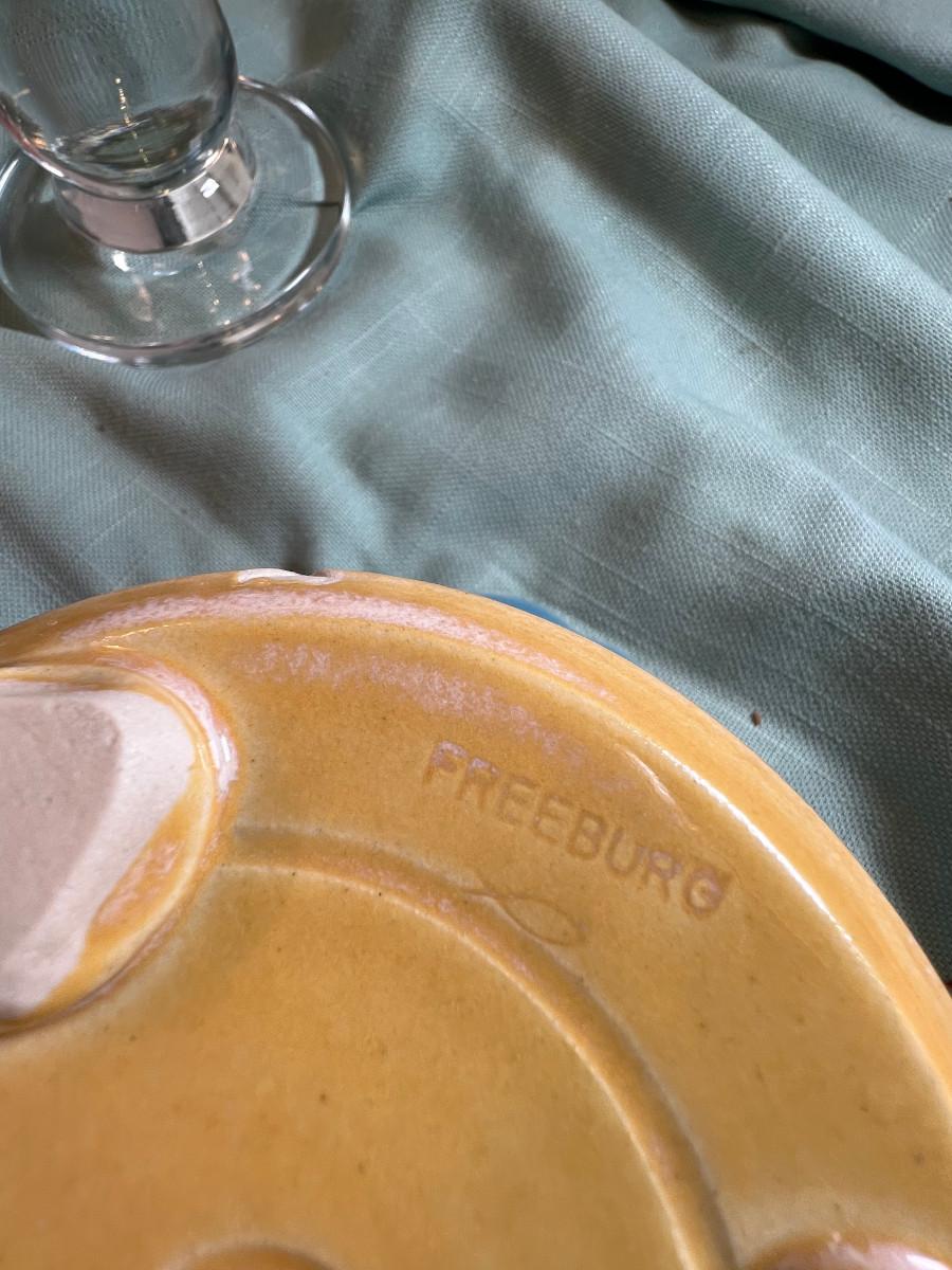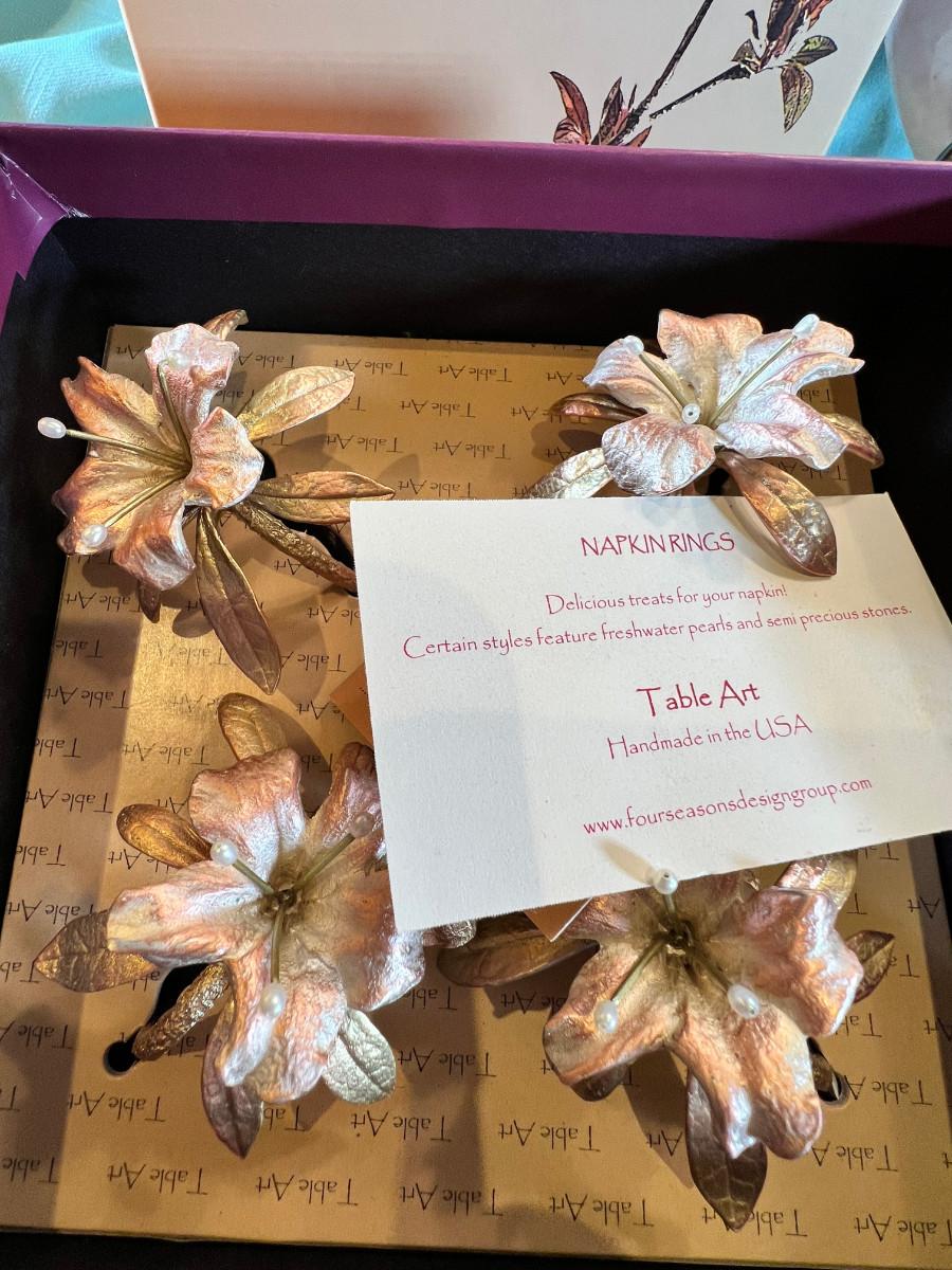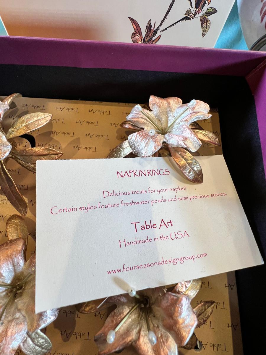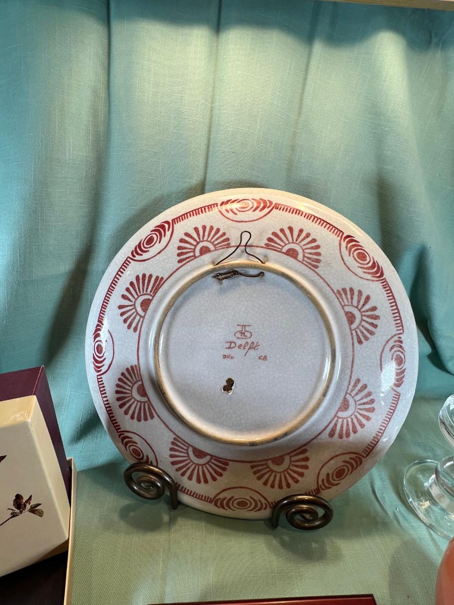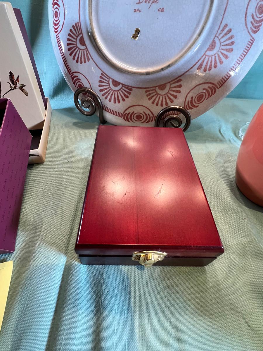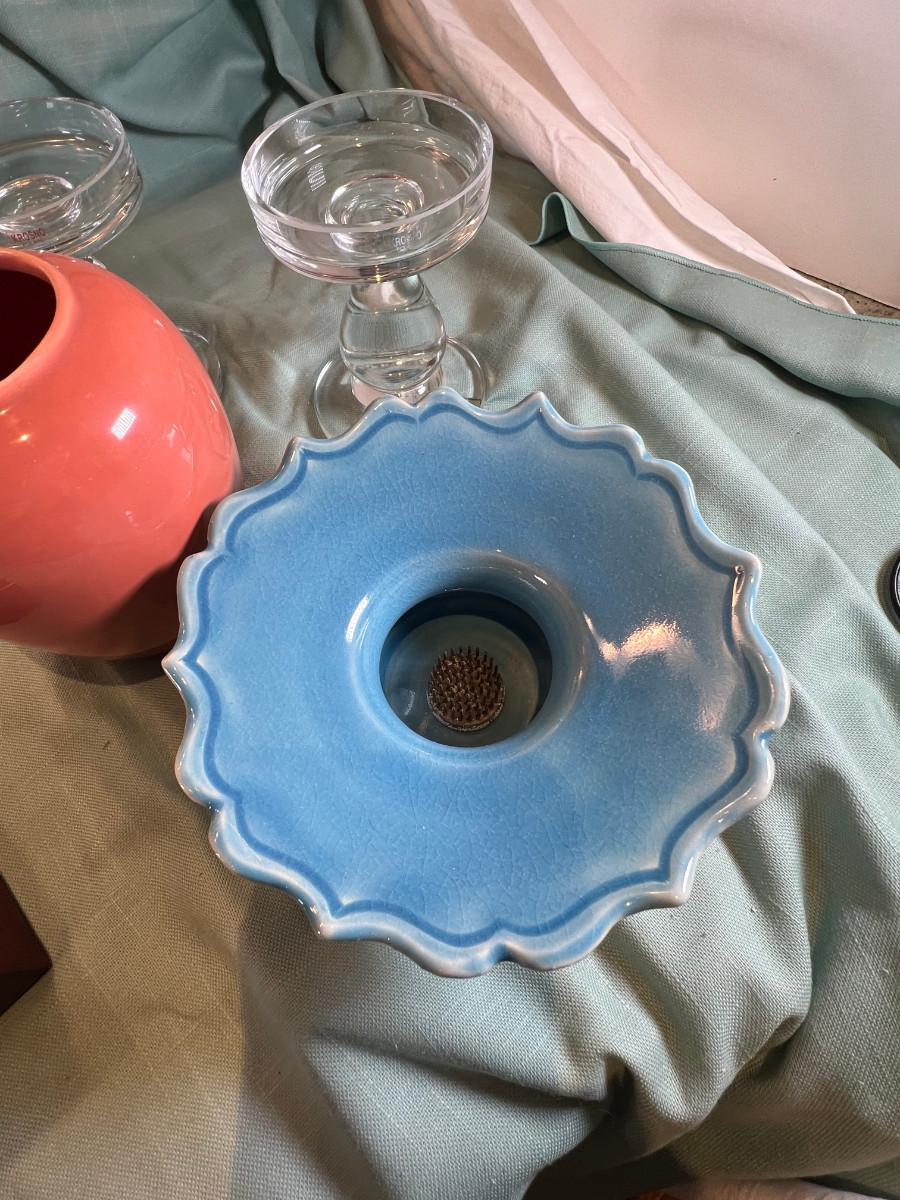 Wood Toppers bottle stoppers, Crate and barrel 2 Kronos Polish glass candle holders . Artisan made ceramic flower vase with frog, vintage orange ceramic vase, 2 new boxes of table art napkins rings. Cased glass orange vase, Le Cruset dish,