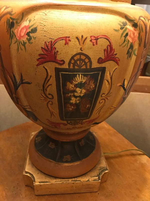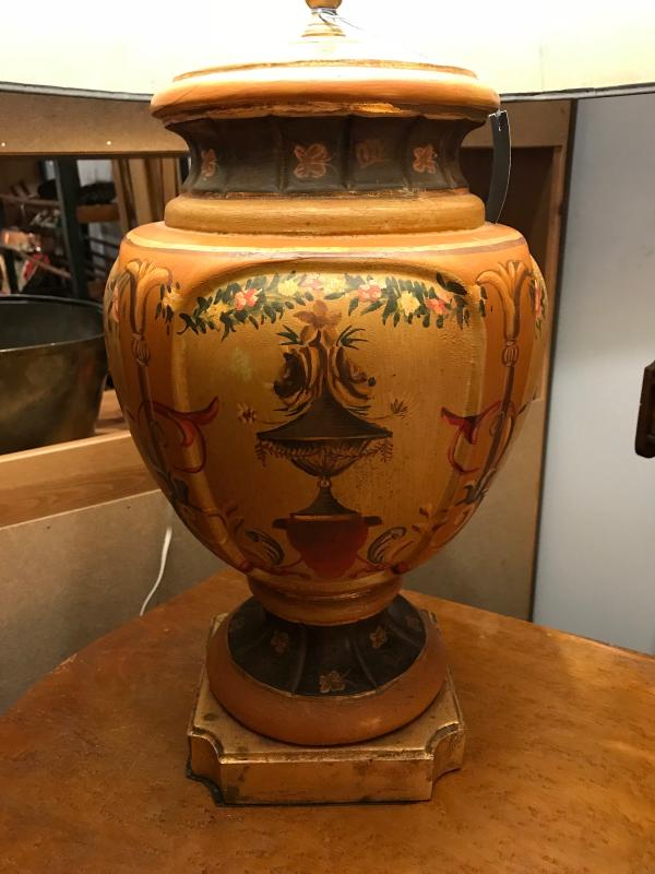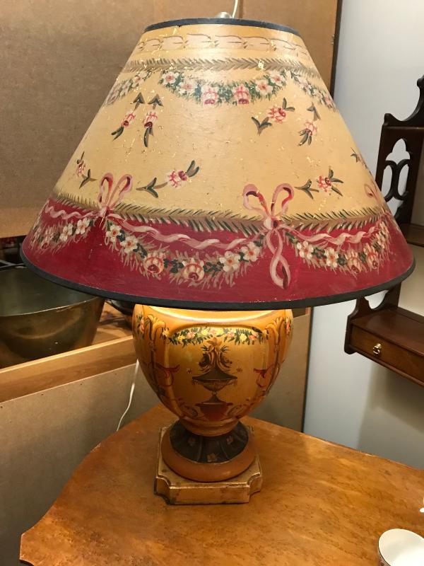 Very nice and unique all hand painted designer pottery urn lamp with hand painted shade. Elaborately painted with scrolls, urns, flowers, ribbons, etc. in shades of gold, reds, greens, creams, pinks, etc. with gilt trim. Great condition. Shade has nice aging that allows dappled light to penetrate the solid shade. 21" d shade x 29" H to finial.